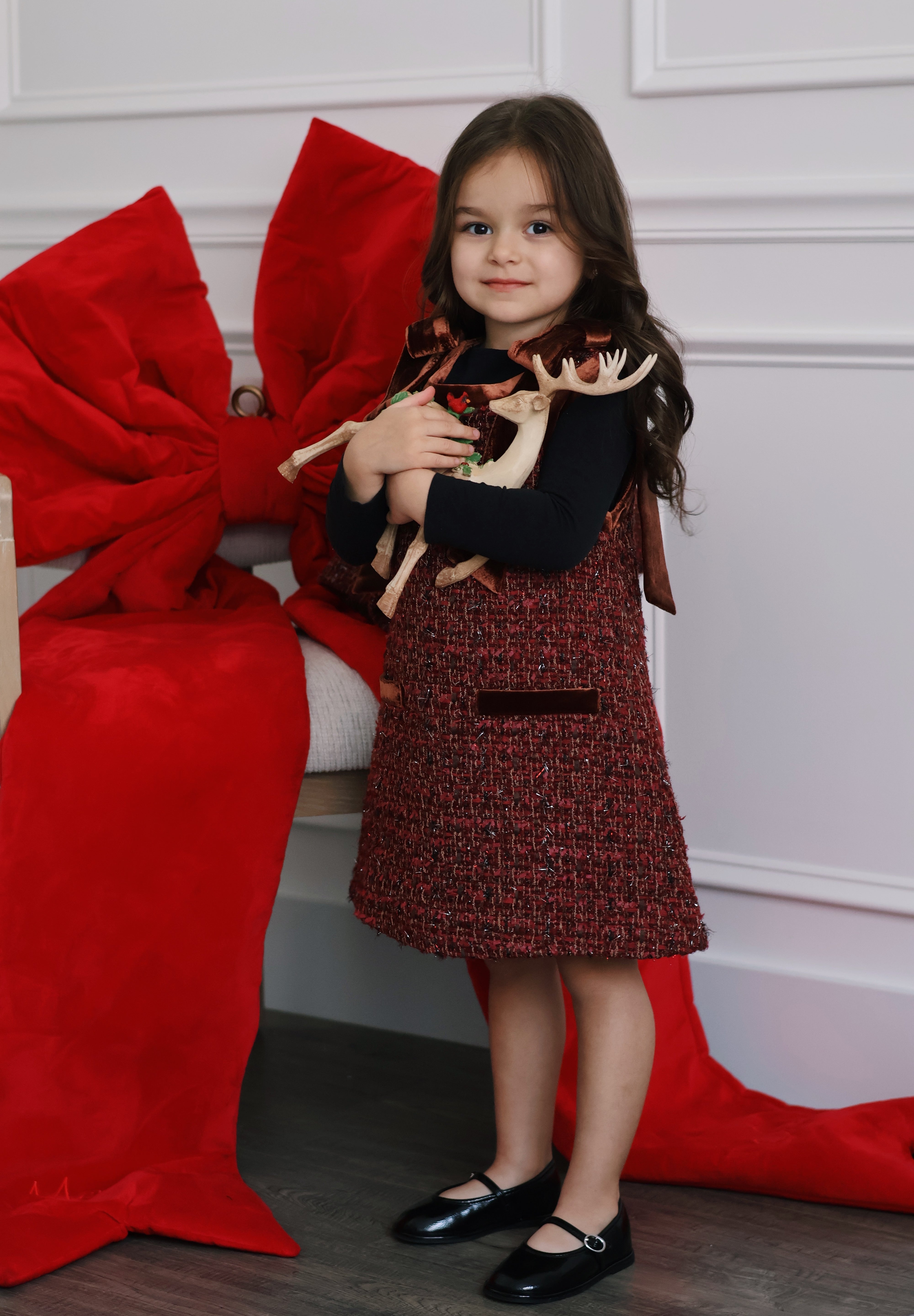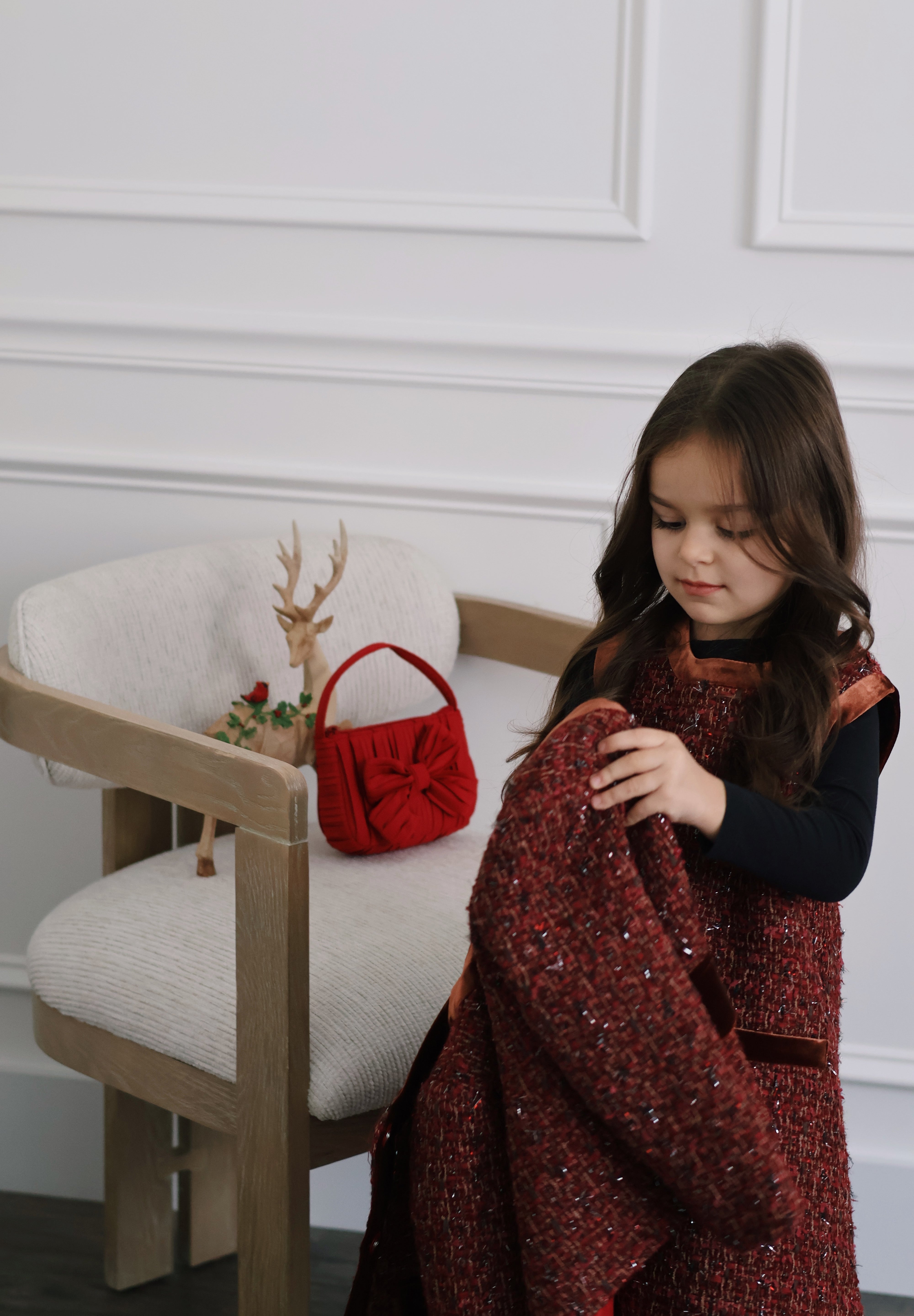 A darling burgundy red tweed dress for young girls. Featuring a velvet-lined collar, pockets, and sleeves, and detachable velvet bows that gracefully drape over her shoulders.
