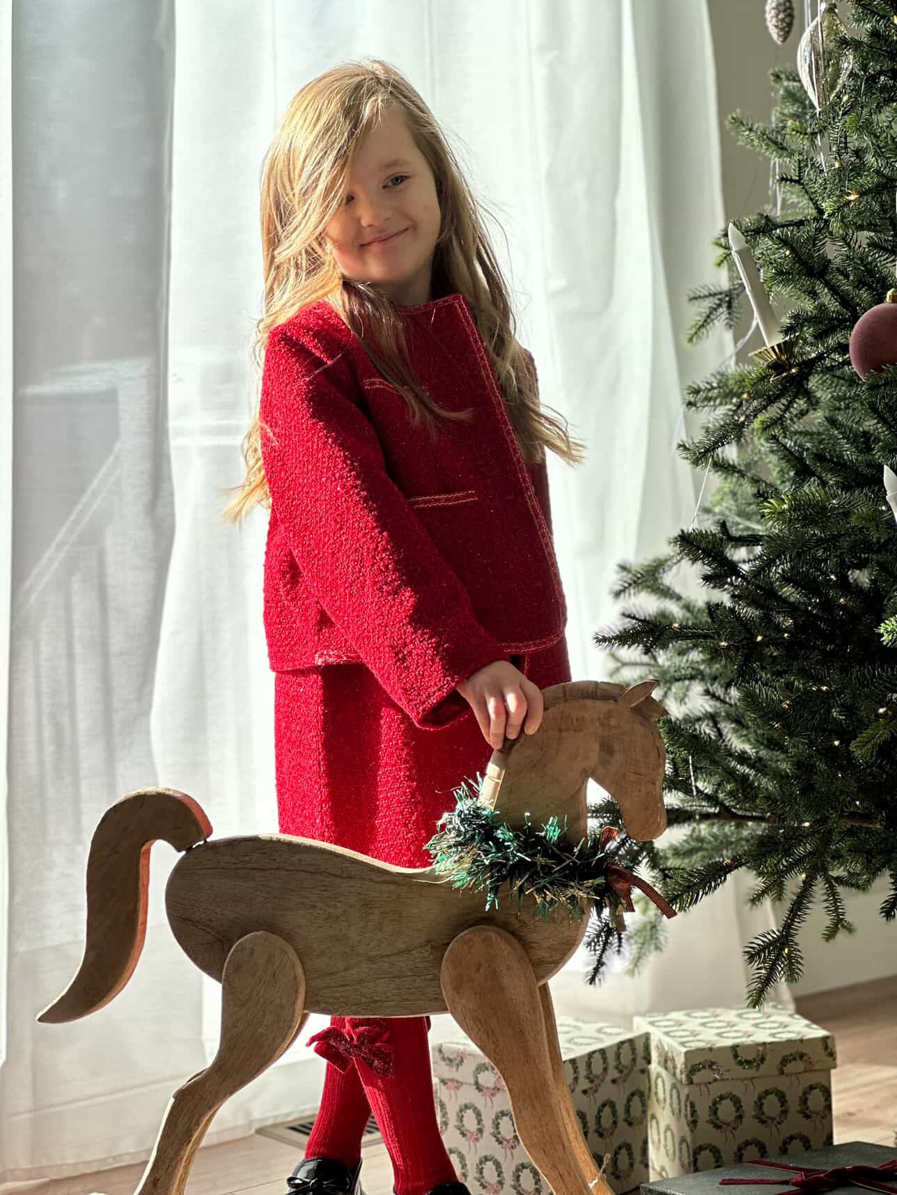 This stunning tweed jacket for girls features a vibrant cranberry hue intertwined with shimmering champagne gold threads, creating a dazzling and eye-catching look.