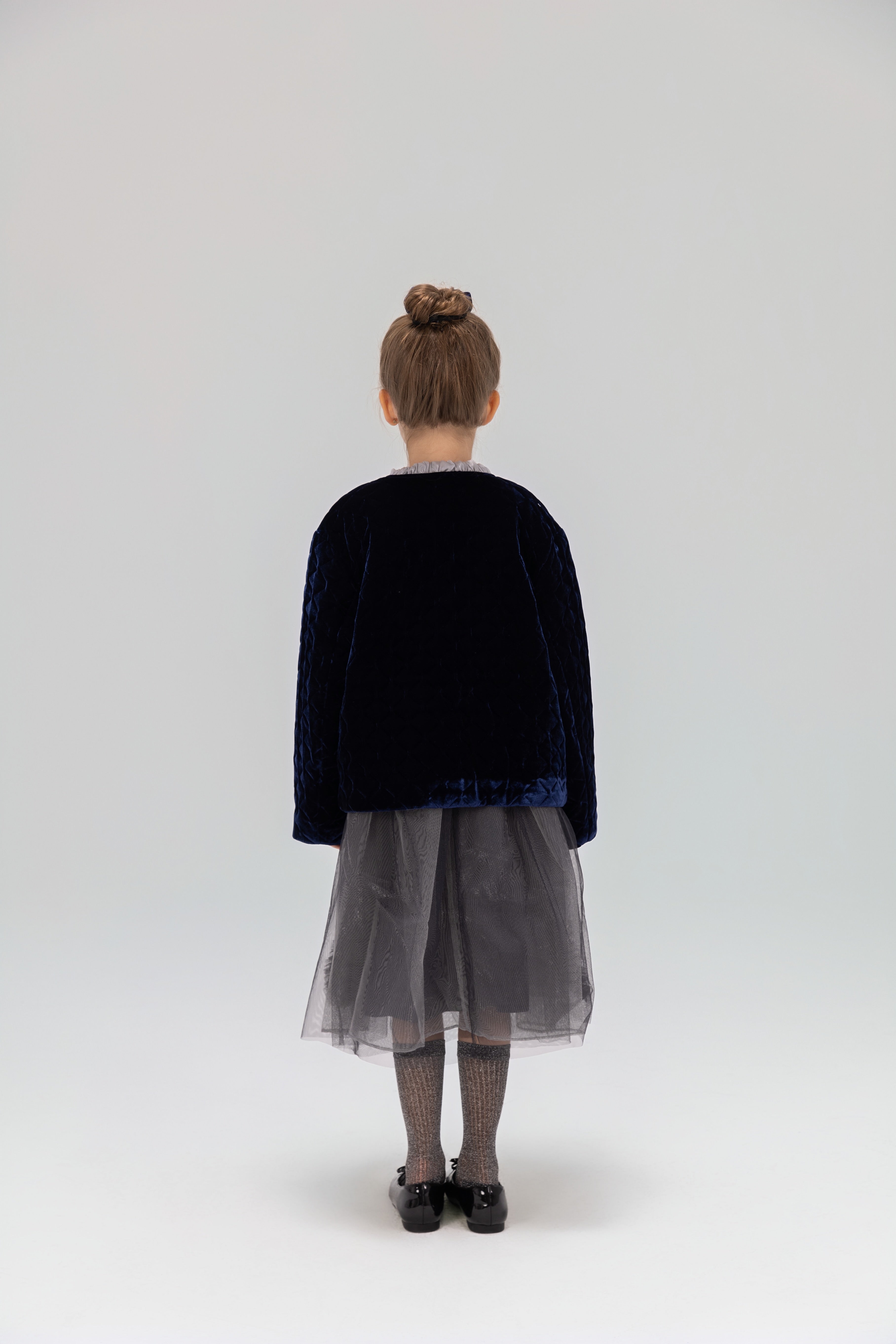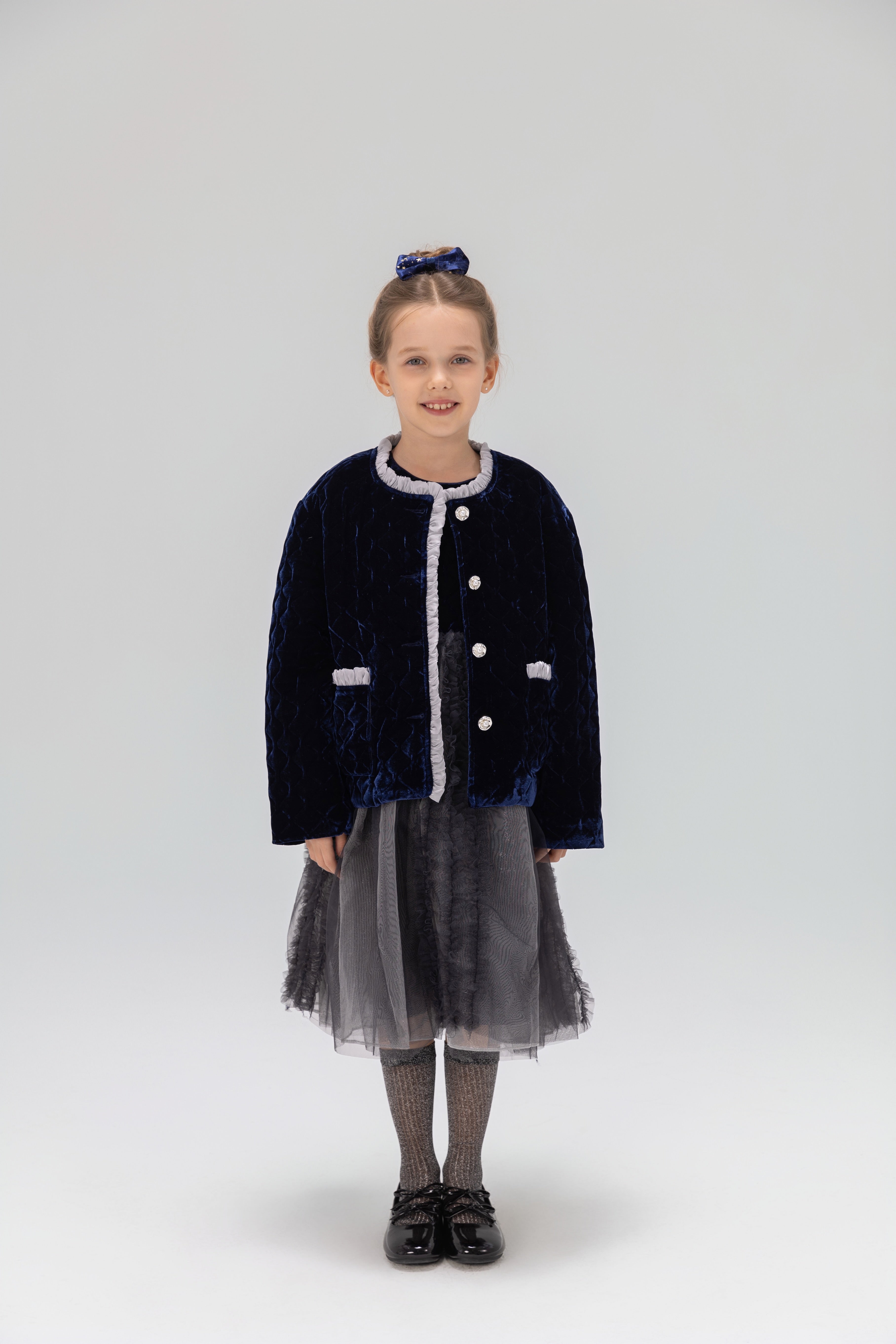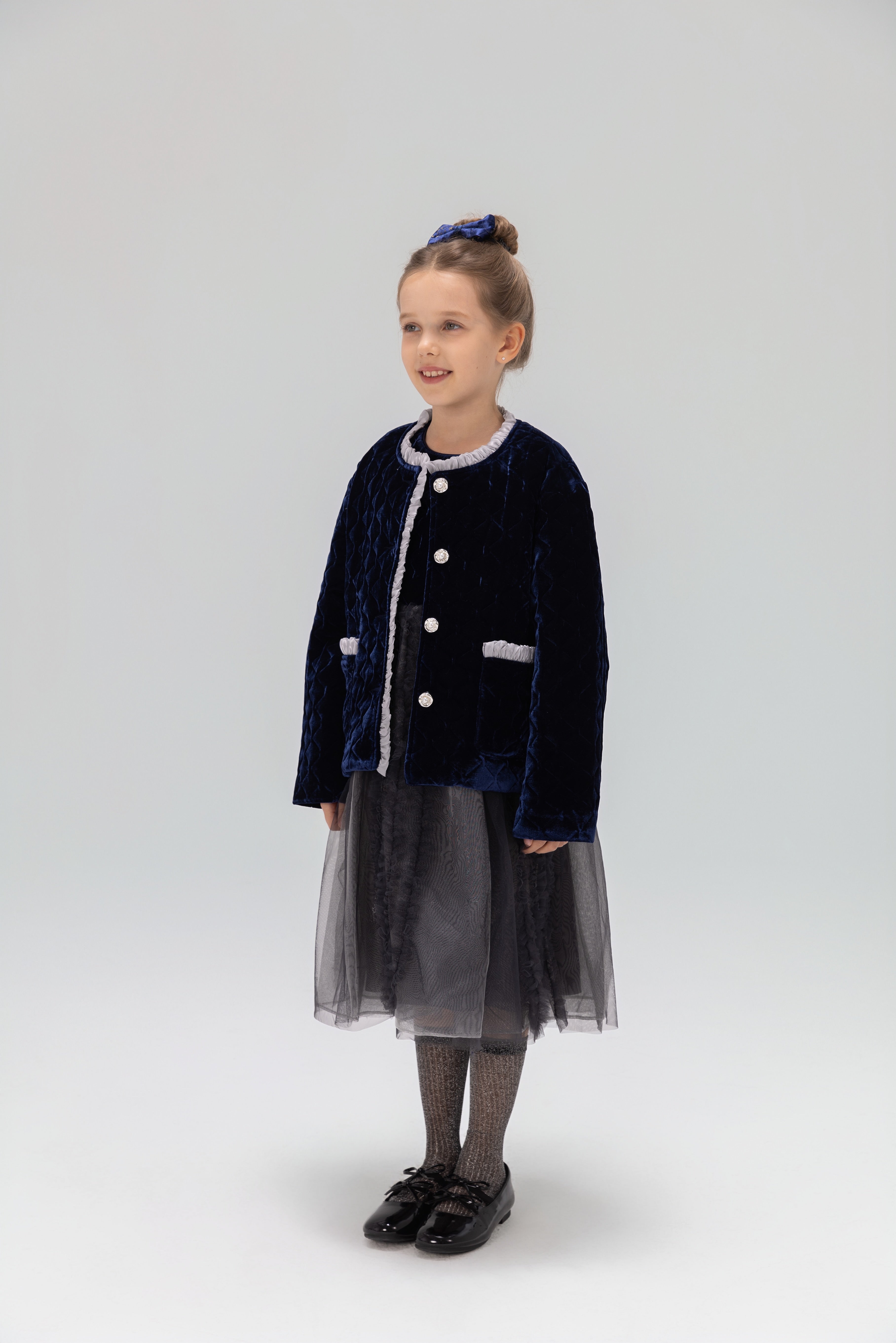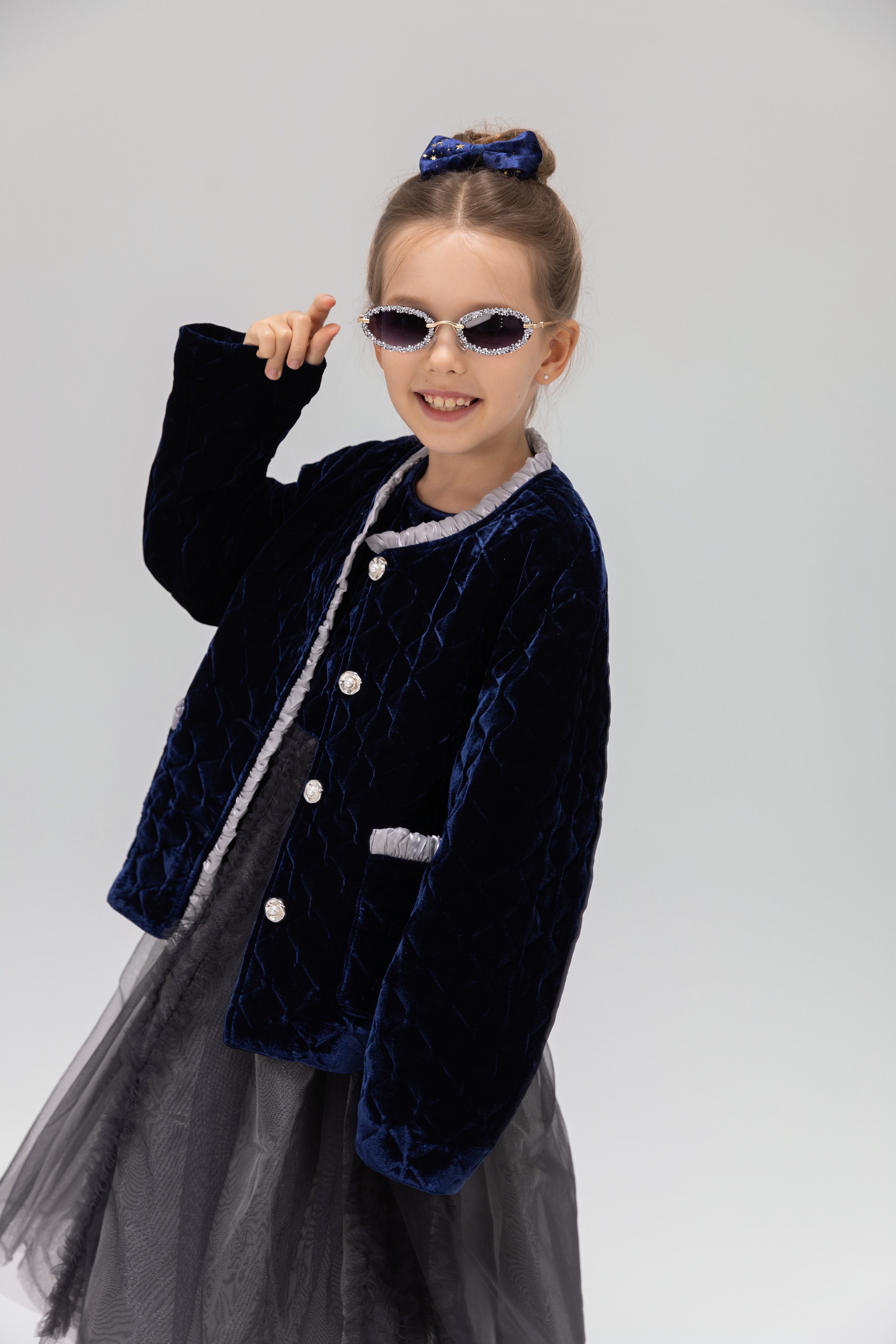 This sapphire blue velvet jacket for girls exudes timeless elegance and cozy comfort. Lightly padded and lined with silky smooth fabric, it provides warmth while remaining breathable.