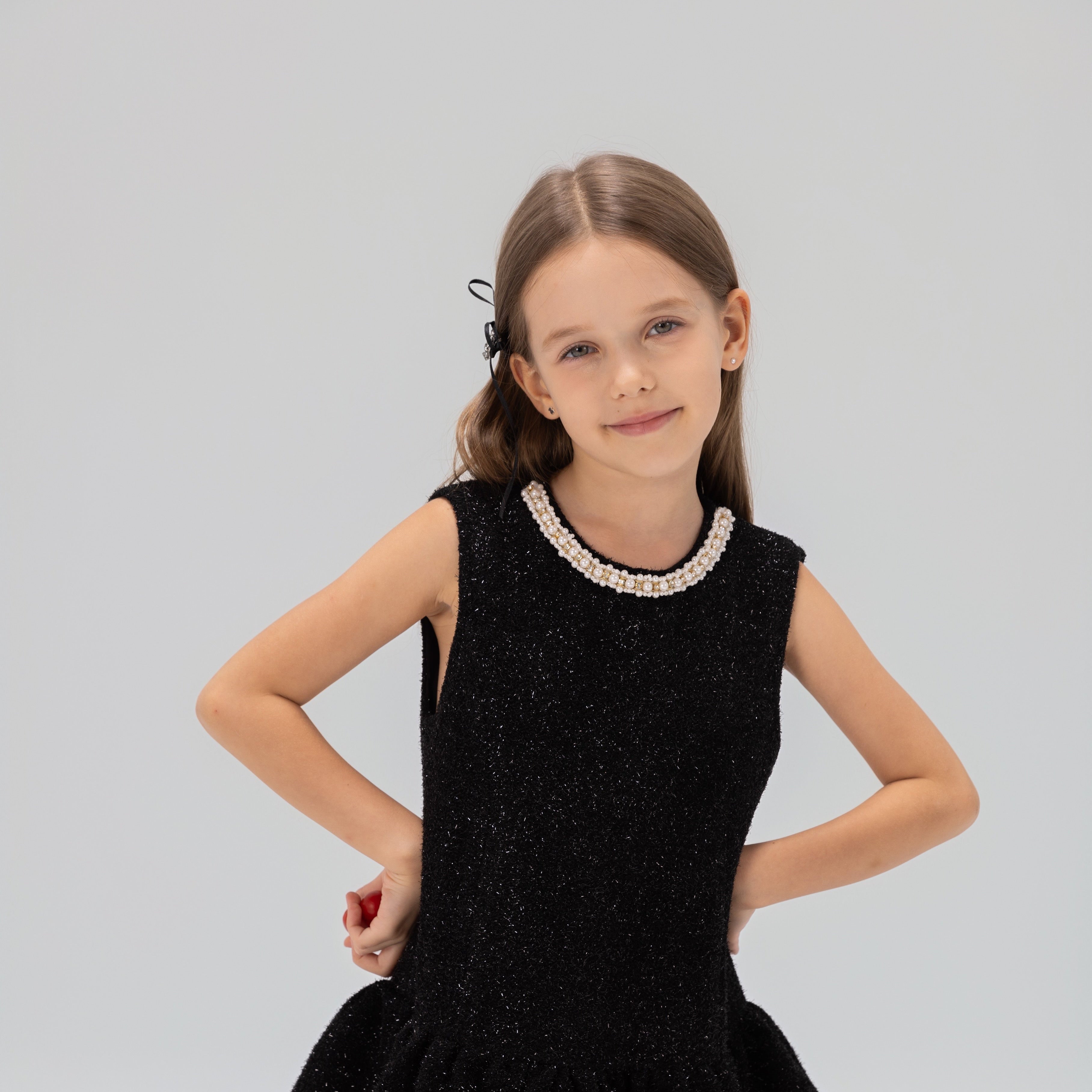 Show-stealing and photo ready. This girls black party dress shimmers with allover silver sparkle and a hand-beaded pearl and rhinestone collar that looks like a built-in necklace. Perfect for New Y...