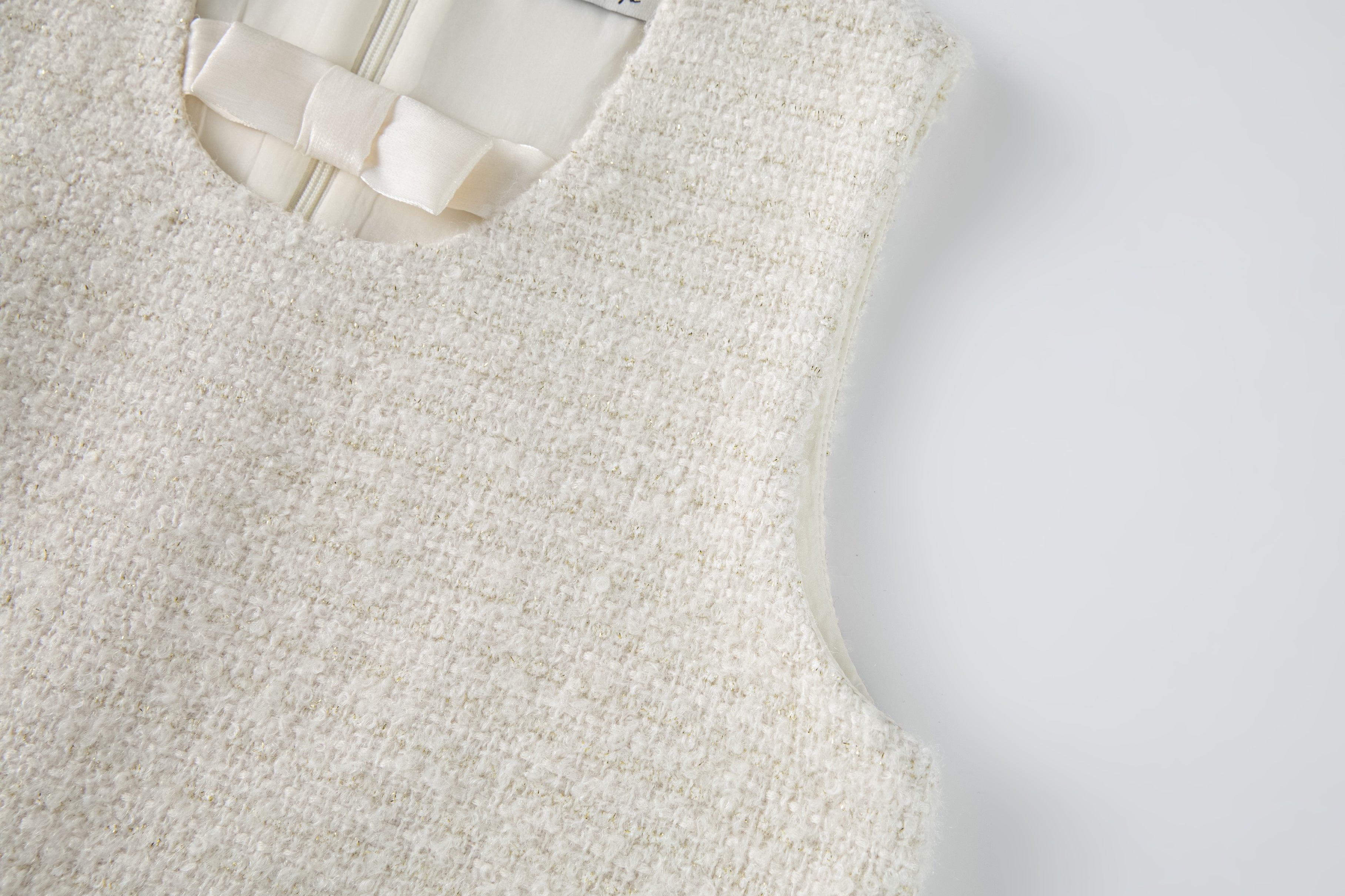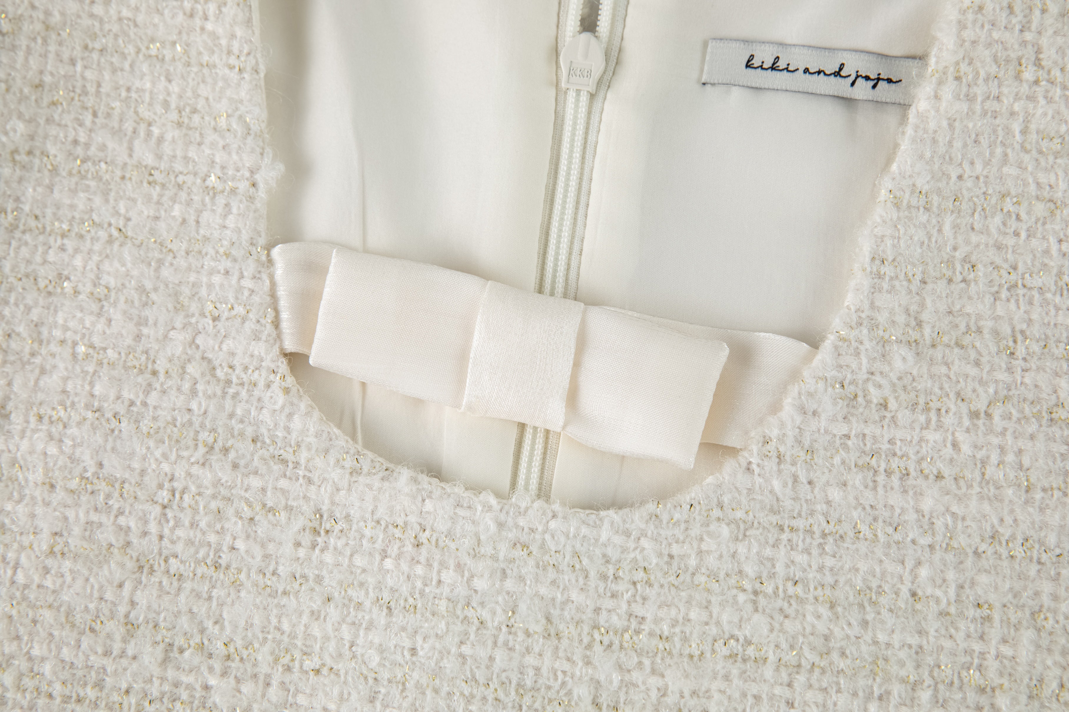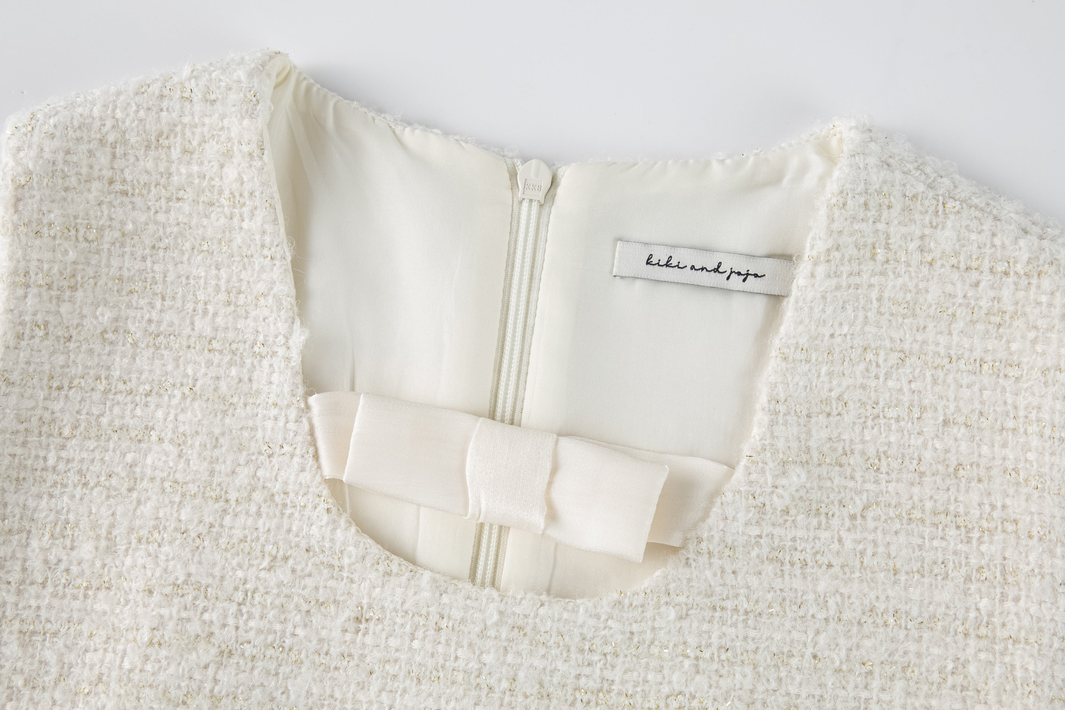 Glow-worthy and picture ready. This girls tweed shift in refined ivory is woven with gilded threads for a soft sparkle that shines at holiday galas, New Year moments, portraits, and elegant birthdays. A petite front keyhole framed by a tailored satin bow adds a sweet, polished finish.