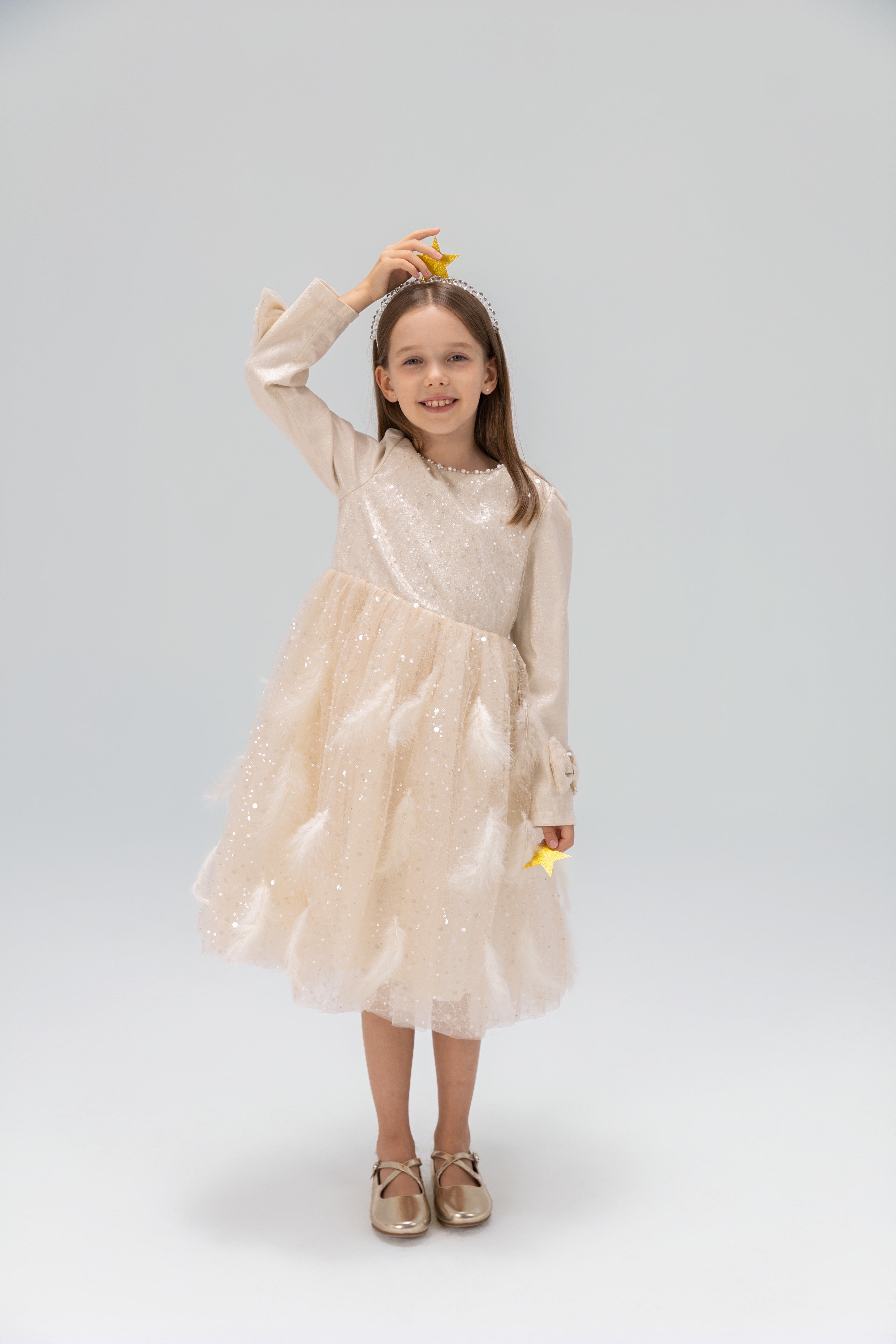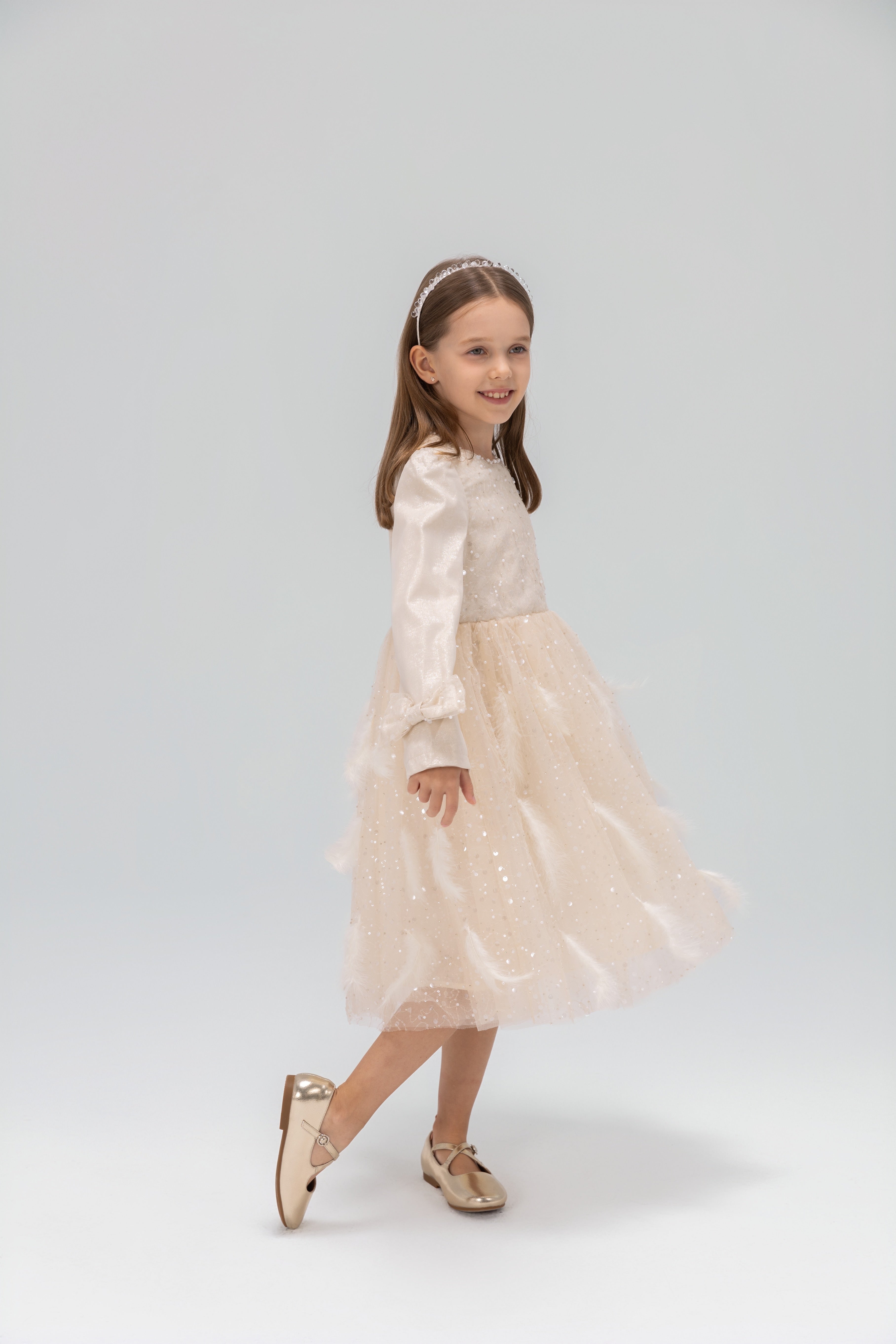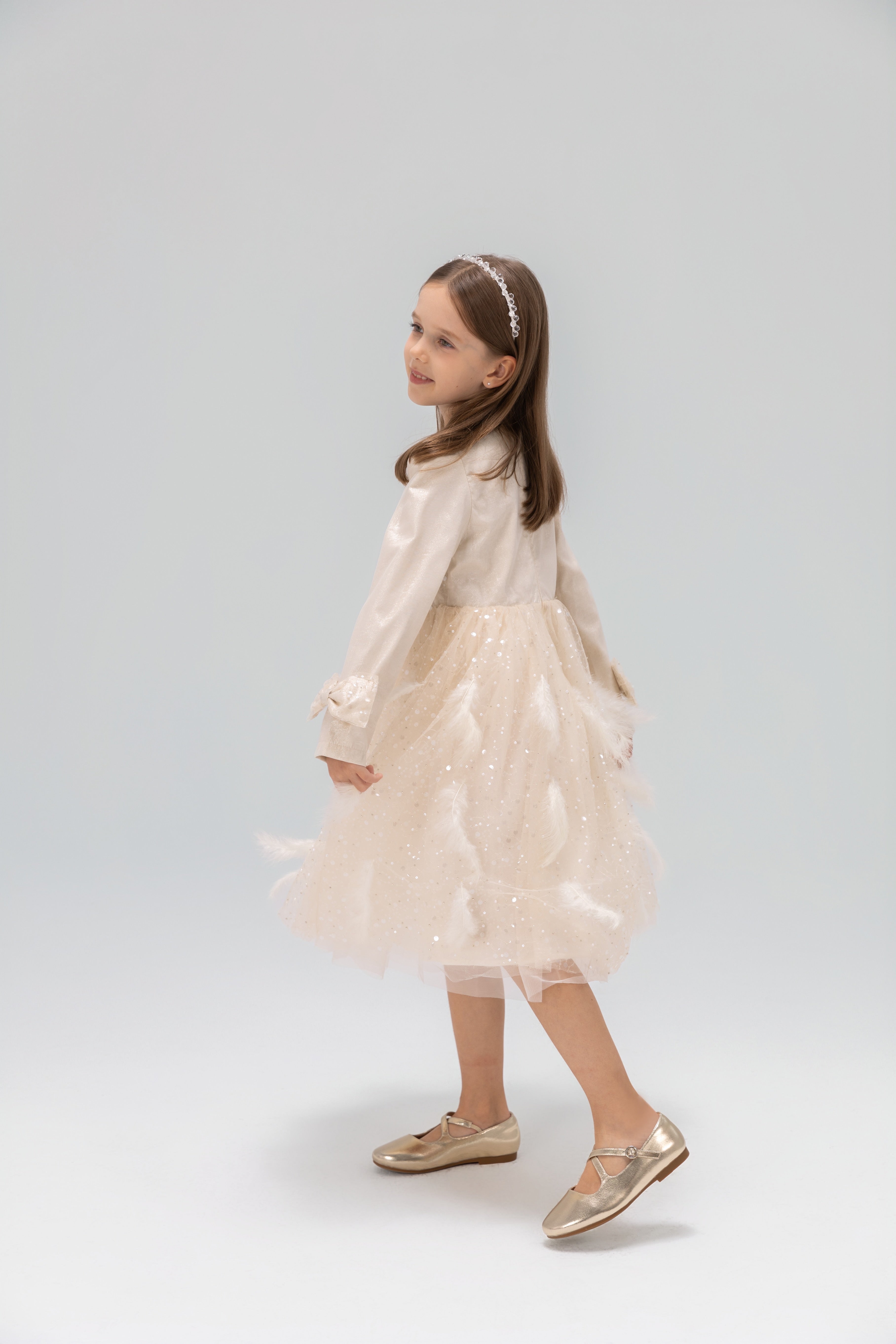 Ethereal and picture ready. This long-sleeve tulle dress in light ivory shimmers softly, pairing pearl-kissed details with feather accents for a fairytale finish.