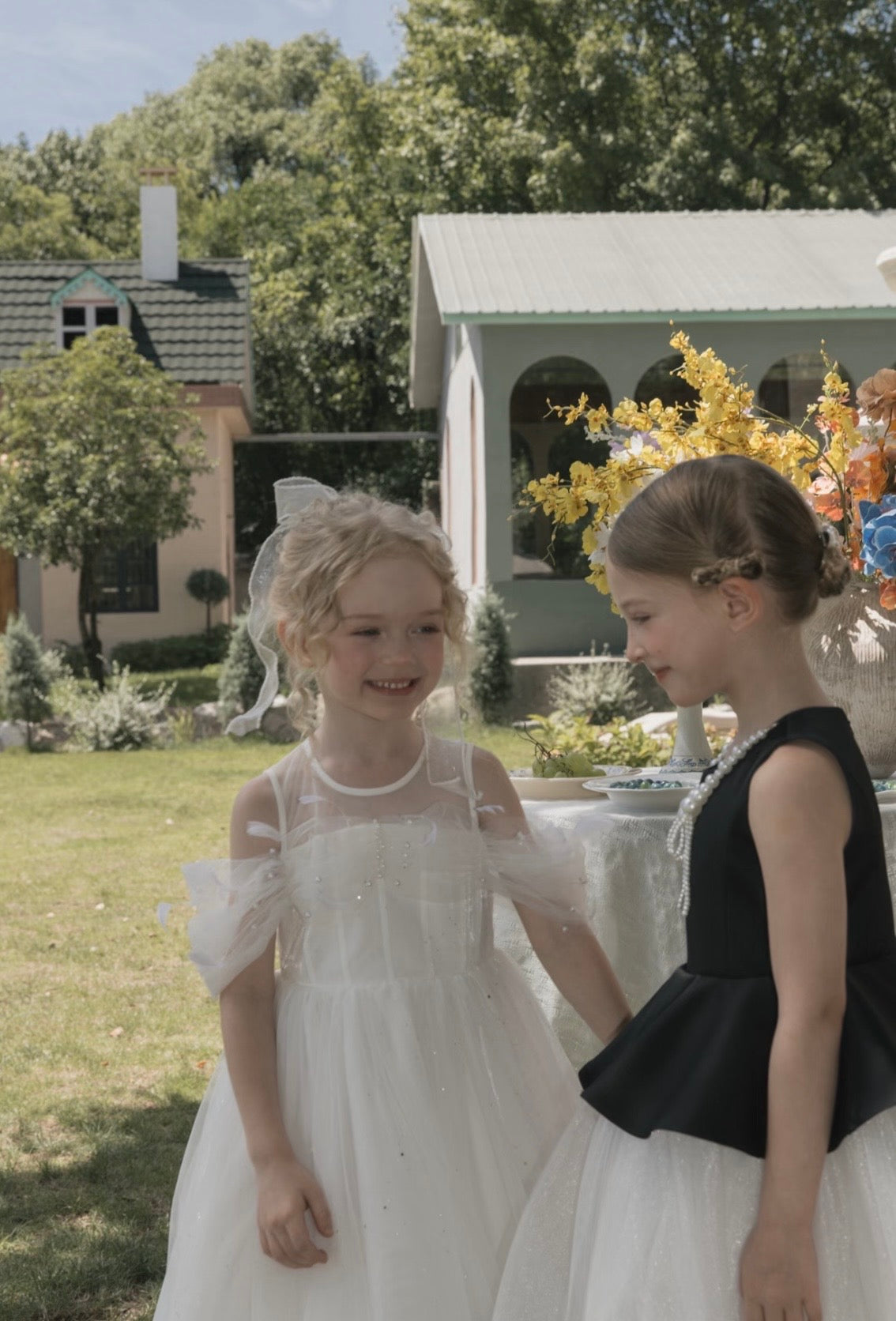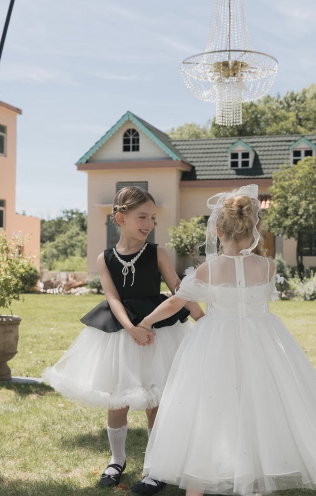 A timeless party dress inspired by classic couture silhouettes. The structured black bodice is elegantly adorned with a delicate pearl bow neckline, while the voluminous ivory tulle skirt adds a soft, airy contrast with graceful movement — an elegant occasion dress for formal celebrations and holiday gatherings.