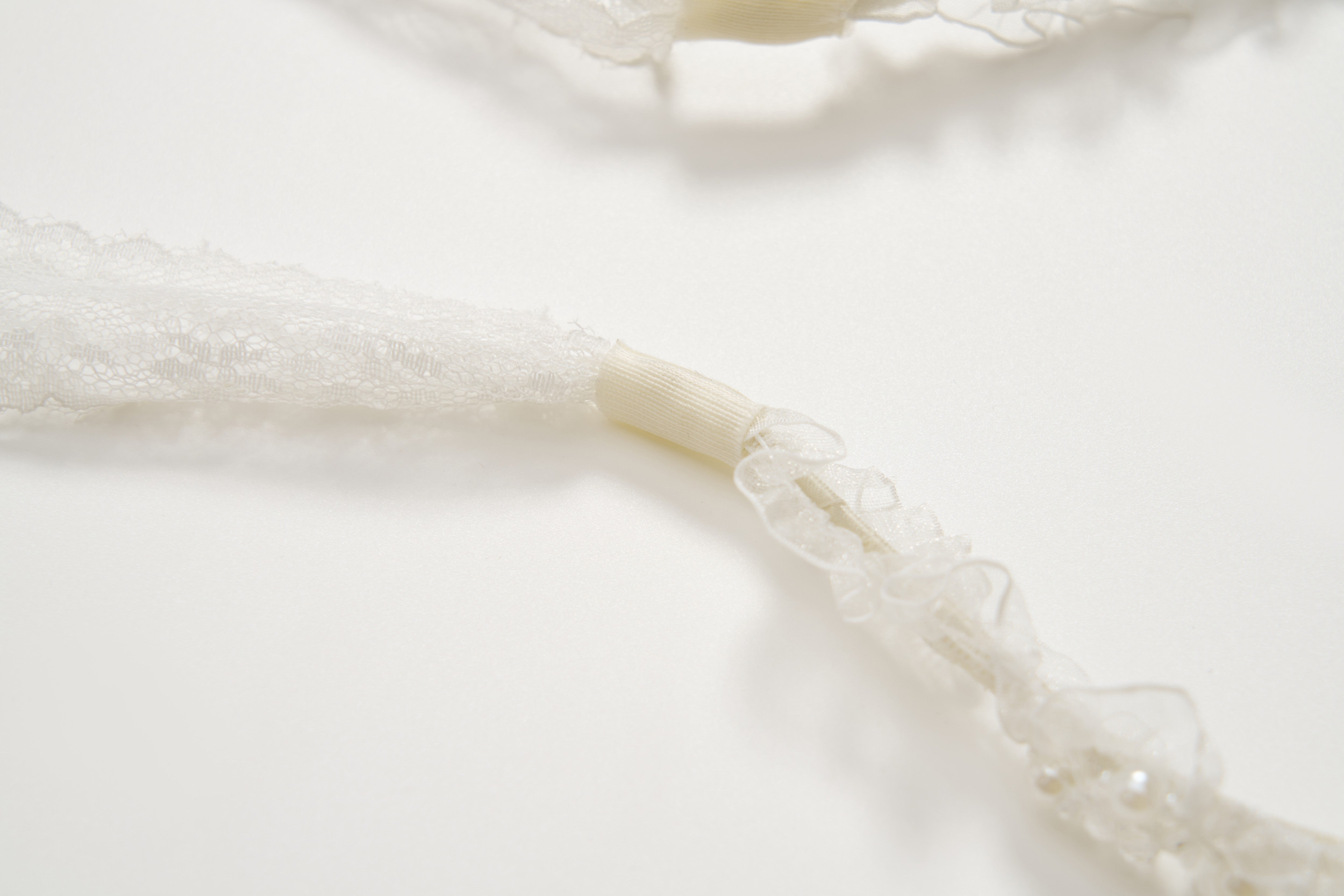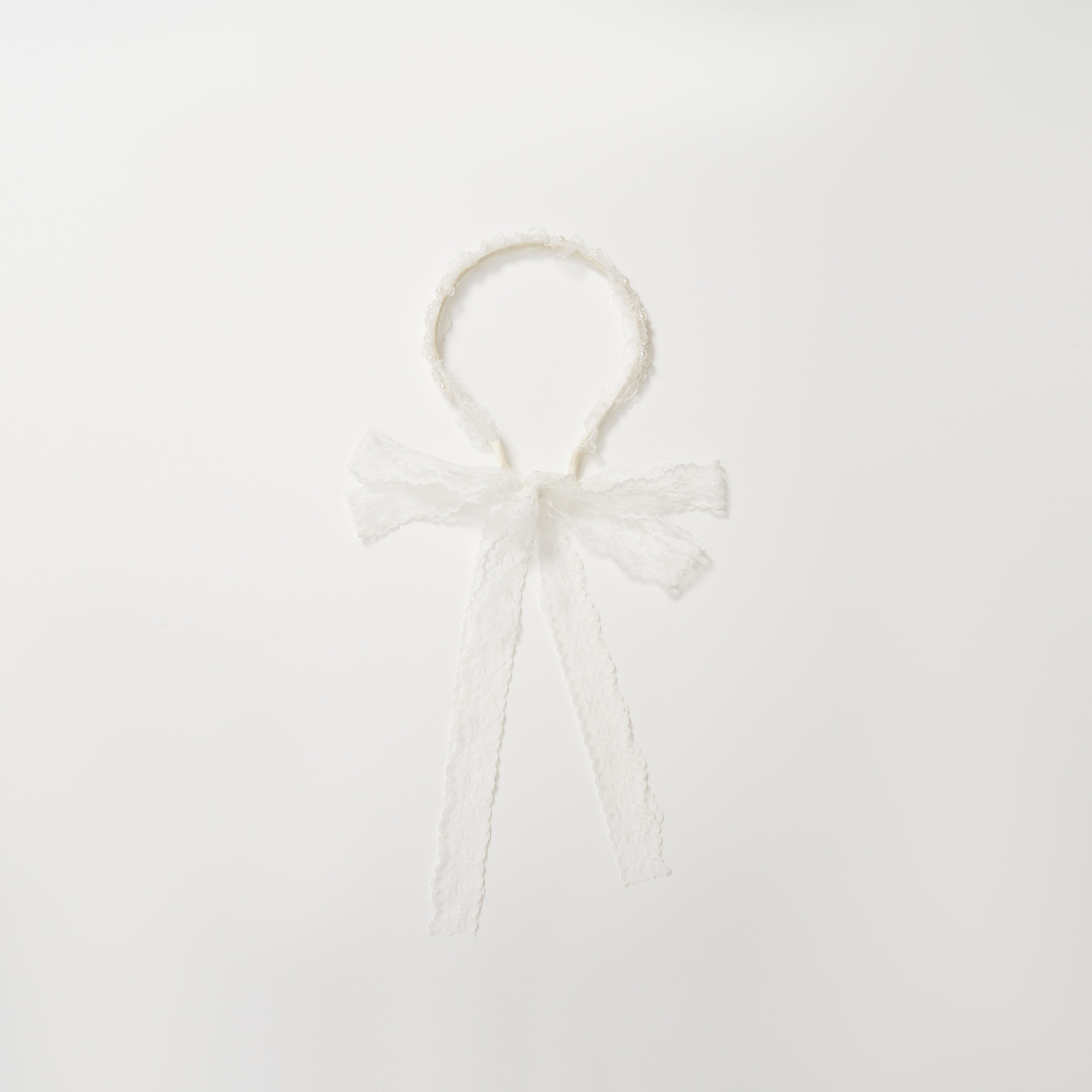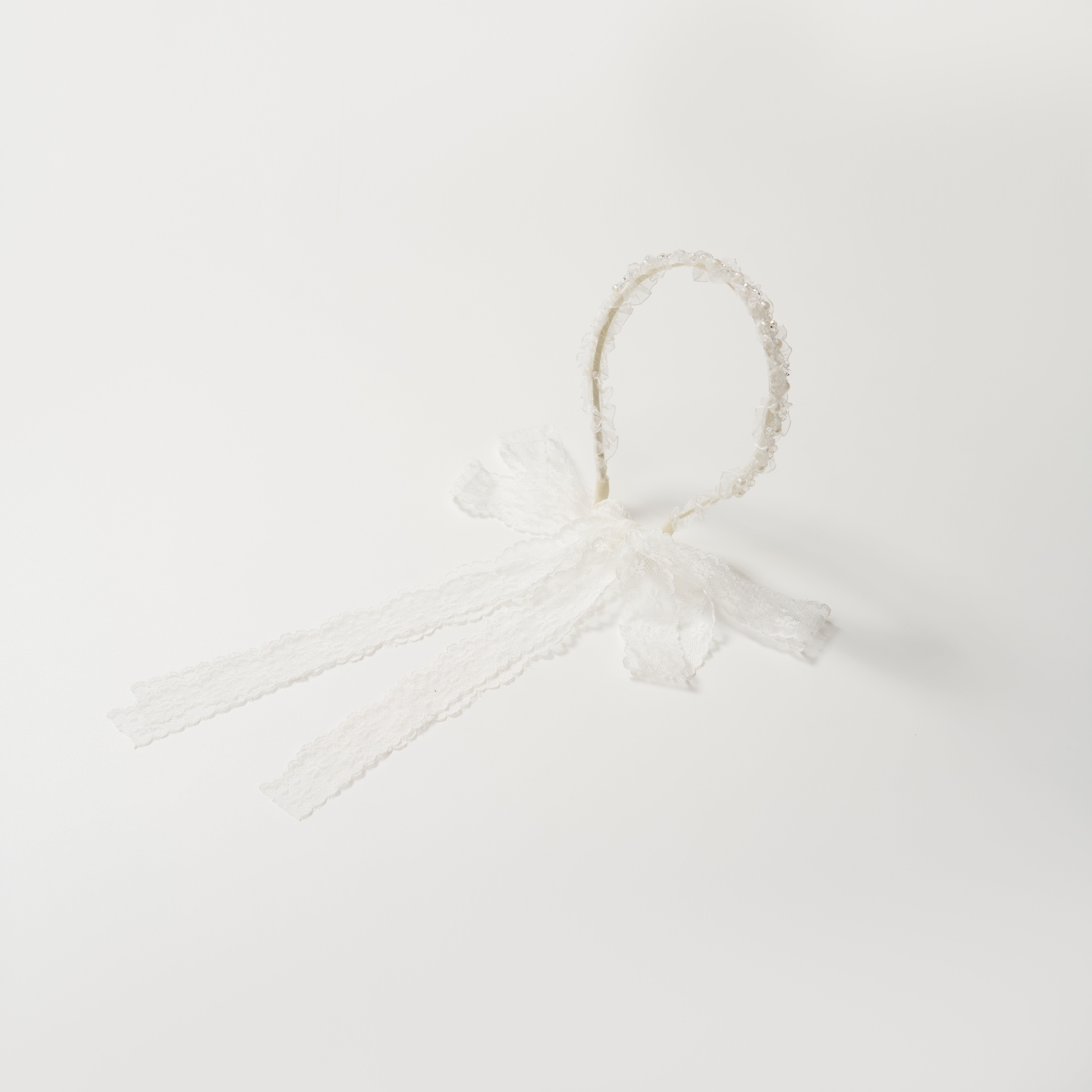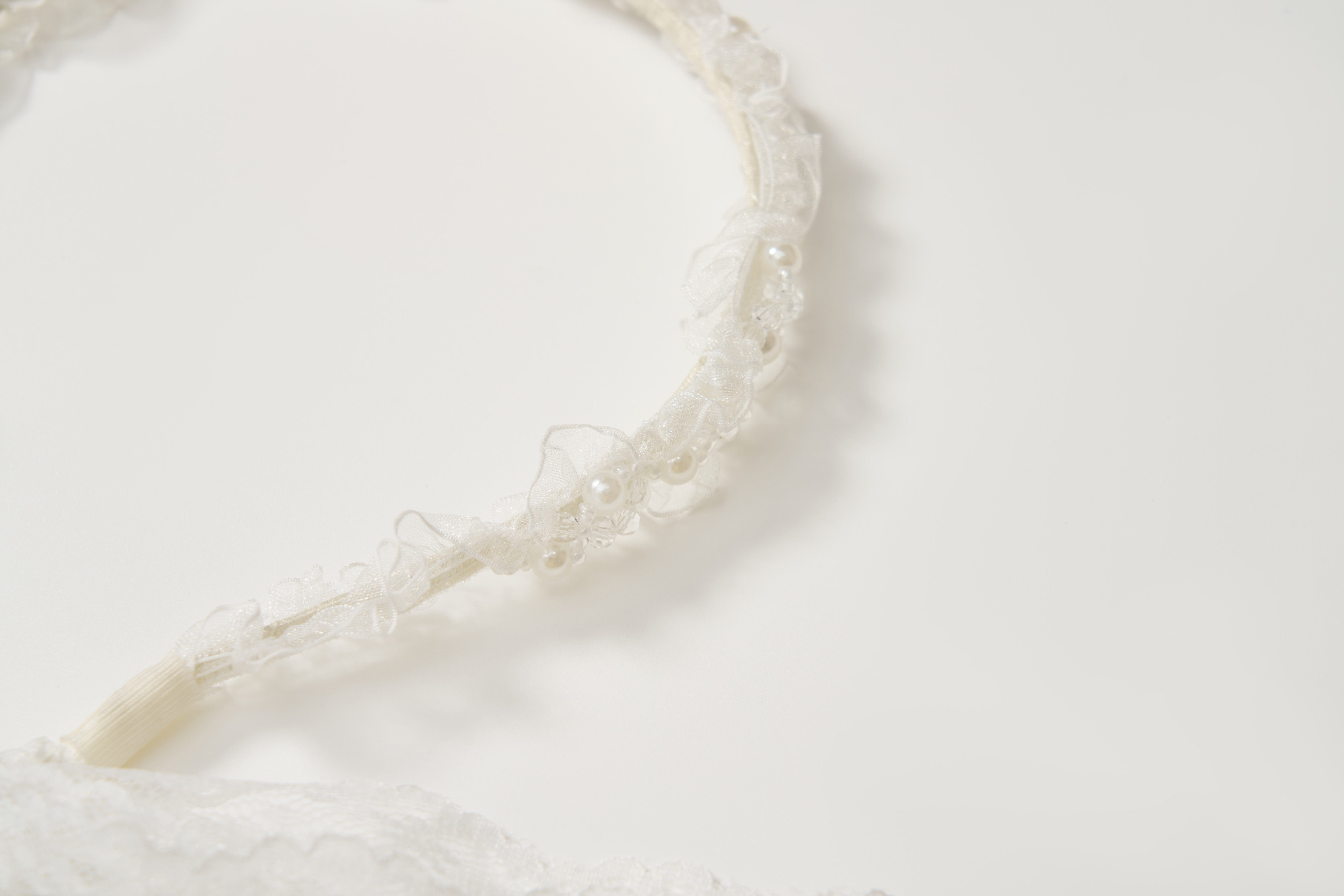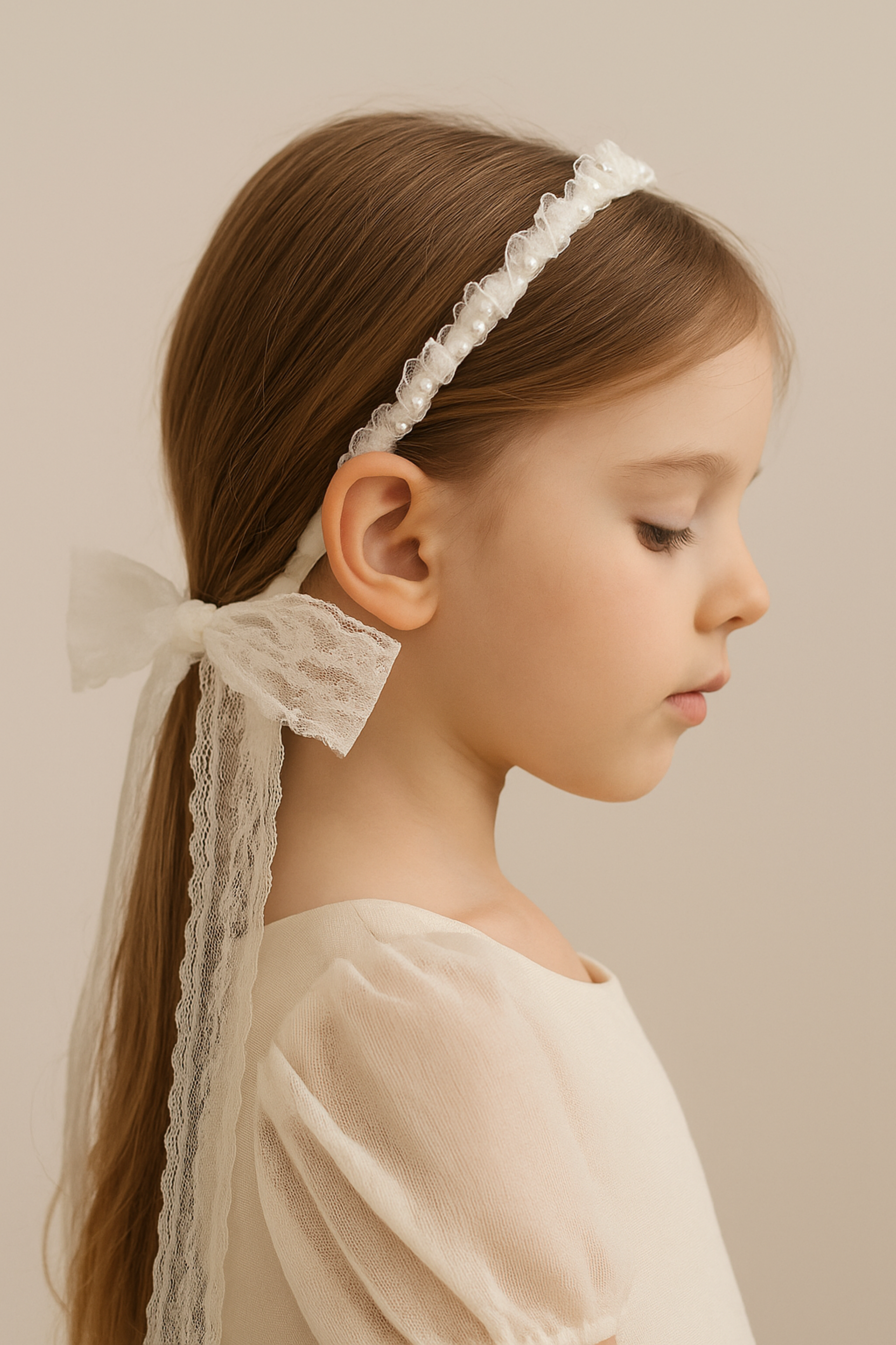 A whisper of elegance, this handcrafted headband is adorned with delicate pearls and ruffled organza along a lace-wrapped band. The extended lace ribbon can cascade freely for a graceful silhouette, or be woven into braids for a romantic touch — offering endless styling possibilities.