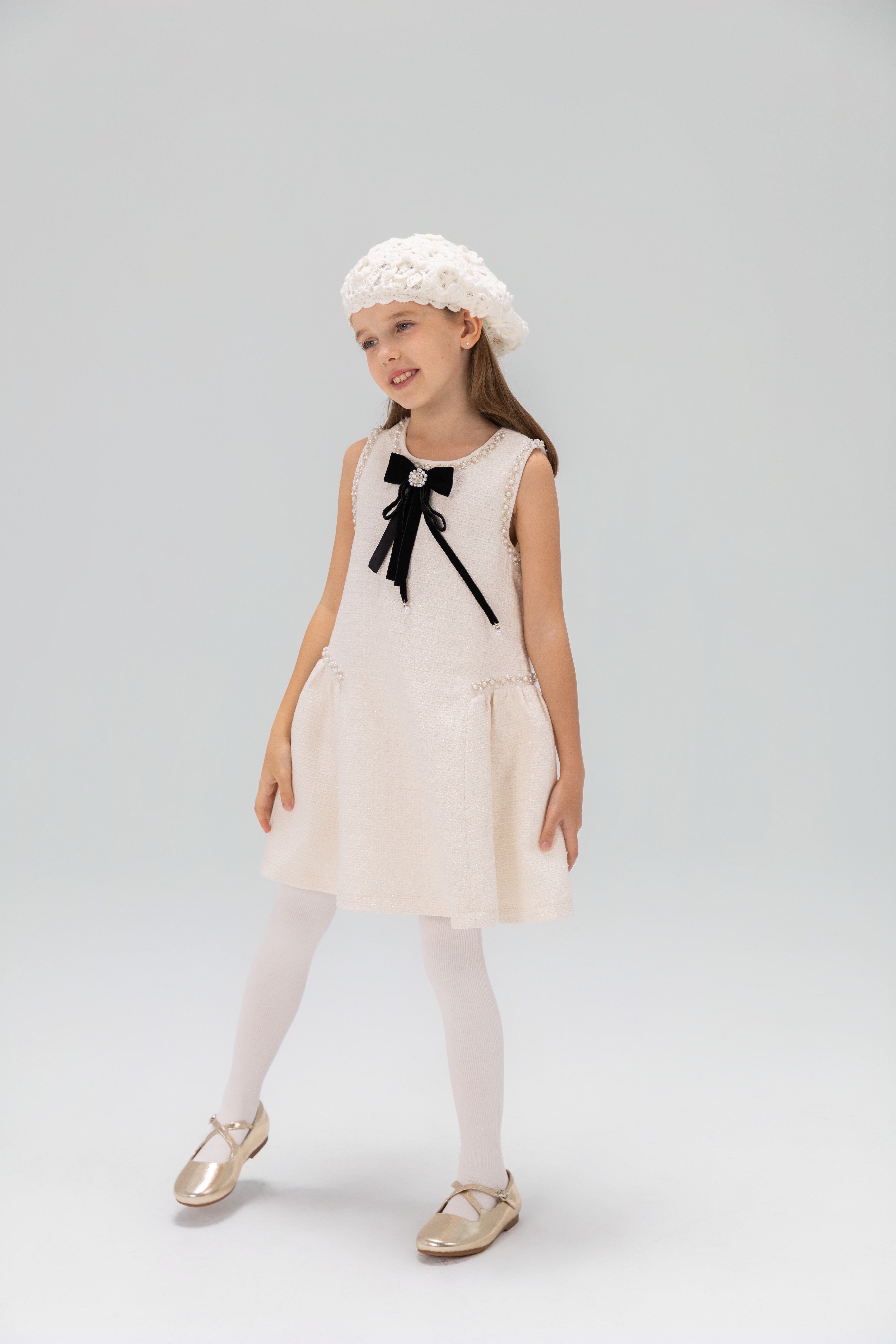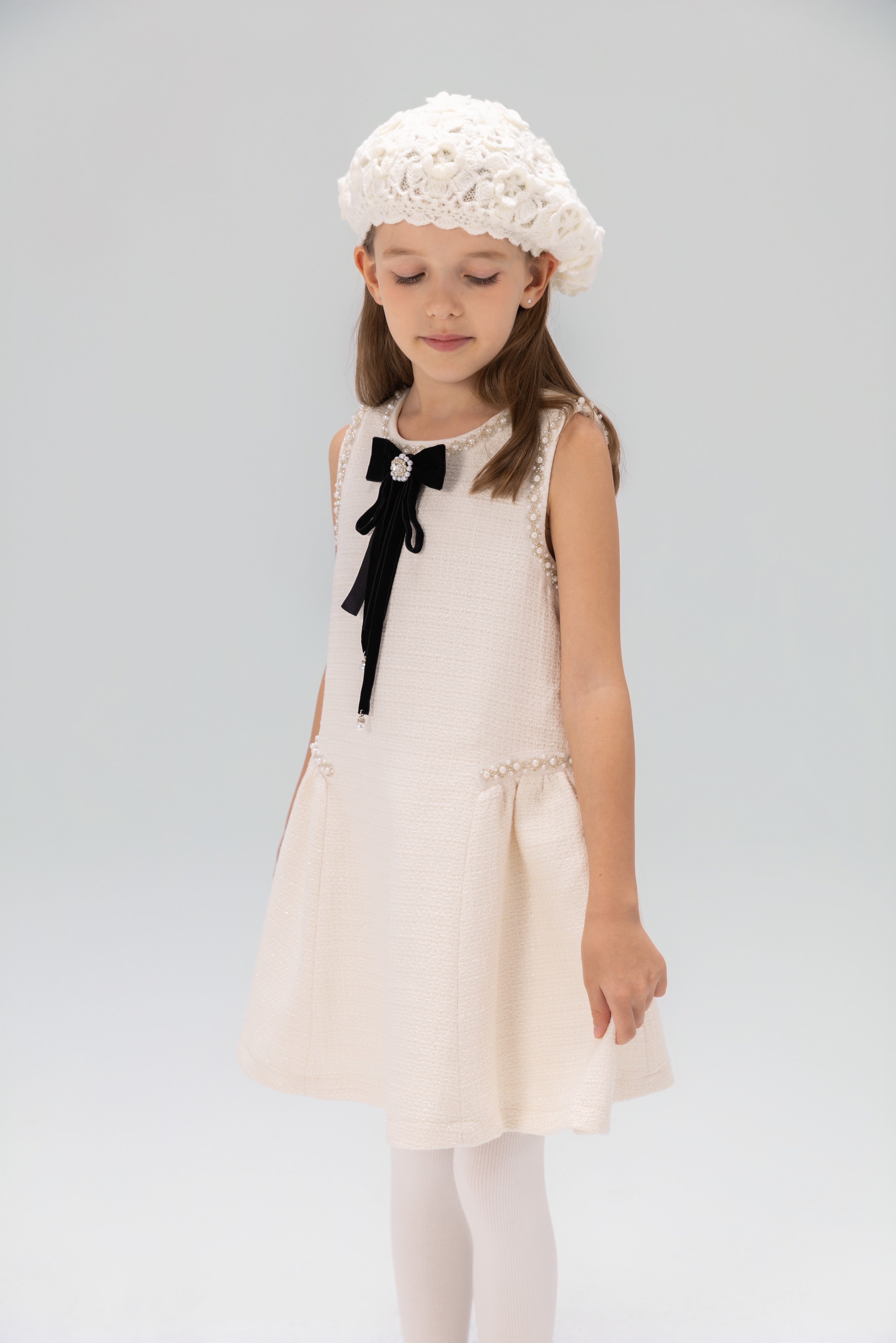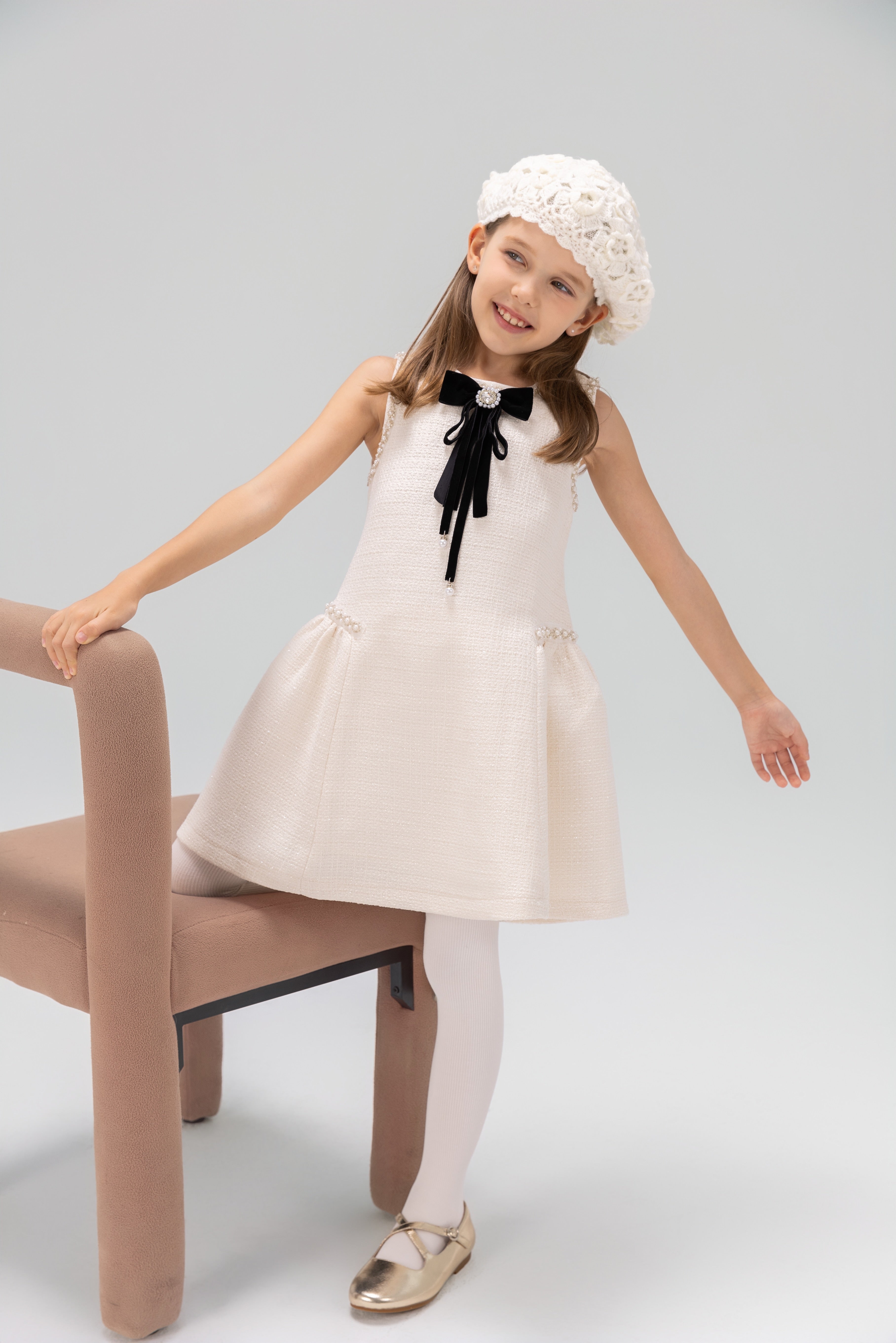 French-inspired elegance for her special moments. This girls tweed dress pairs refined ivory with hand-beaded pearl trim and a detachable black velvet bow brooch for a polished, picture-ready look.