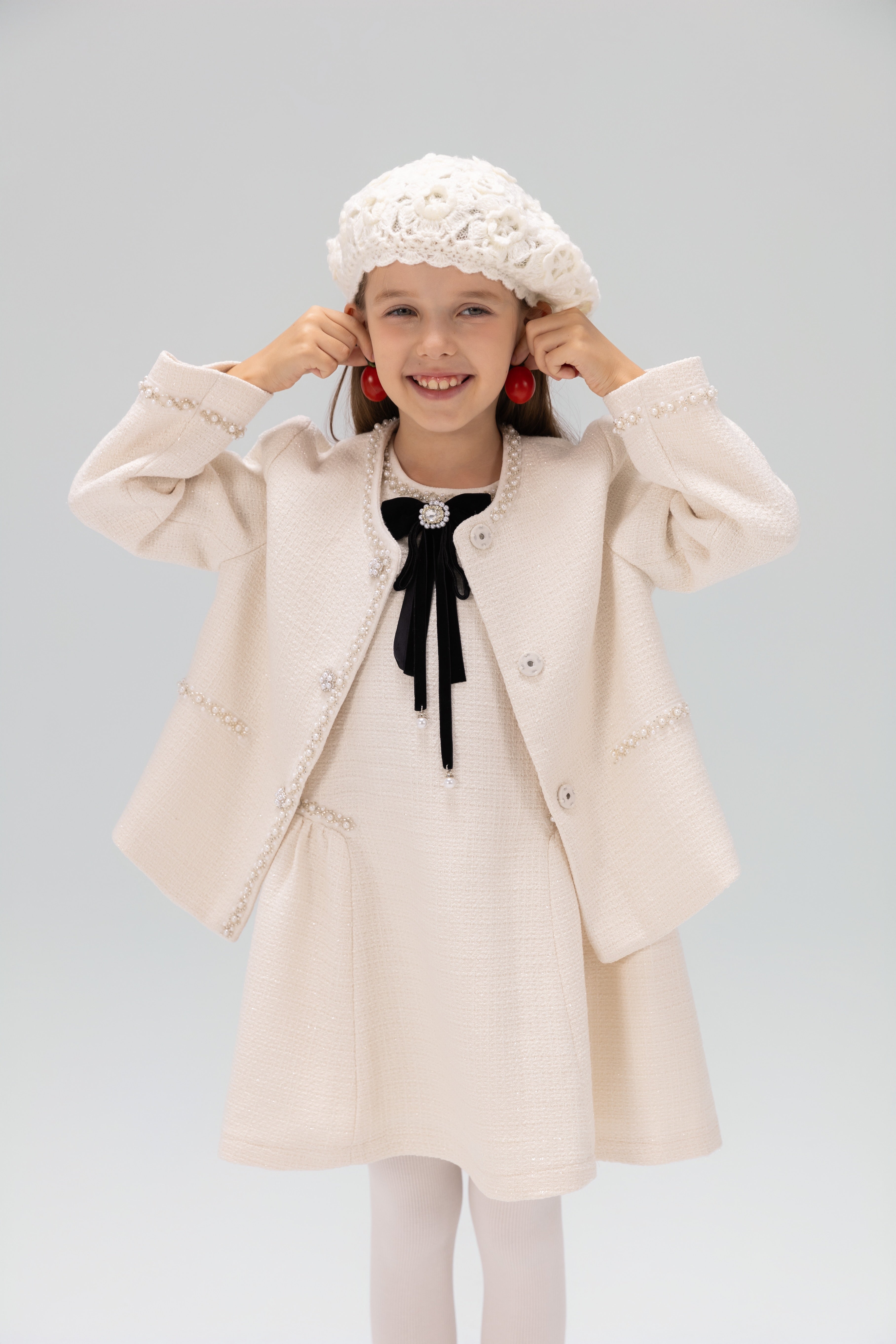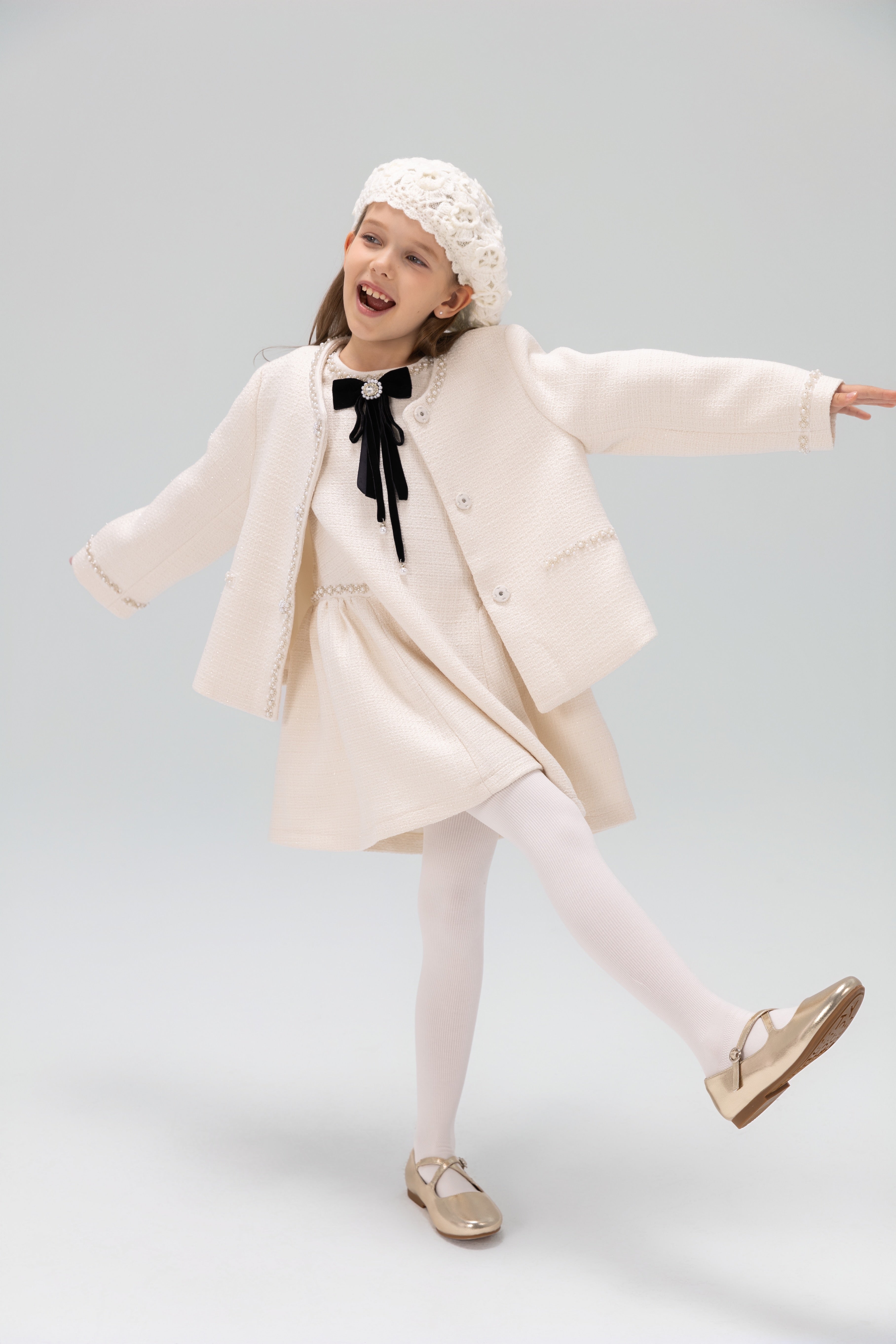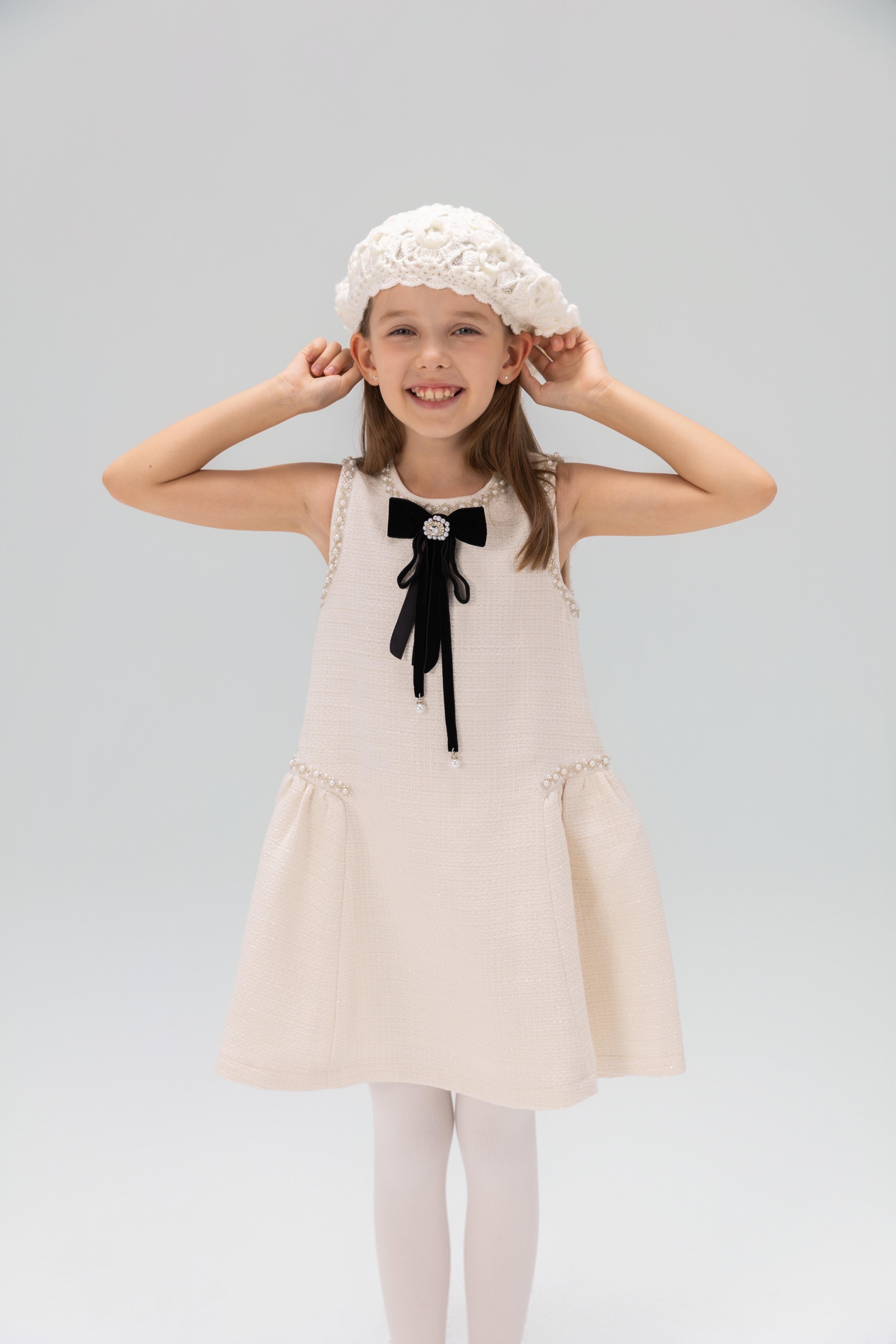 French-inspired elegance for her special moments. This girls tweed dress pairs refined ivory with hand-beaded pearl trim and a detachable black velvet bow brooch for a polished, picture-ready look.