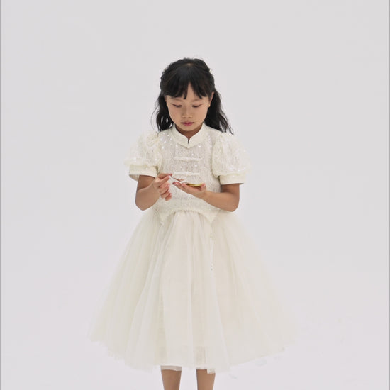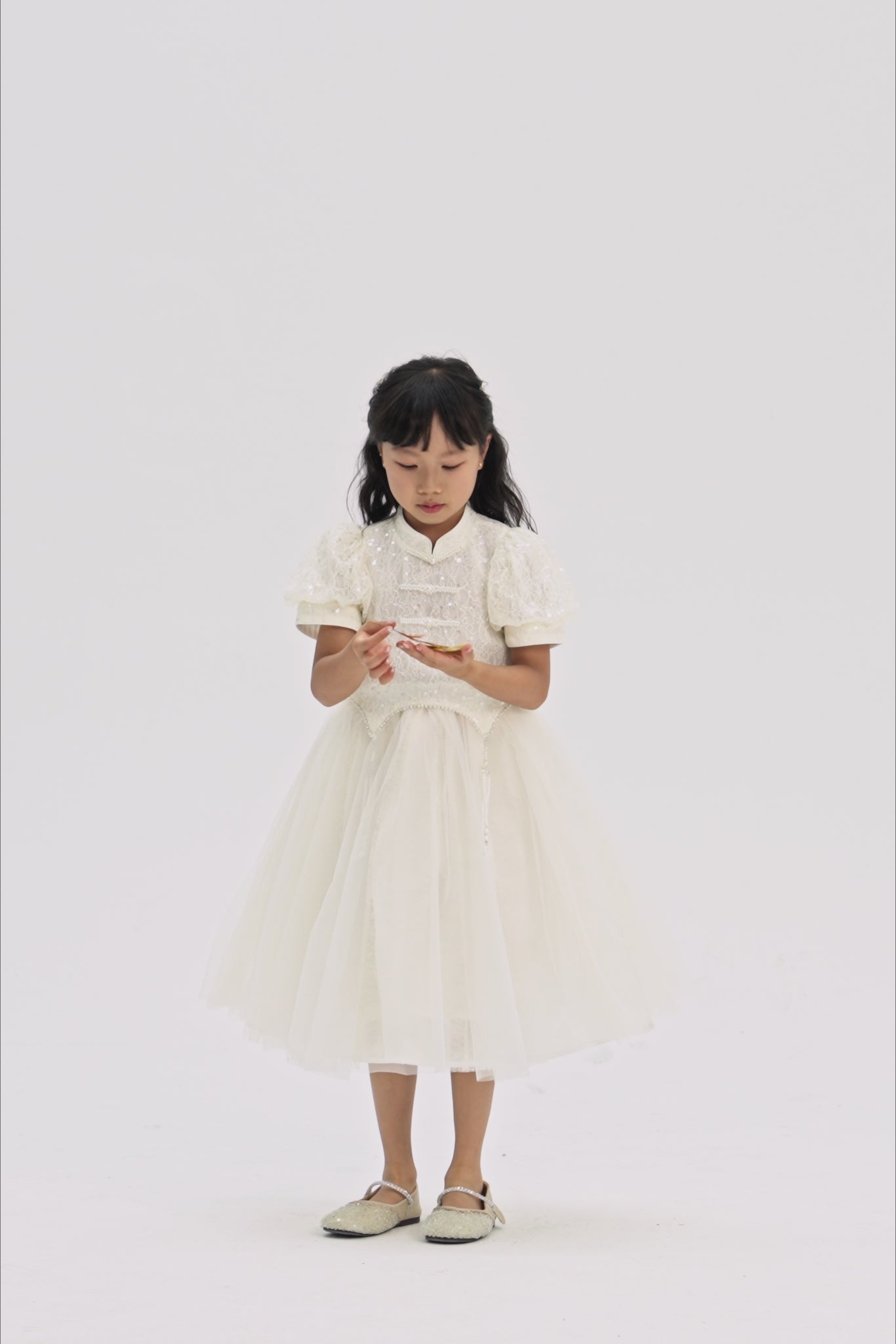 Featuring a faux two-piece silhouette, the top showcases a classic standing collar, dainty pearl frog buttons, and puff sleeves — echoing the grace of traditional cheongsam design.