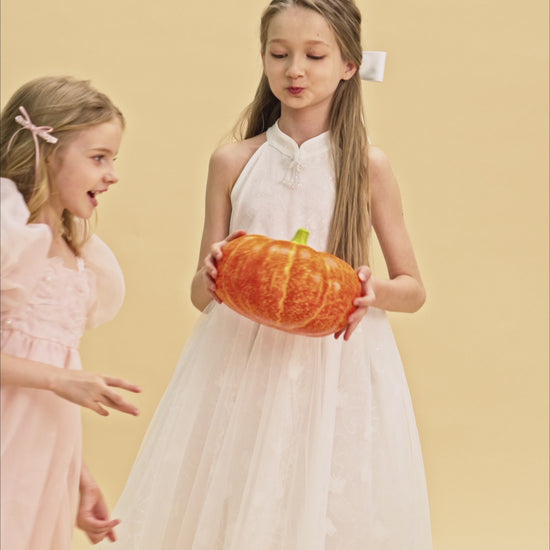 The versatile bow can also be styled as a charming hair accessory. This piece is a celebration of lightness, movement, and imaginative detail.