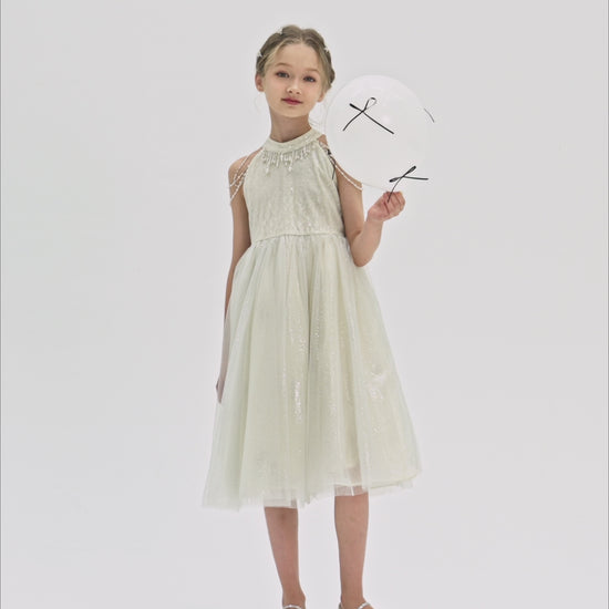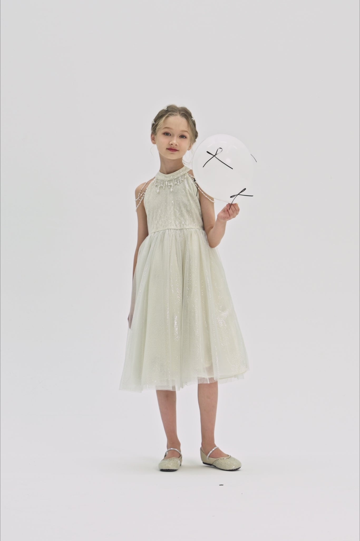 Layers of soft, shimmering beige tulle create a luminous skirt that moves beautifully with every step. Subtle glitter scattered throughout the fabric catches the light from every angle. A true spotlight piece — graceful, glamorous, and unforgettable.