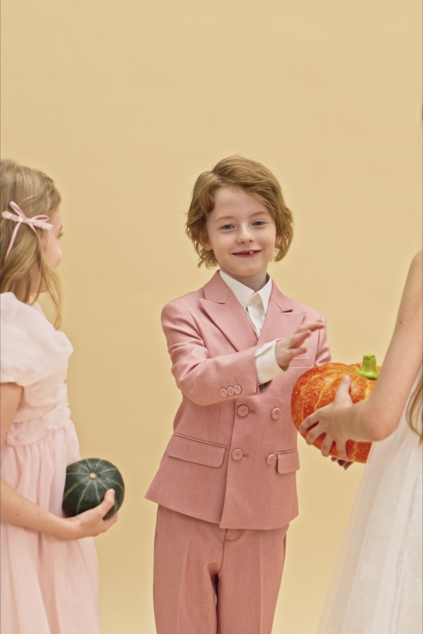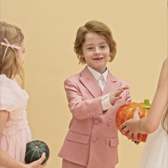 This dreamy blush pink boys blazer features a unique double-breasted silhouette, crafted in a color that feels both playful and poetic.