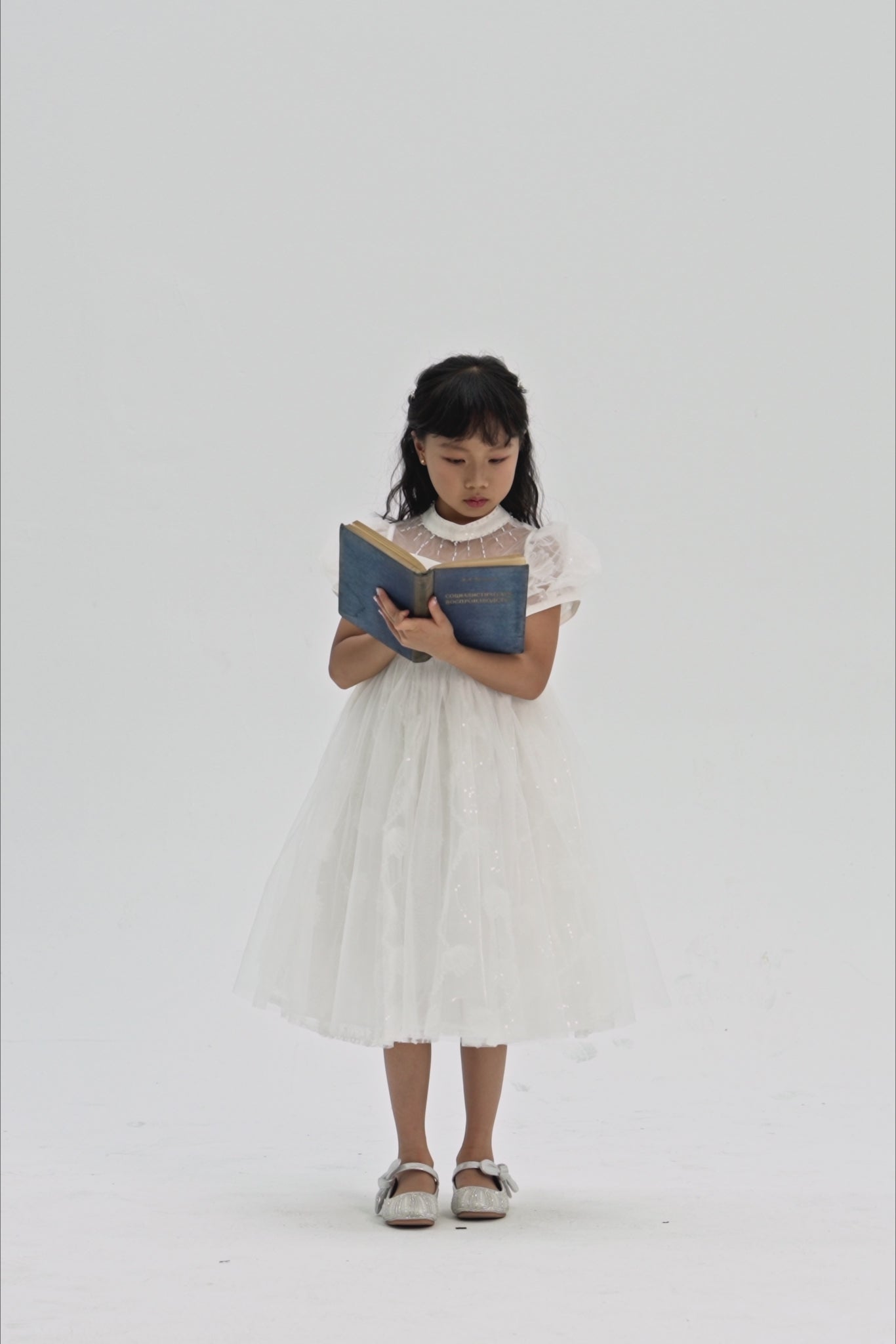 The soft standing collar adds a touch of poise, delicately framed with sparkling bead accents that bring a hint of luxury. Puff sleeves lend volume and charm, balancing elegance with a youthful silhouette.