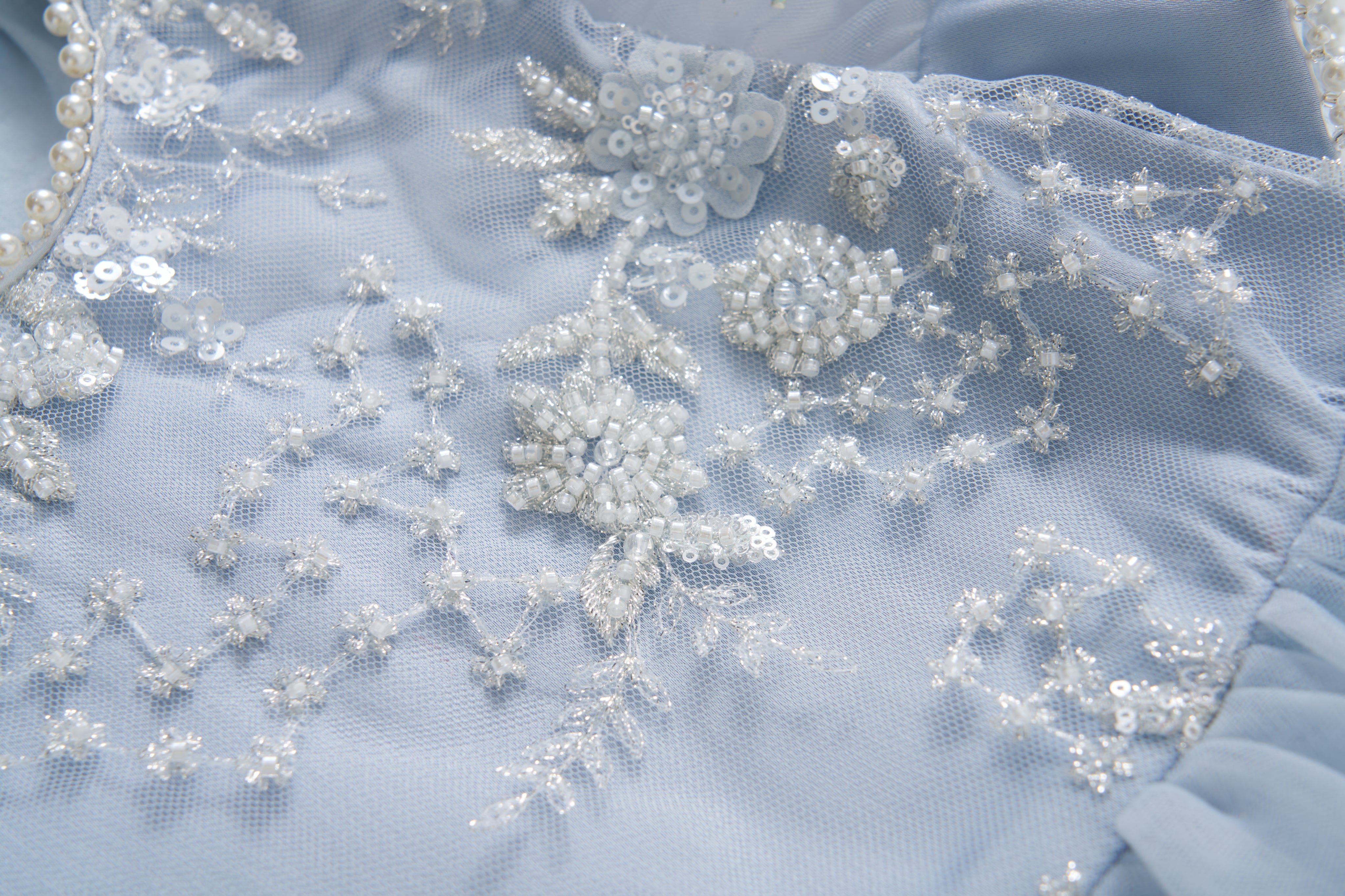 Delicate as morning dew, this dreamy light blue a-line dress exudes soft, ethereal elegance.