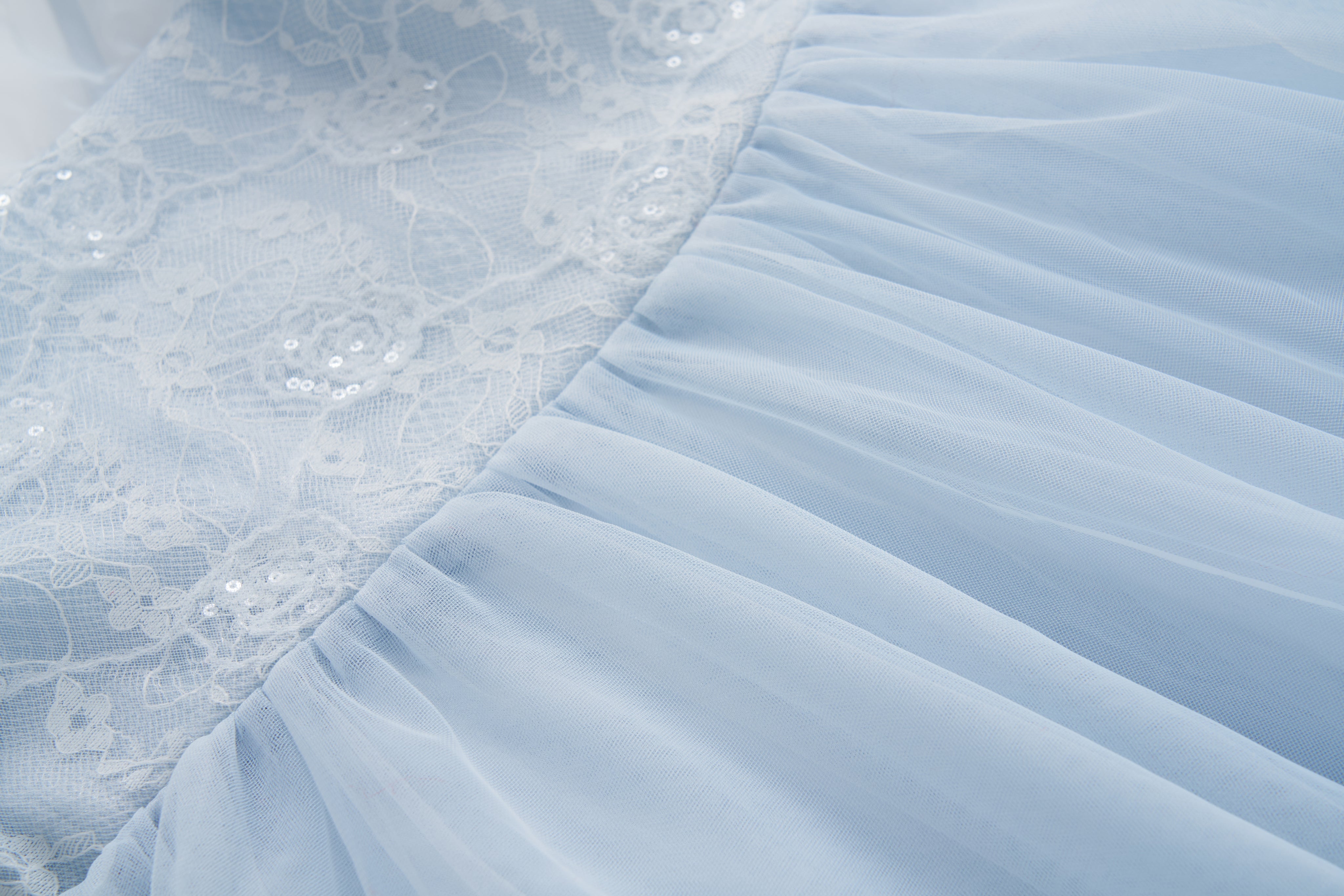 Crafted from a delicate mix of lace and organza, the bodice offers subtle texture and structure, while airy puff sleeves add a gentle fairytale touch.