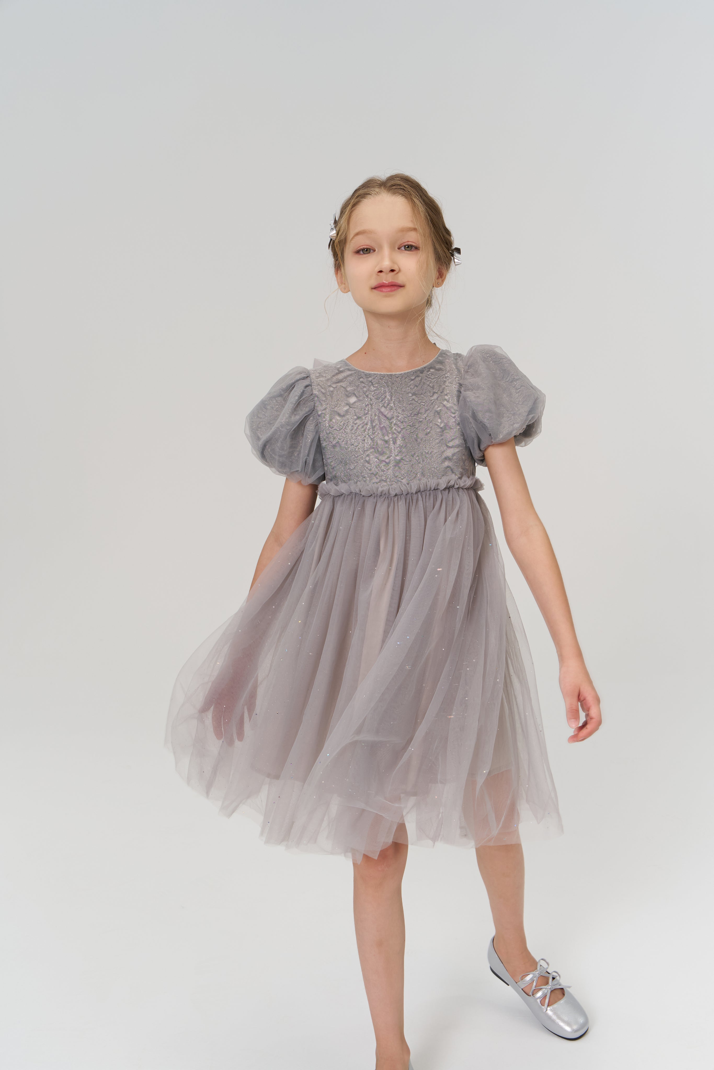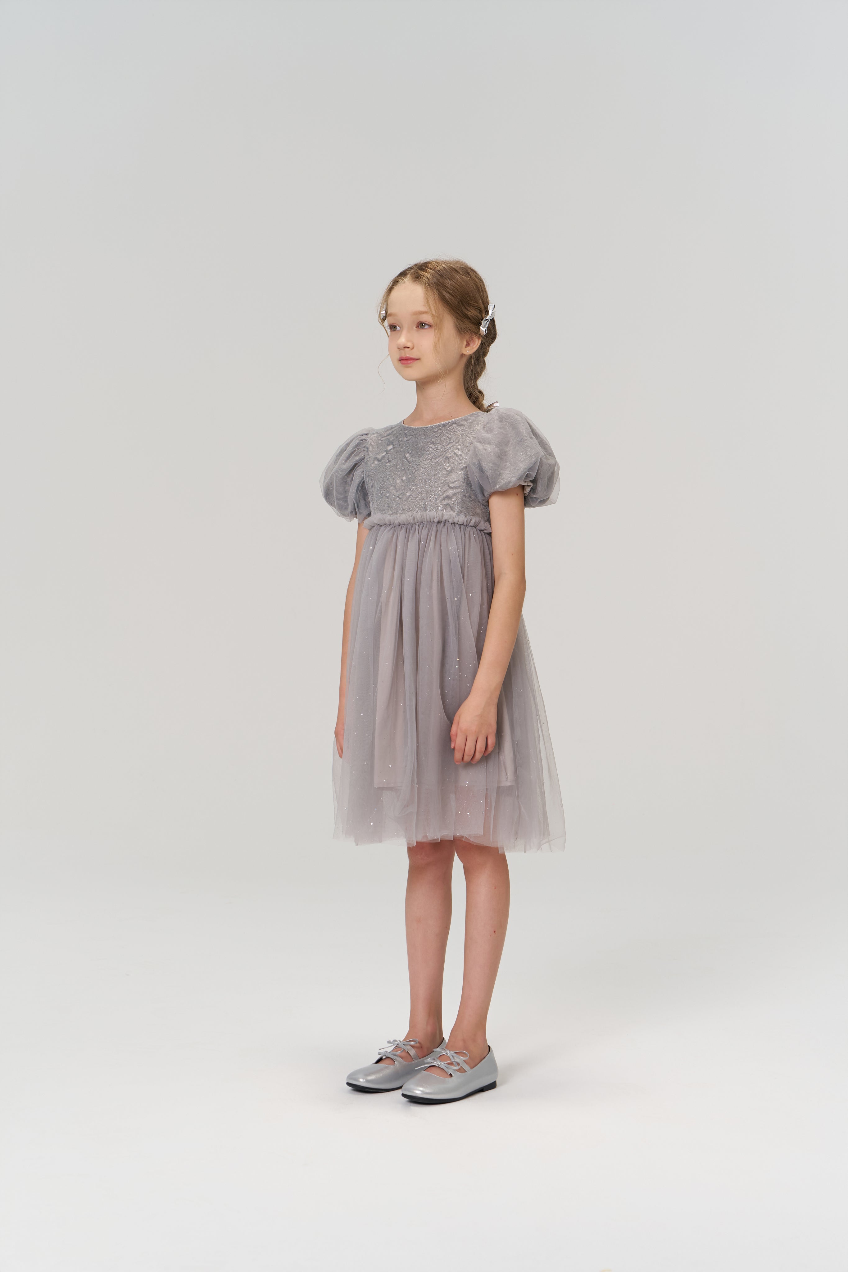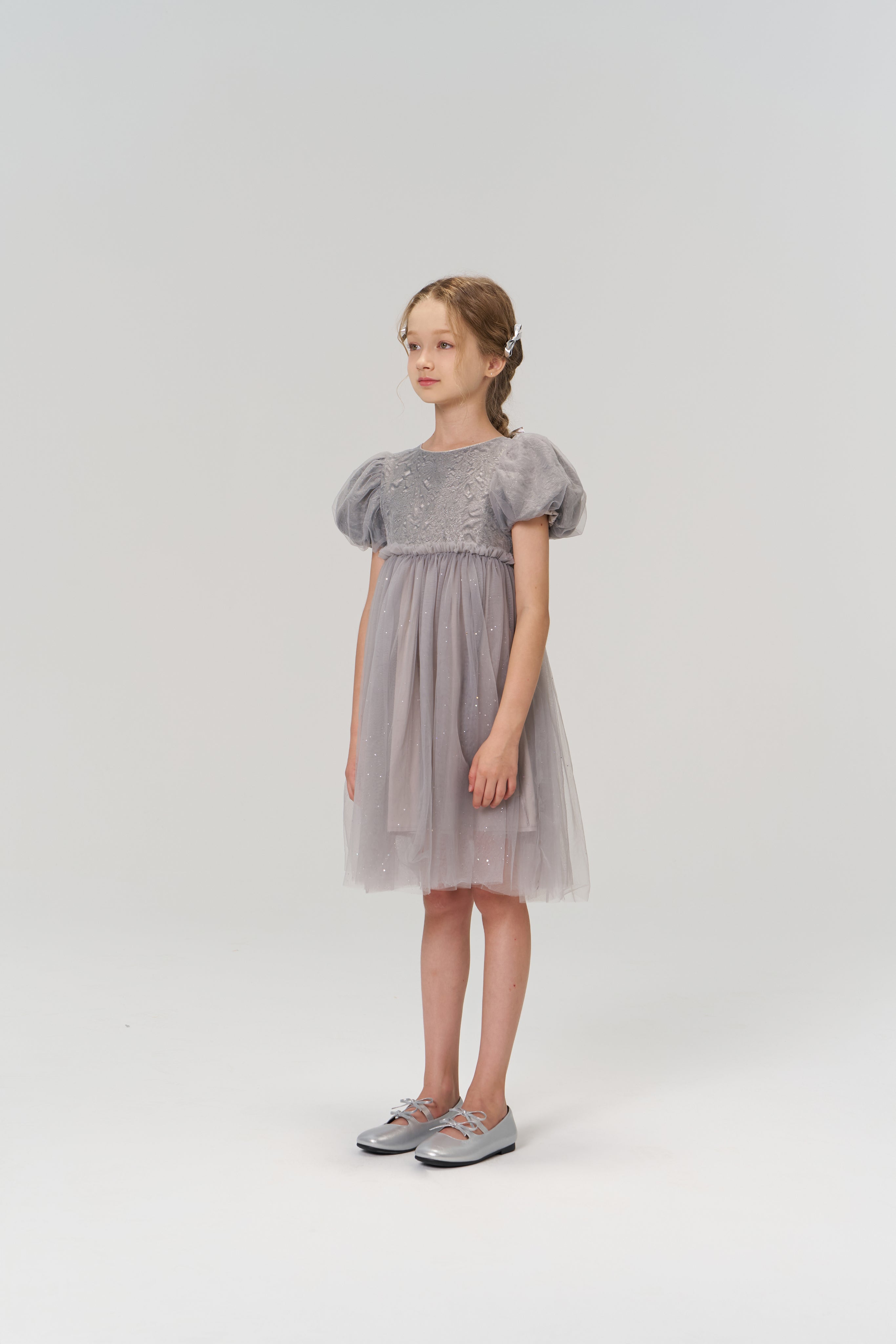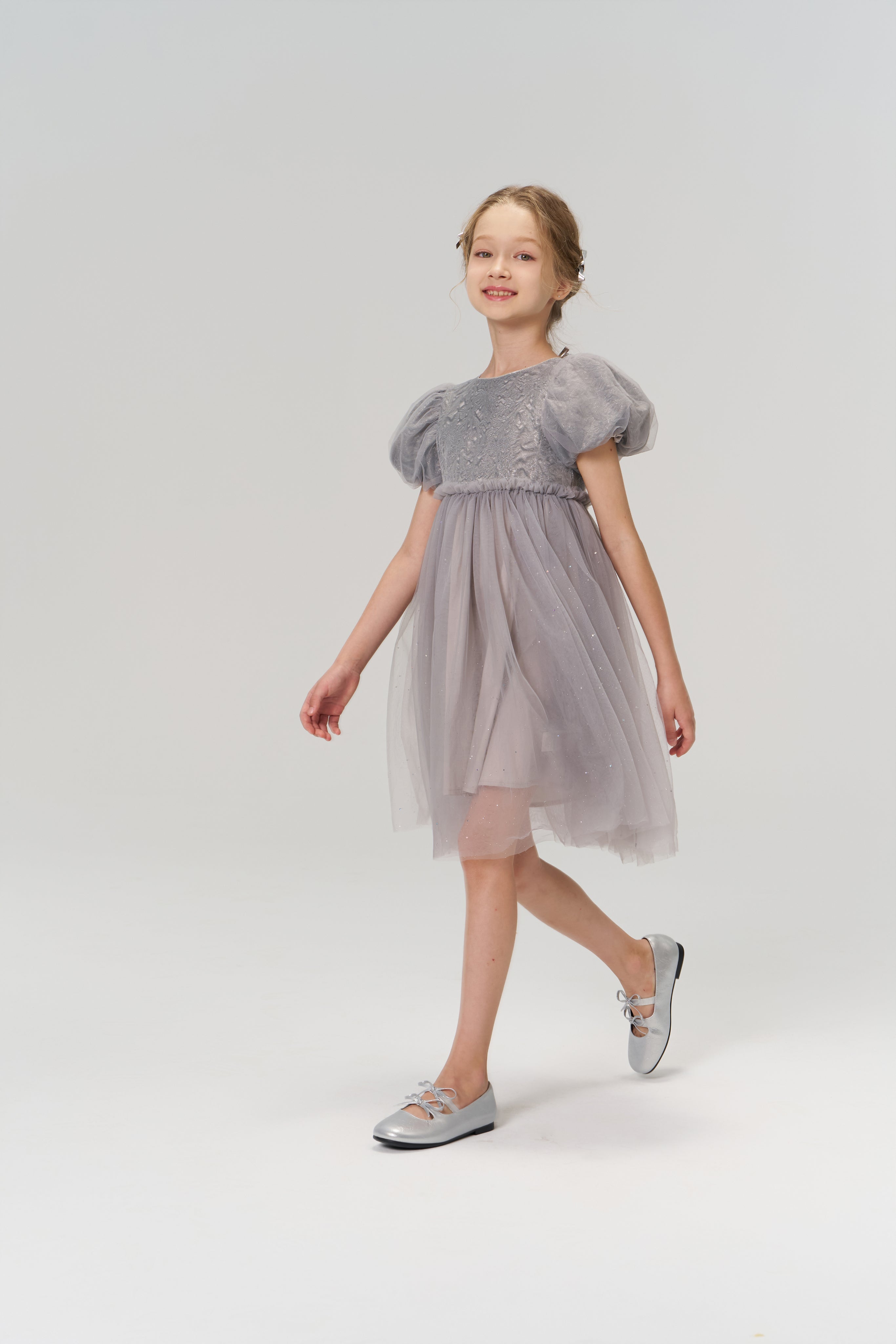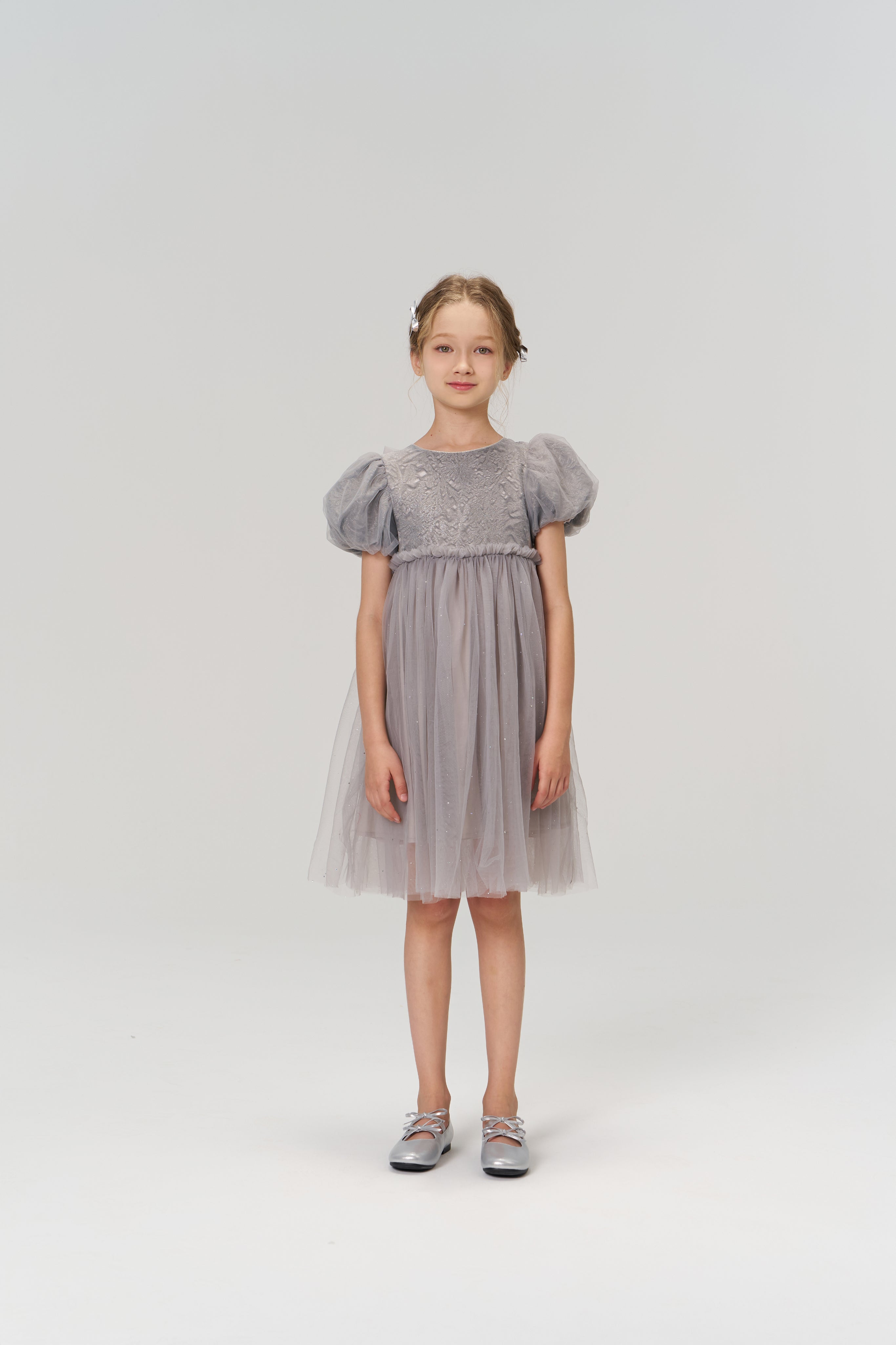 Soft, sophisticated, and quietly dazzling — this delicate grey puff-sleeve dress exudes understated luxury.