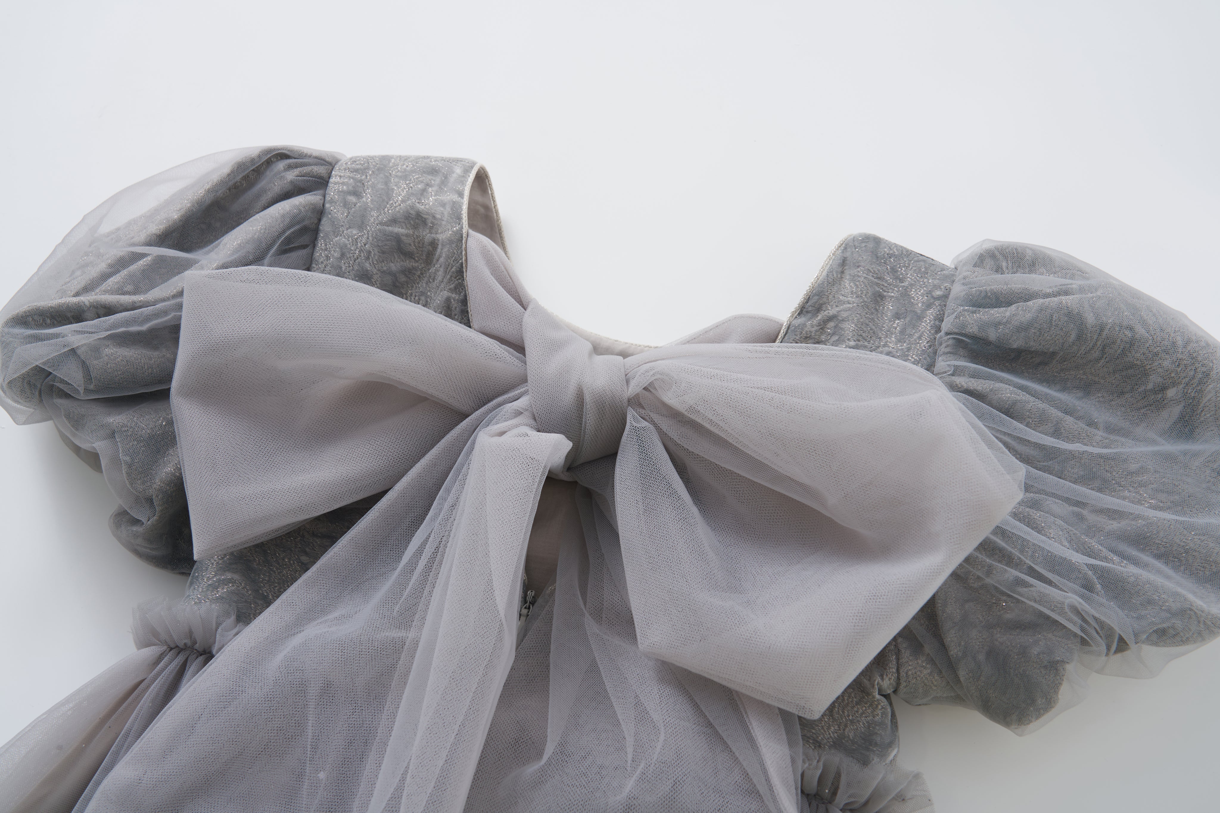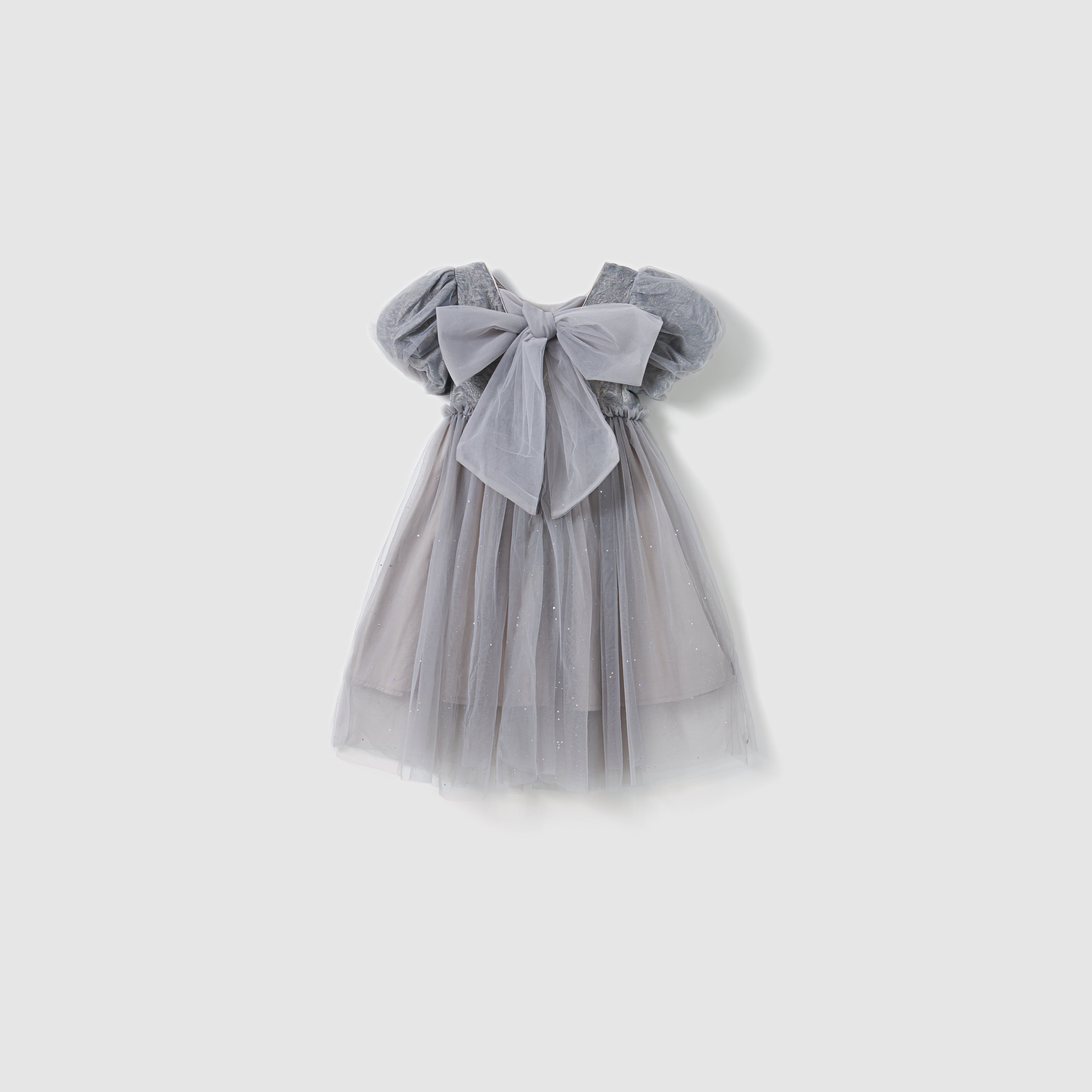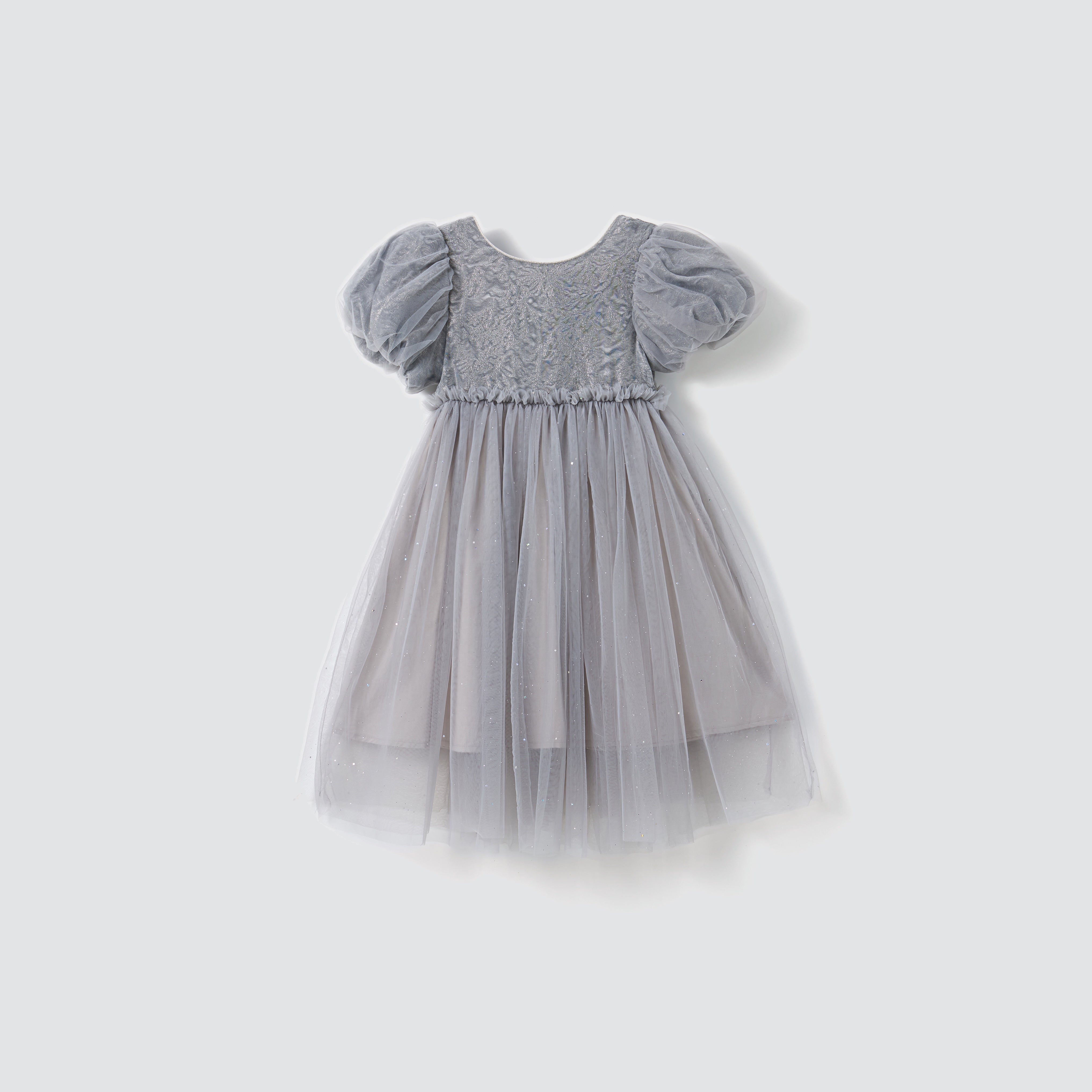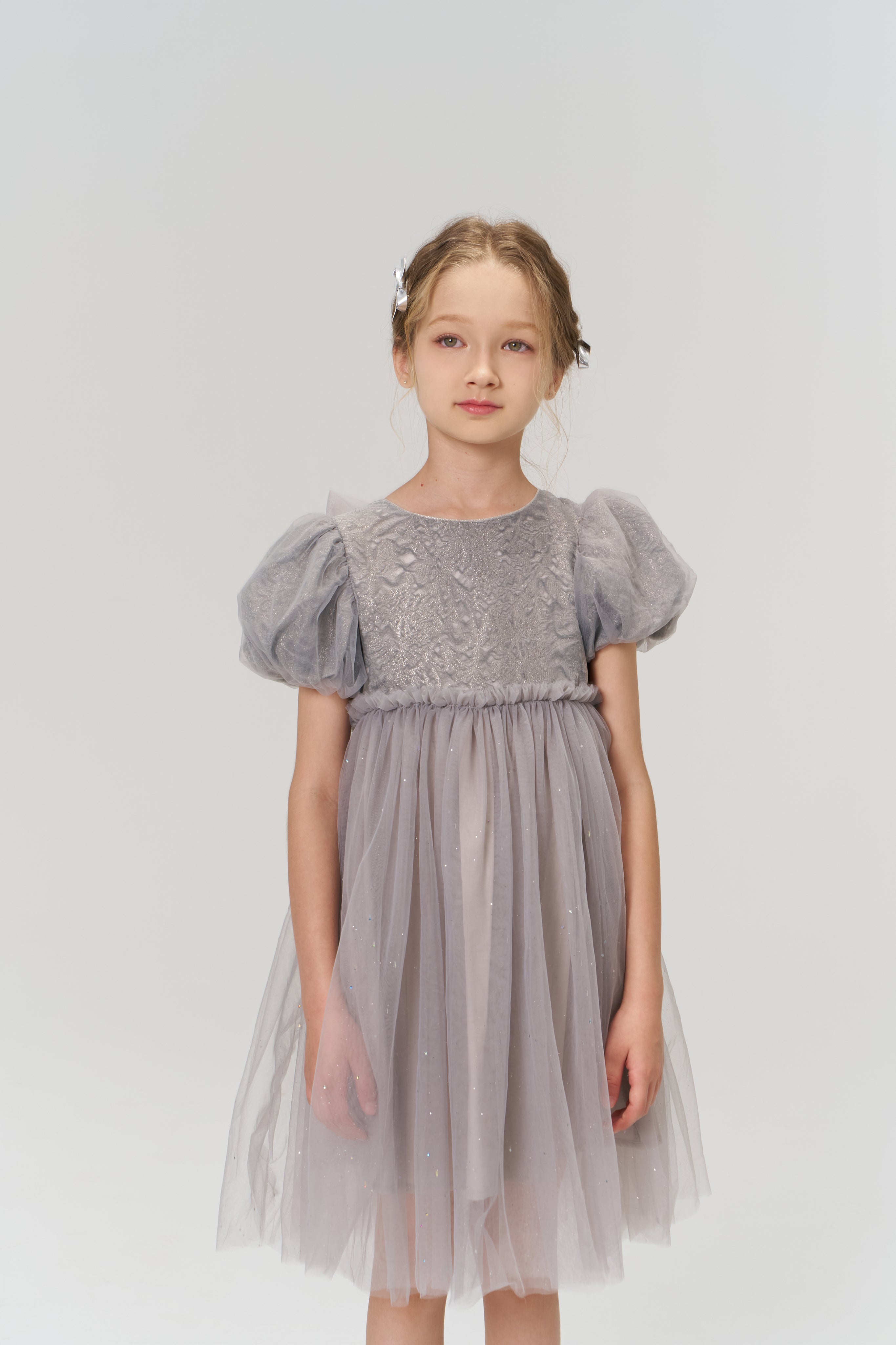 Soft, sophisticated, and quietly dazzling — this delicate grey puff-sleeve dress exudes understated luxury.