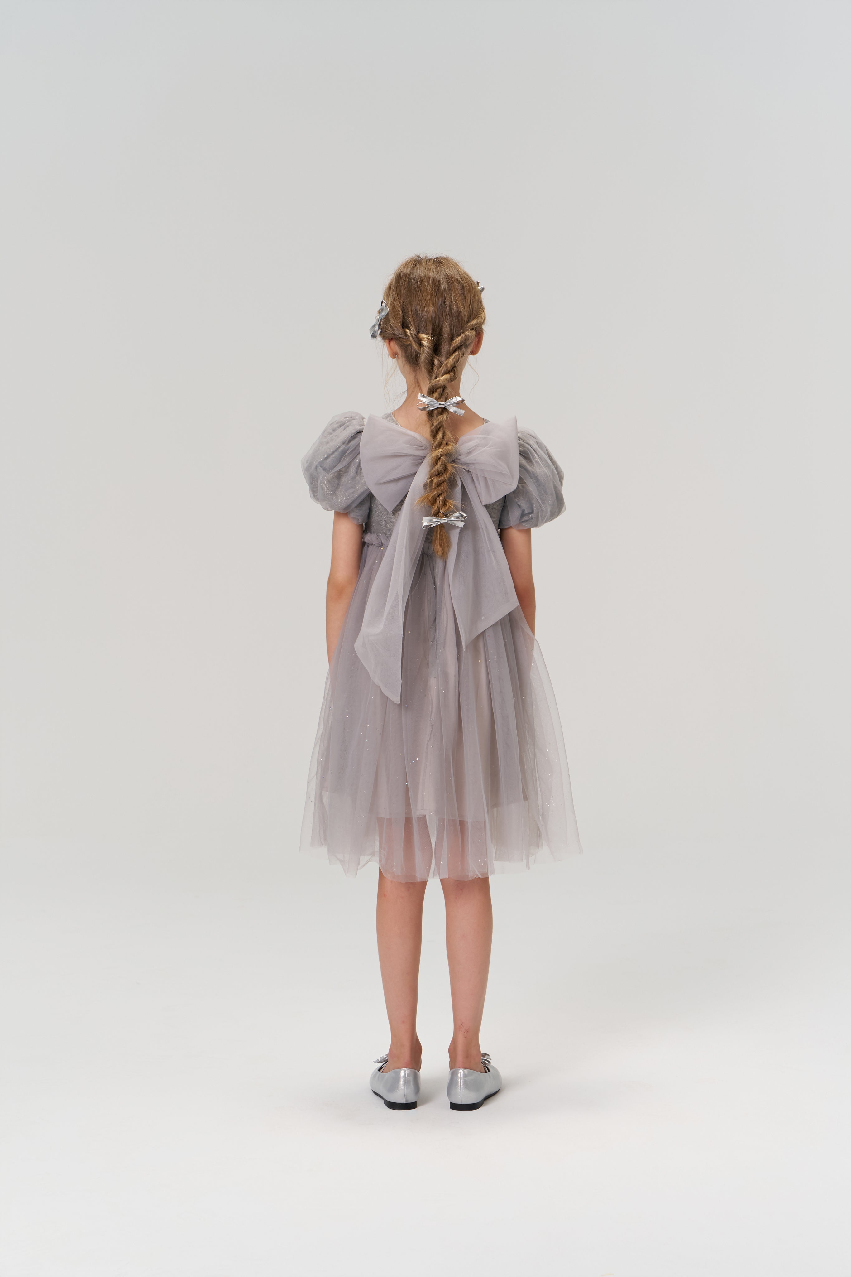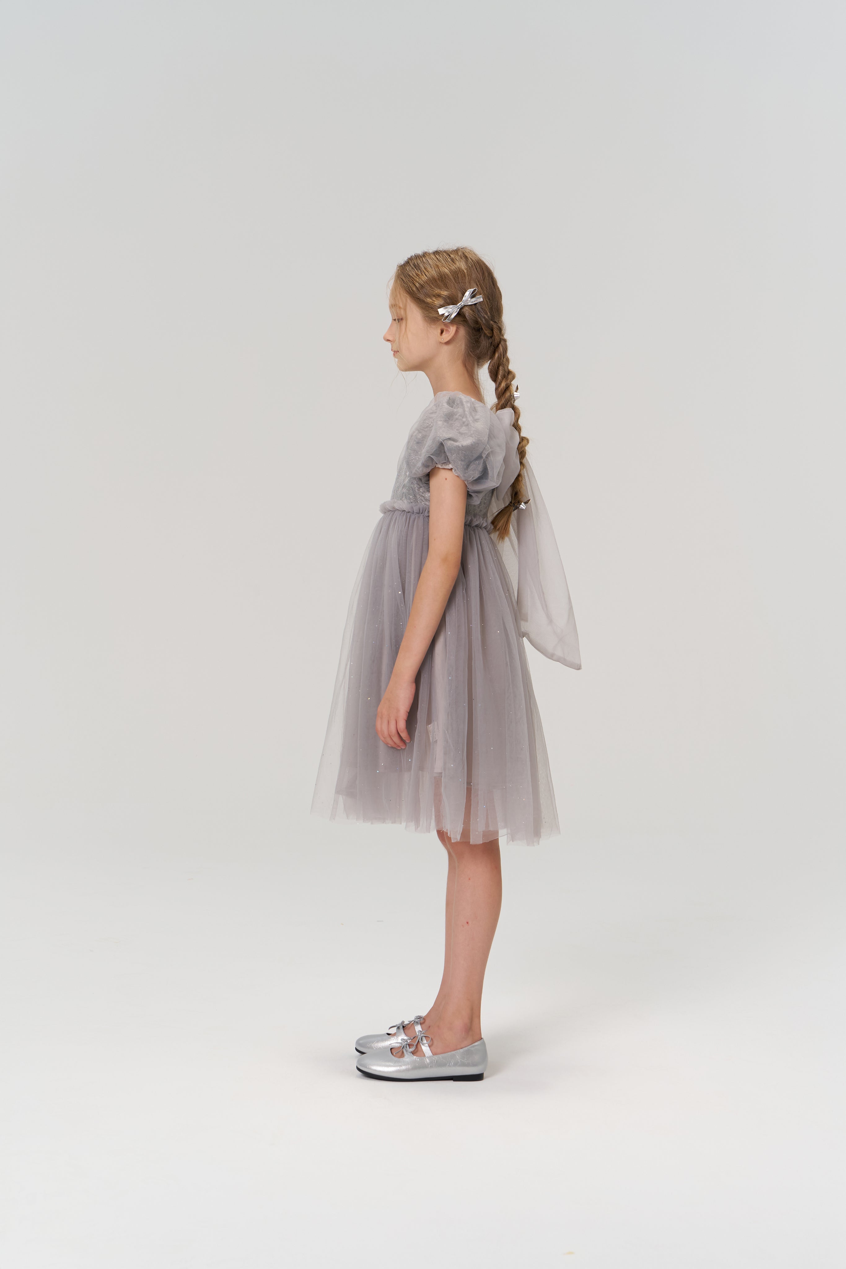 The KIKI and JOJO Girls Silver Bow Hair Clips - Set of 2 are shown on a light gray background, crafted from silver-toned PU leather, with one clip facing up and the other down to display both sides. A young girl stands against a white background, wearing a light purple tulle dress with puffed short sleeves and KIKI and JOJO Girls Silver Bow Hair Clips (Set of 2) that add subtle decorative details to her look.