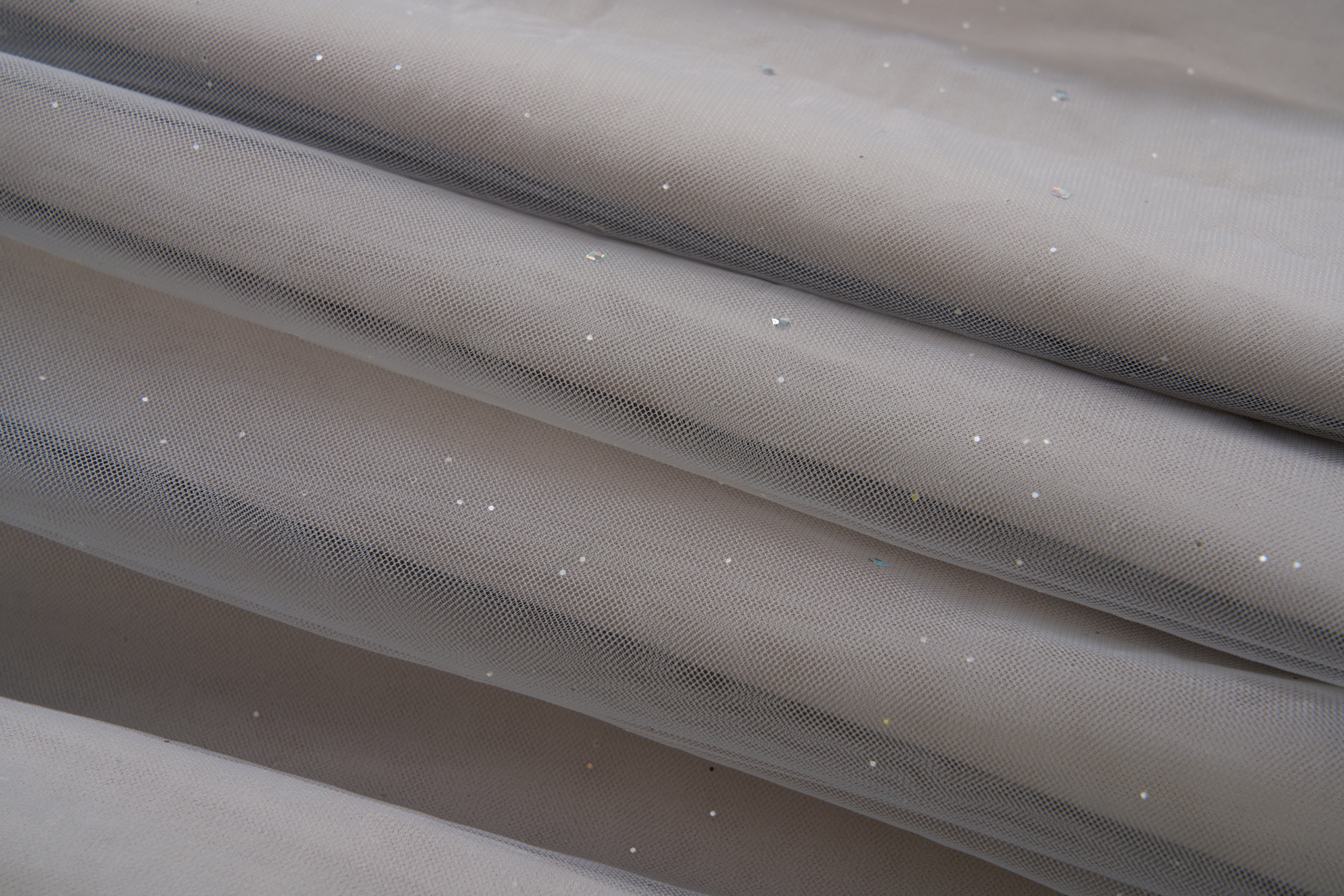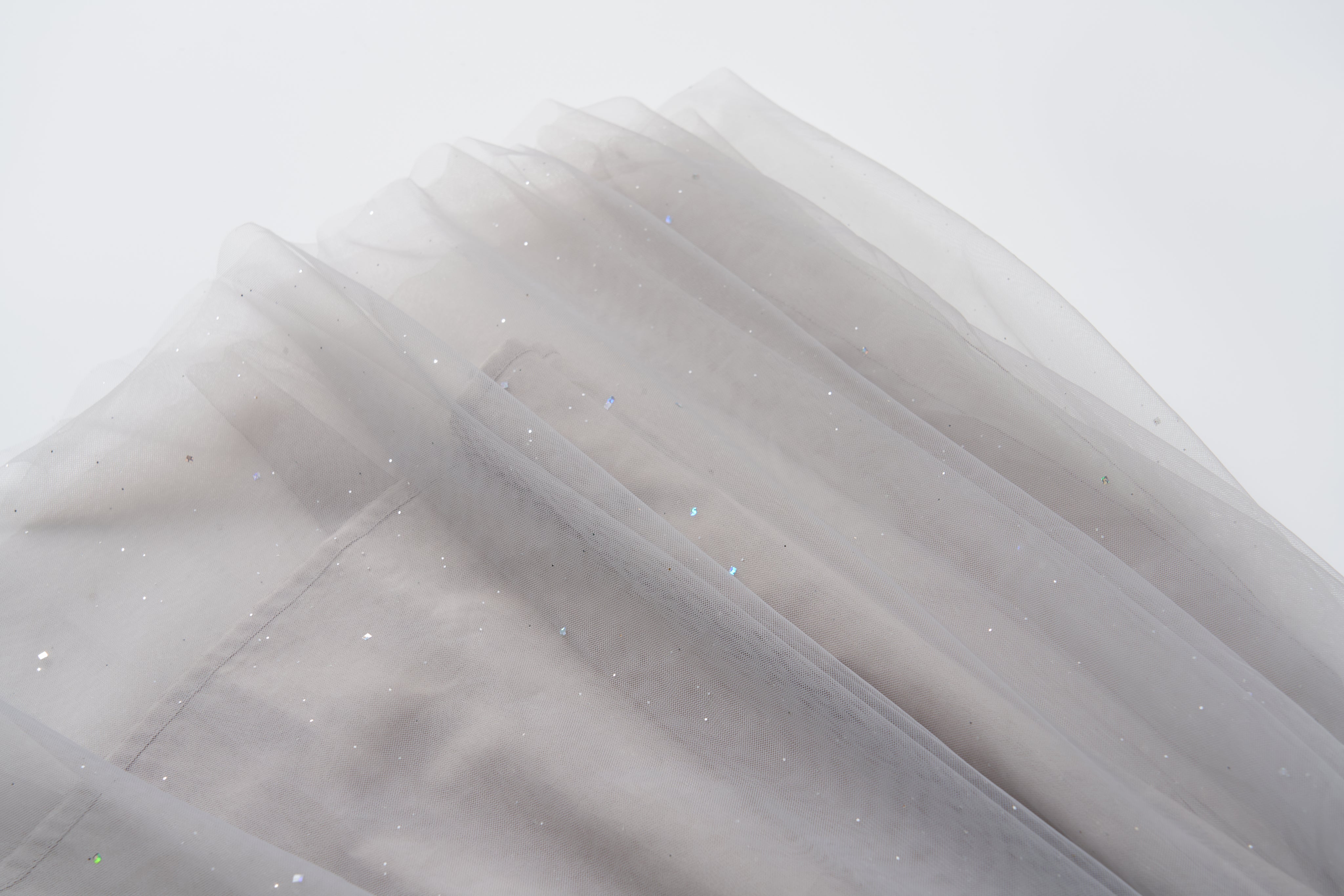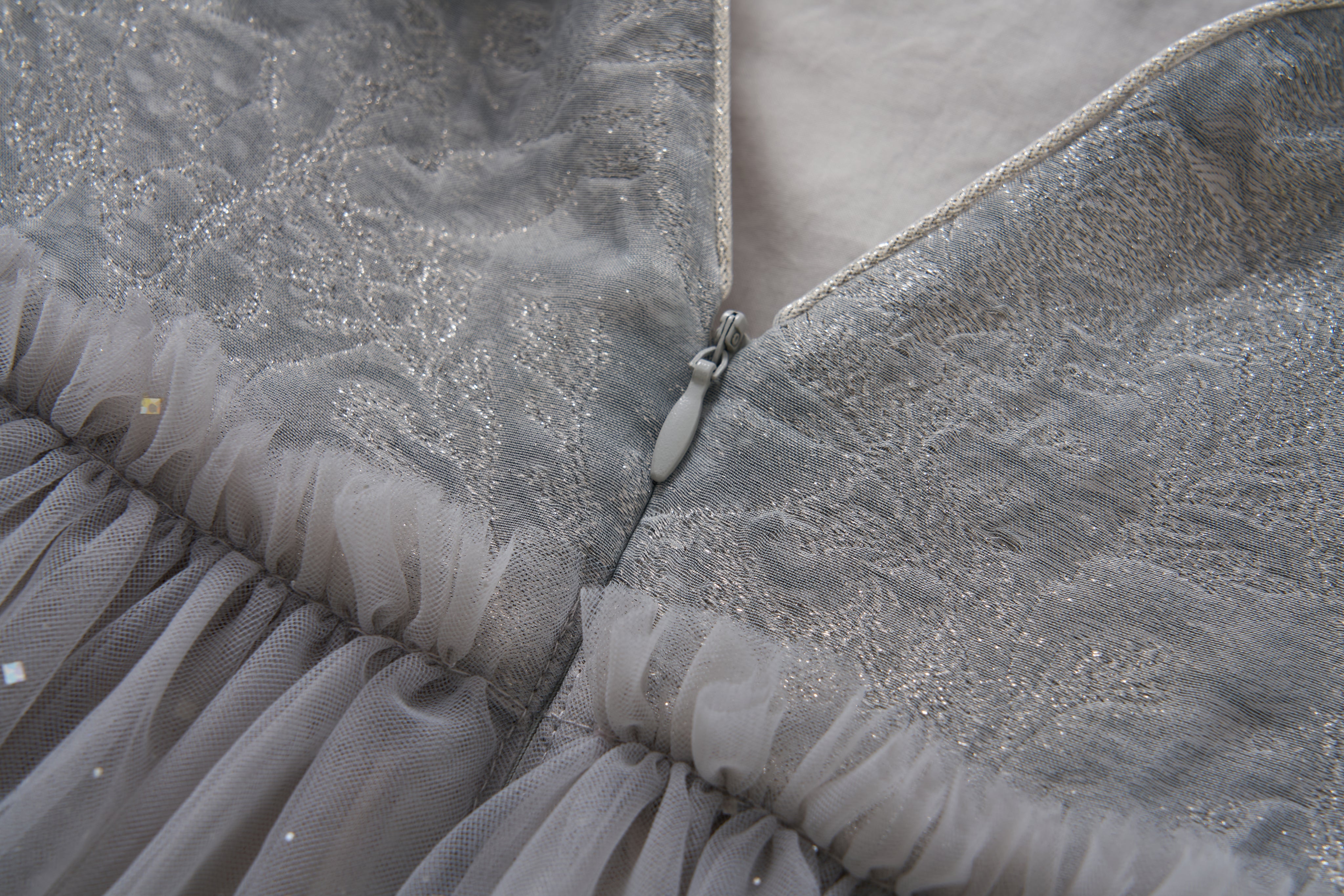 The bodice features a layered design: semi-sheer organza floats gently over textured jacquard, creating depth and visual interest. The gathered waist subtly defines the silhouette, while the skirt is crafted from glittering tulle dusted with heat-set, shimmering sequins.