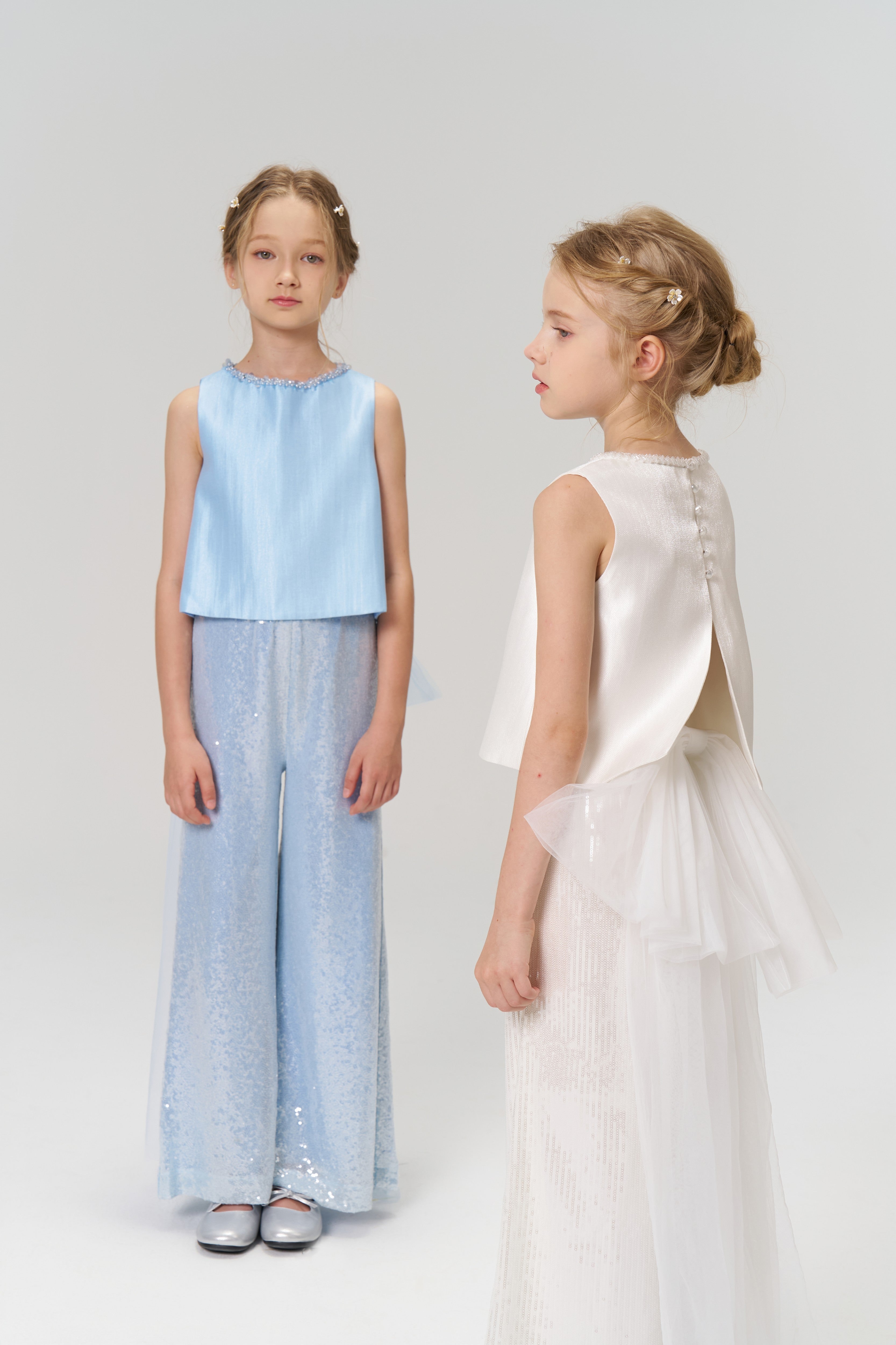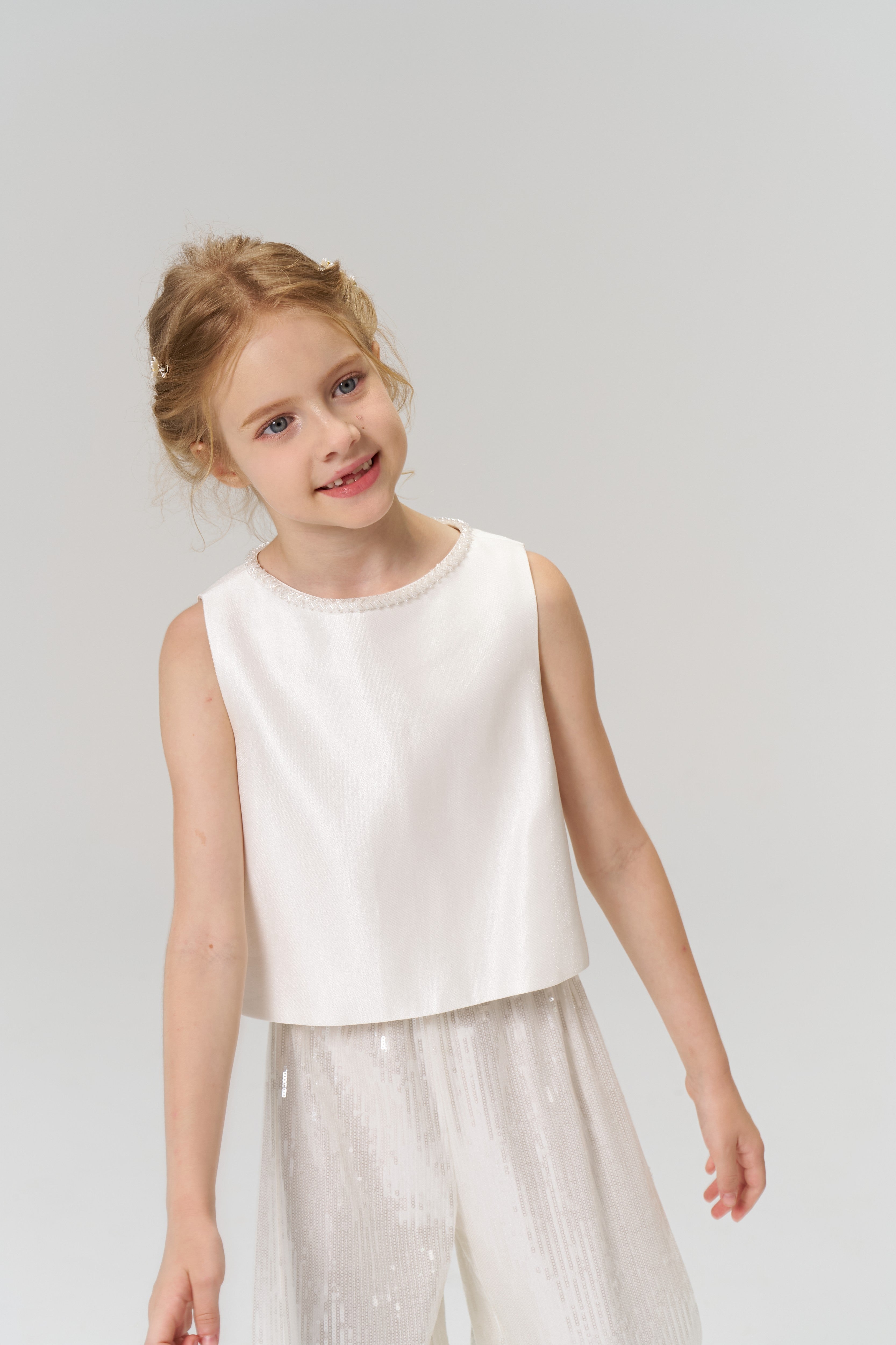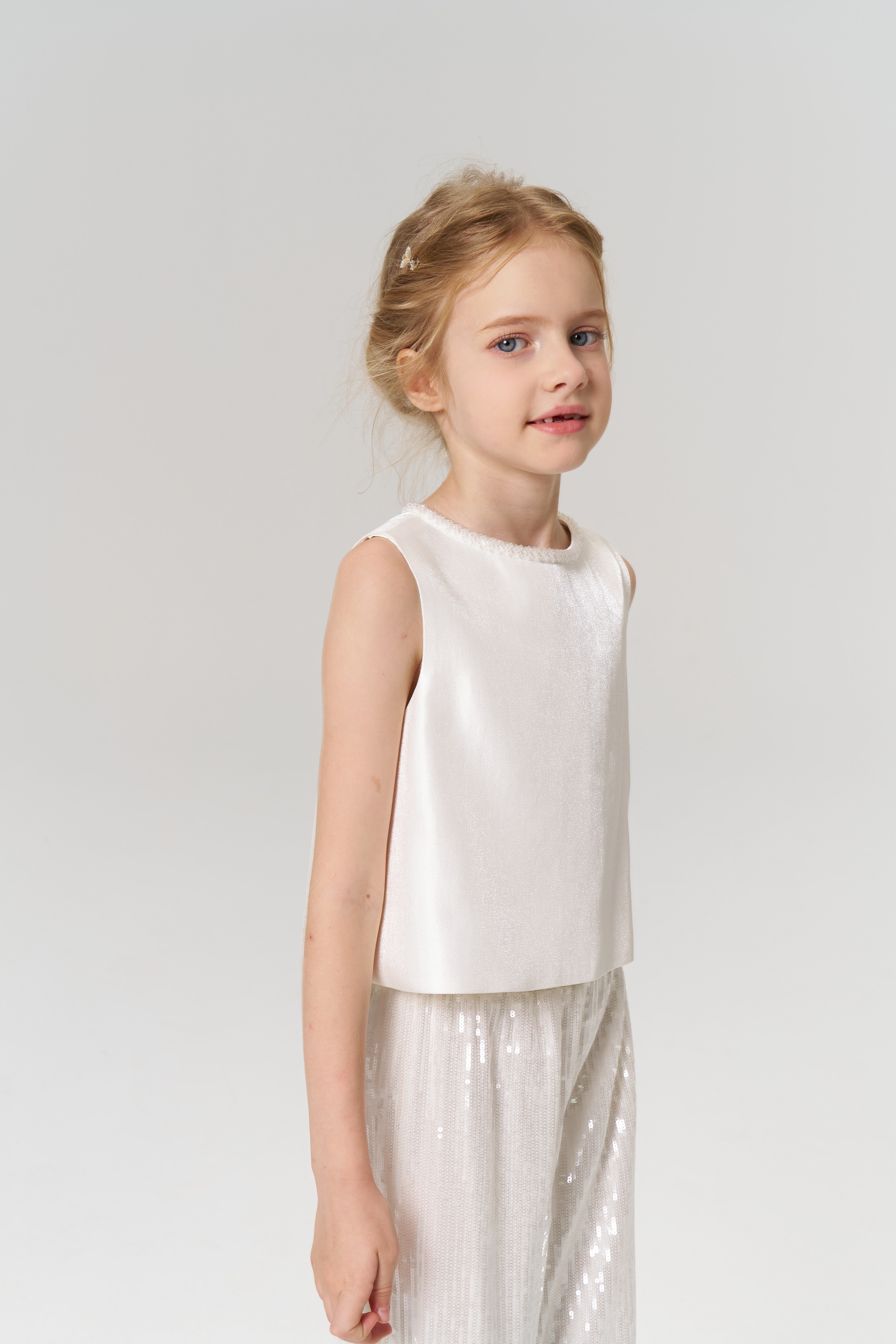 KIKI and JOJO’s Radiance Sequin Wide-Leg Pants, featuring a shimmering finish and fluid silhouette, are displayed against a plain light background. A young girl faces forward in a sleeveless white top, KIKI and JOJO Radiance Sequin Wide-Leg Pants, and silver shoes against a plain light background.