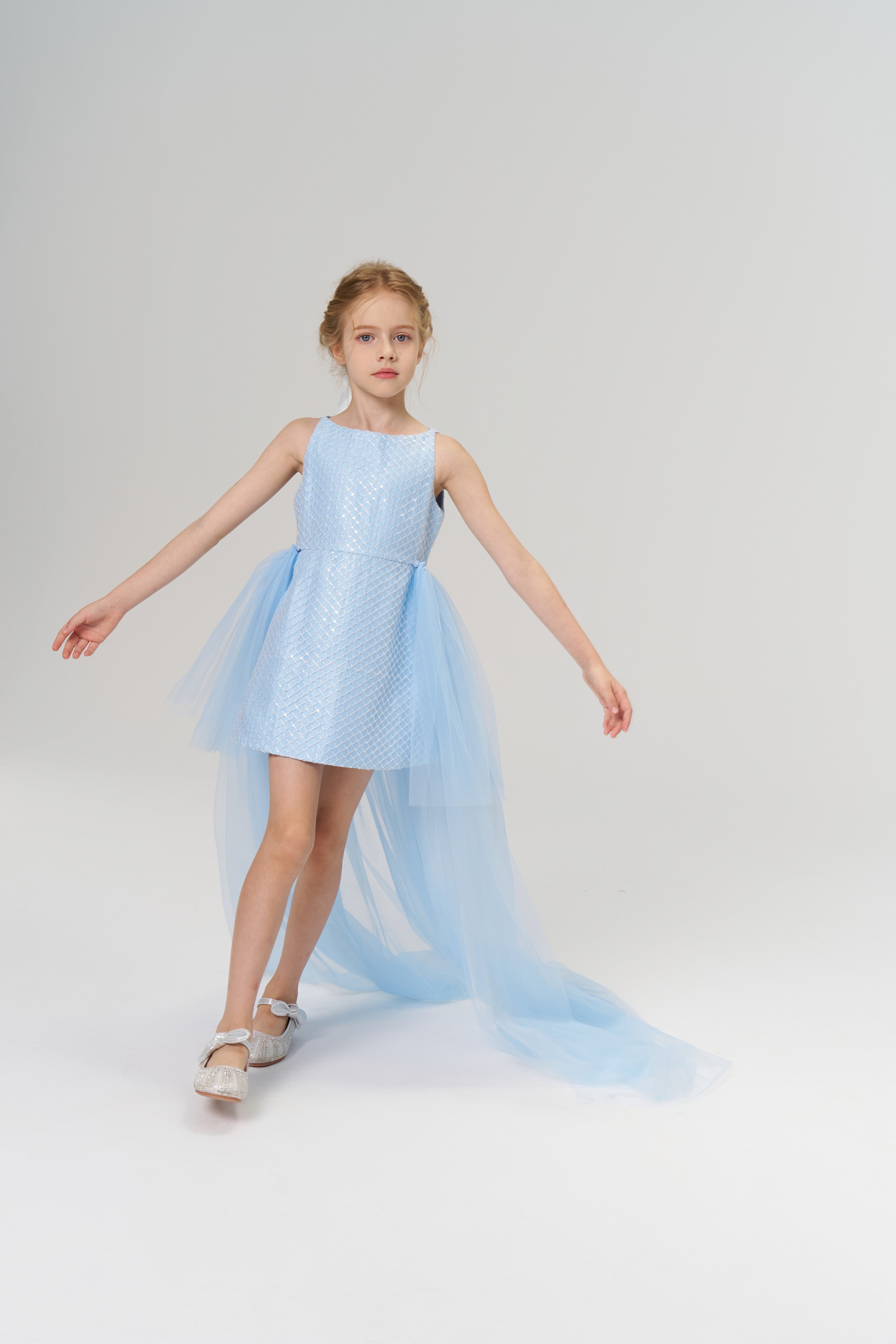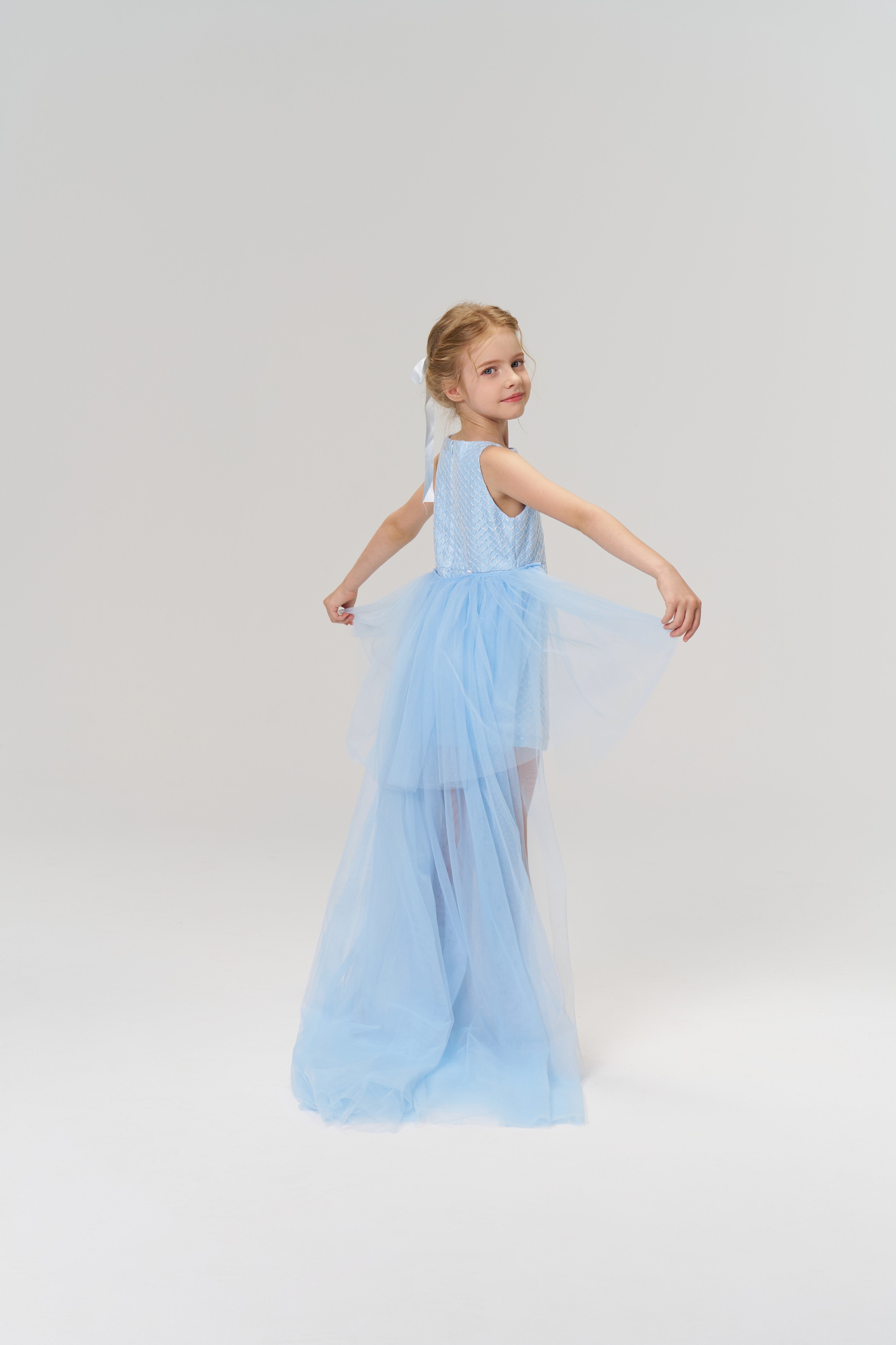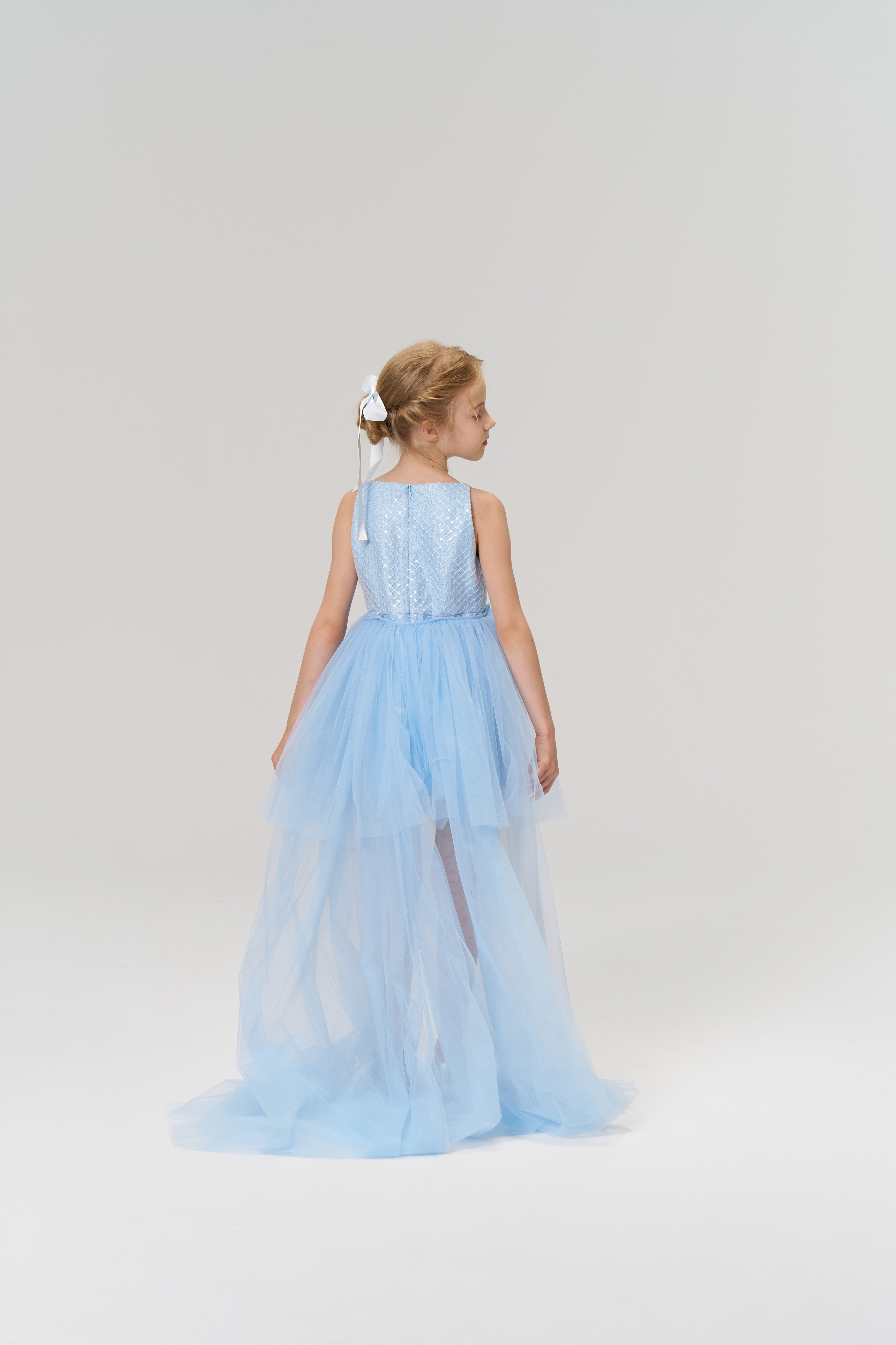 Dry clean recommended. Detach the tulle overskirt before cleaning. Do not machine wash. Do not iron sequins; steam tulle lightly from a distance. Spot clean as needed. Store hanging to preserve shape.