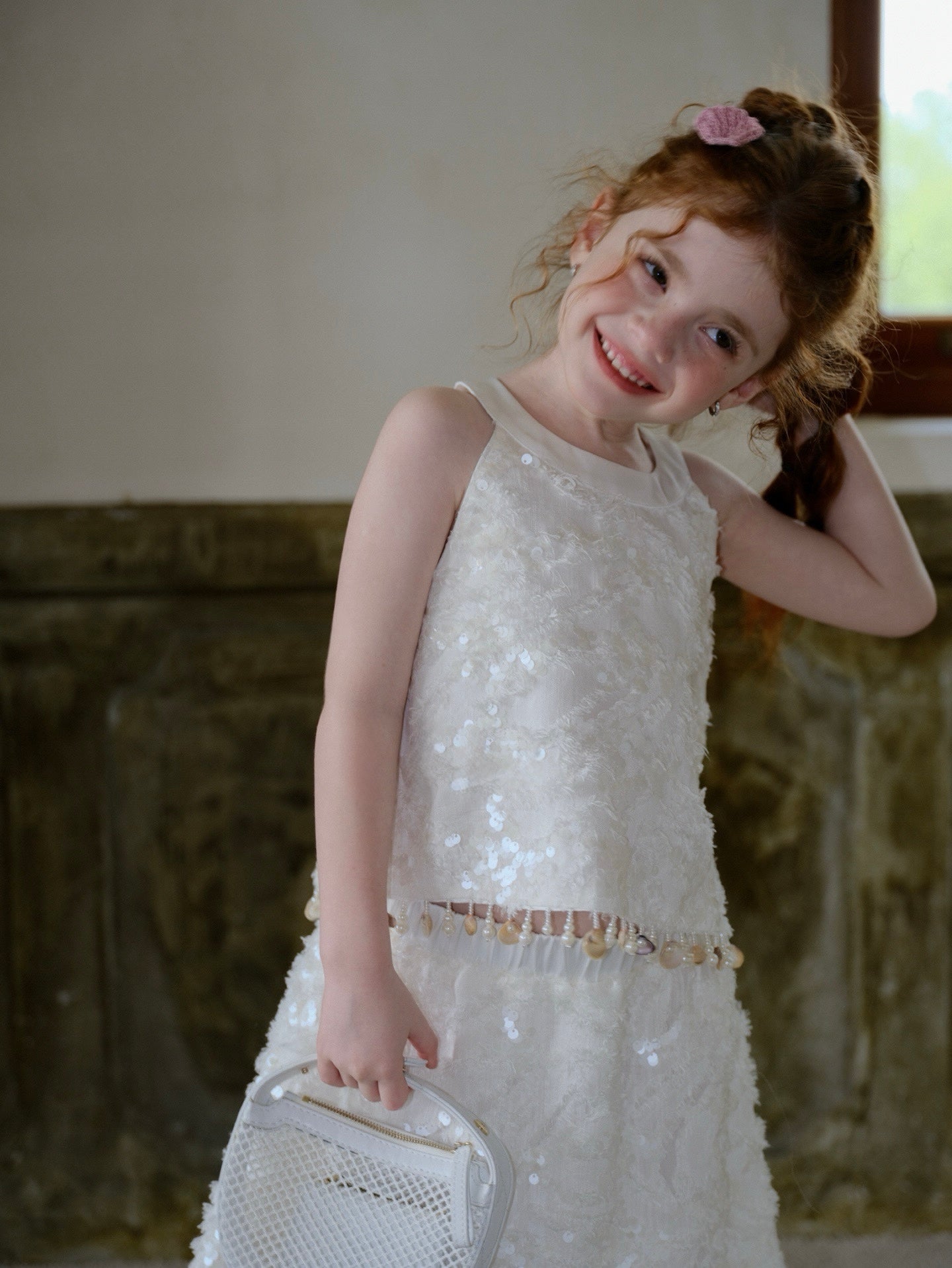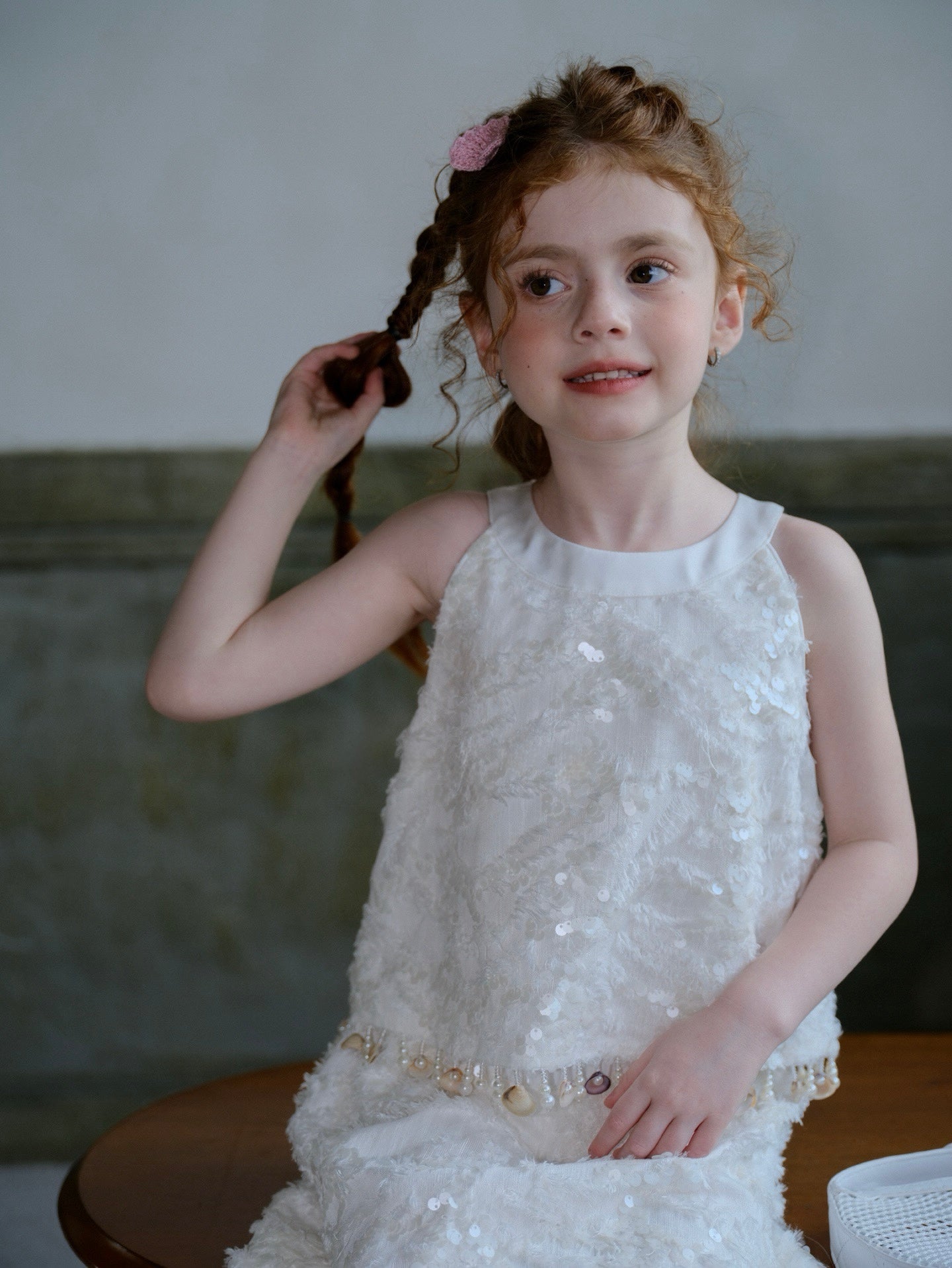 Along the hem, each shell is a naturally formed, one-of-a-kind piece, carefully selected and hand-strung with pearls into delicate embellishments. With every movement, they sway gently—like small keepsakes gathered along the shoreline—bringing a sense of quiet luxury and individuality to the piece.