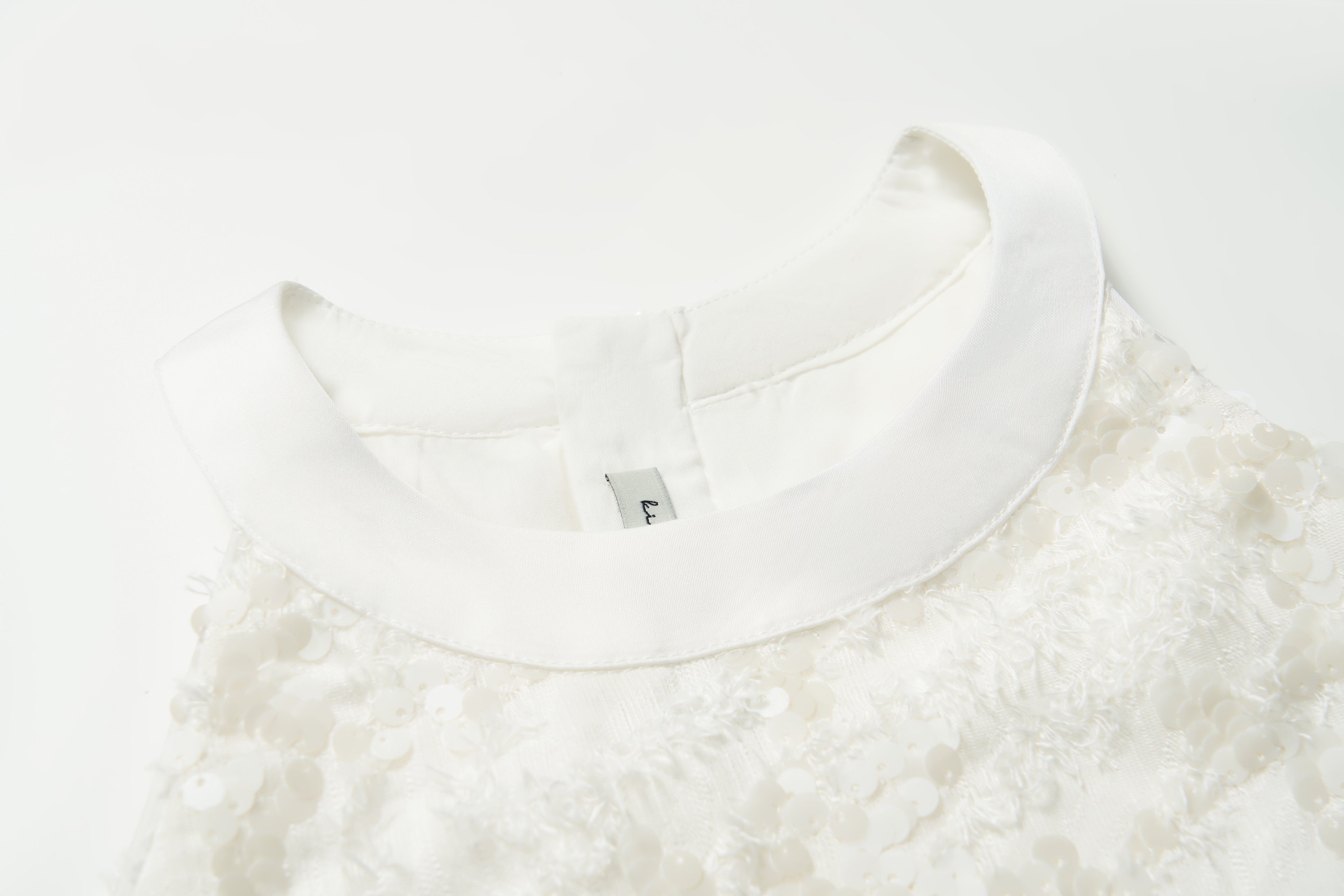 Crafted in a soft ivory tone, this top features a delicately textured surface with subtle sequin detailing that catches the light with an understated glow. The silhouette is clean and refined, offering a modern, elevated feel while remaining light and easy to wear.