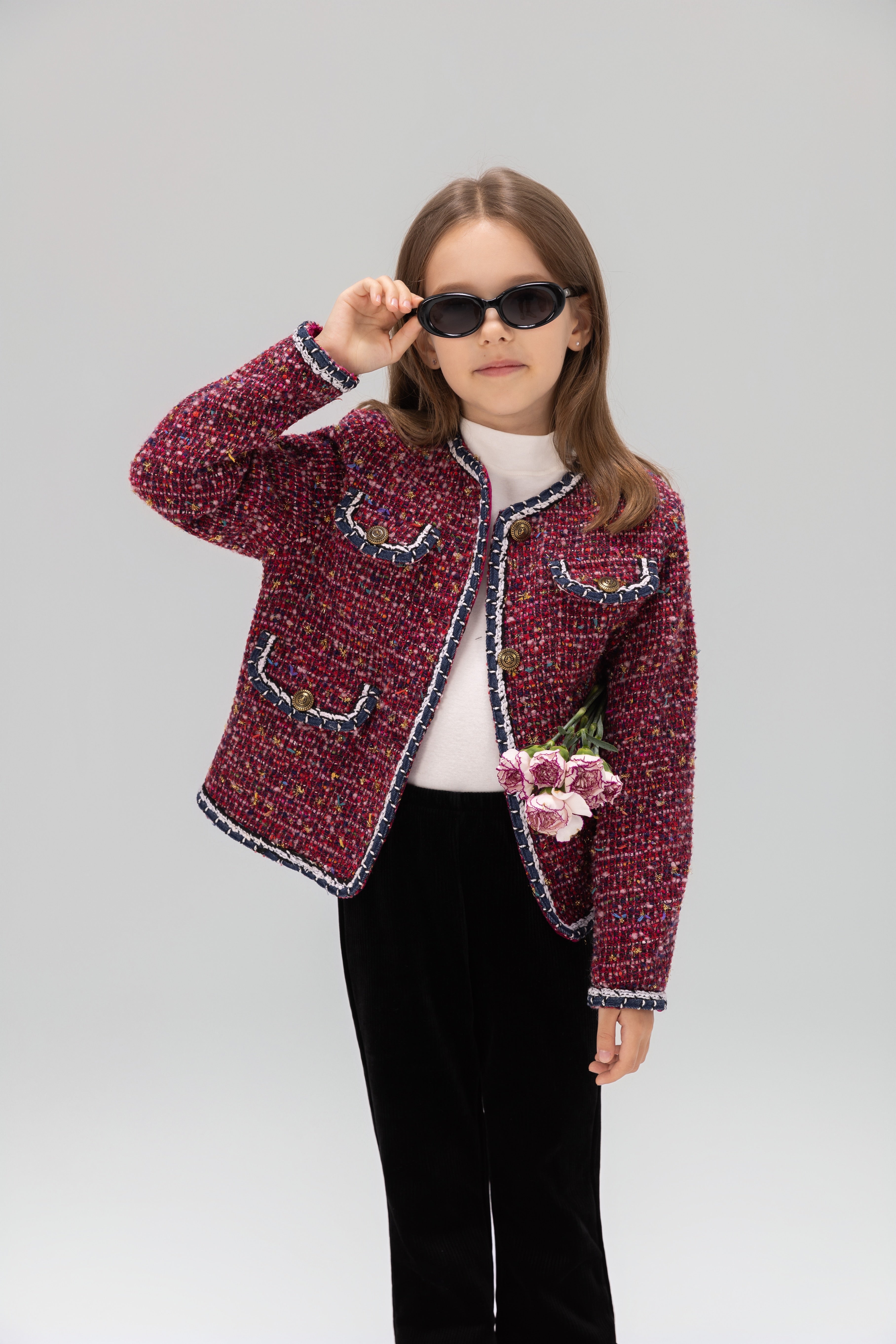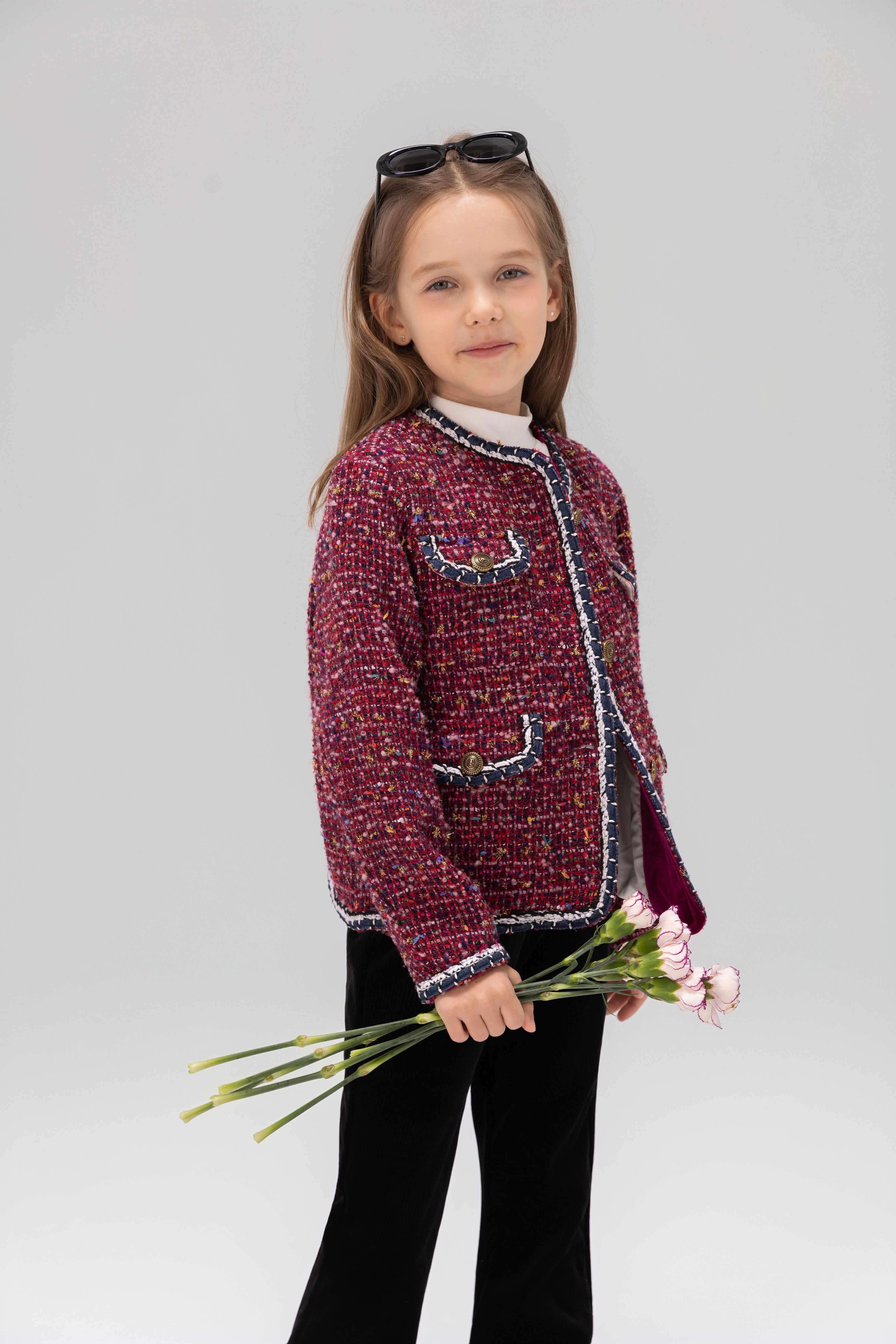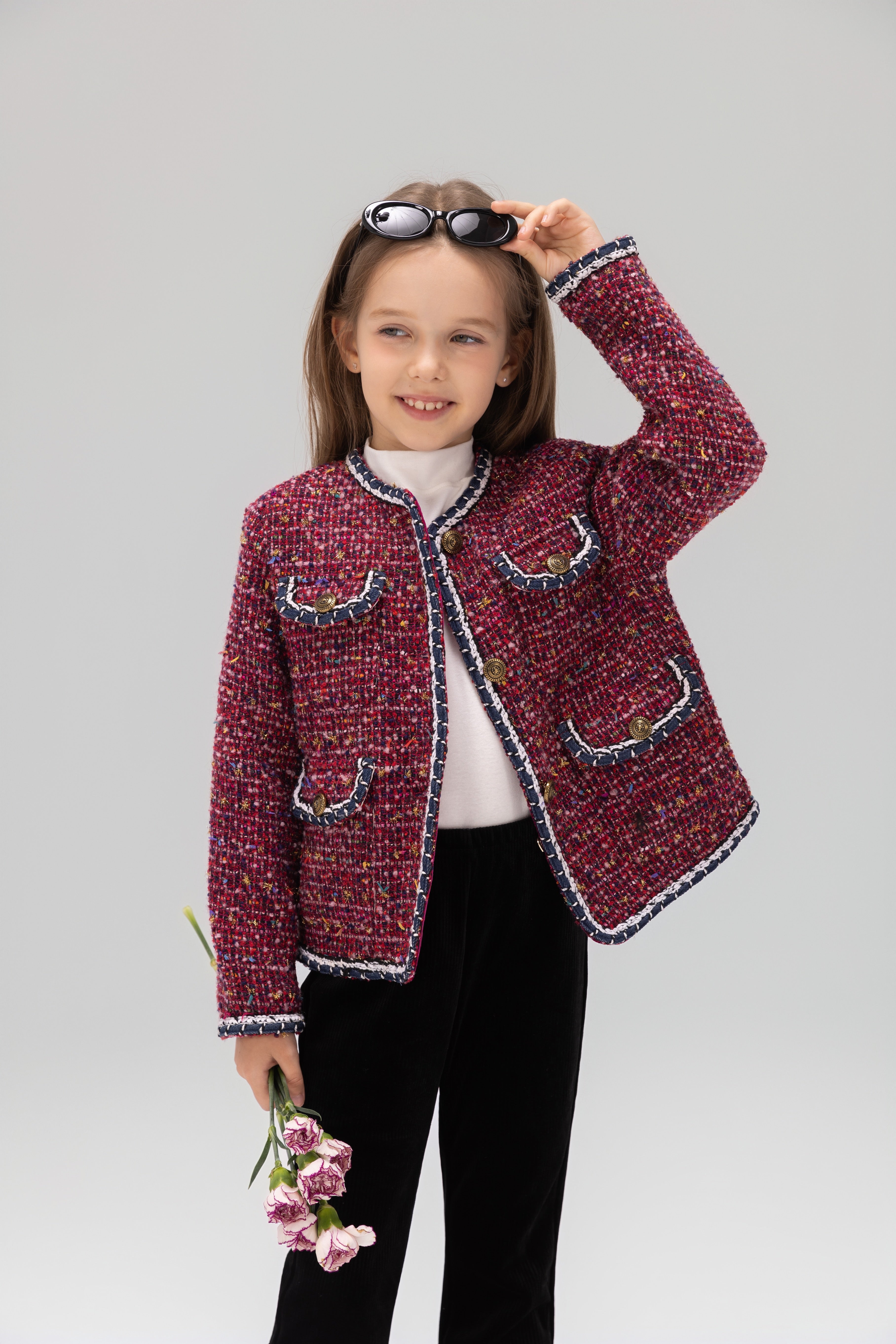 Vintage charm with runway color. This girls tweed jacket mixes vibrant berry reds and magentas with a soft shimmer for a standout, picture ready layer.