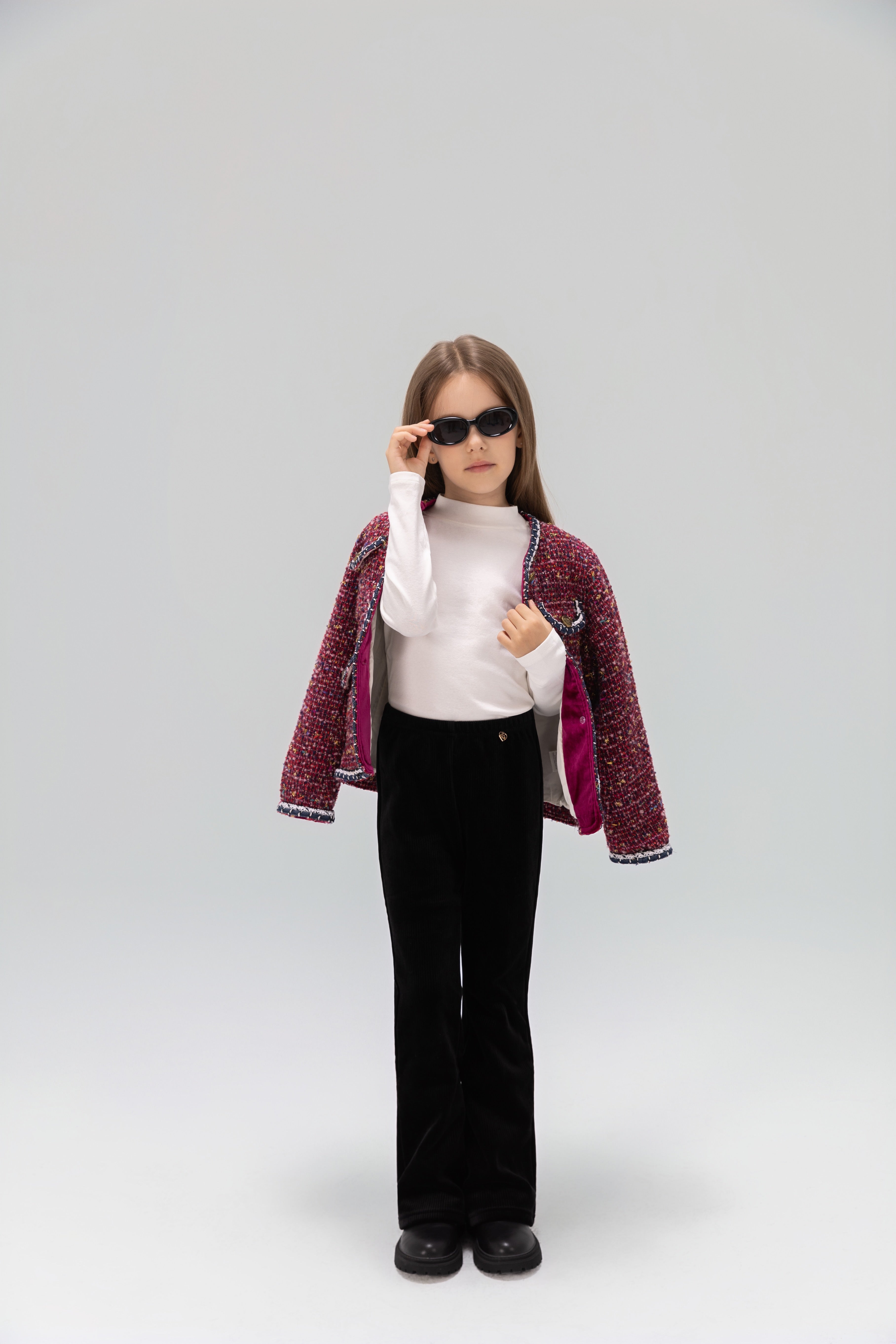 • Fabric & color: Textured multiblend tweed with berry tones and subtle metallic sparkle