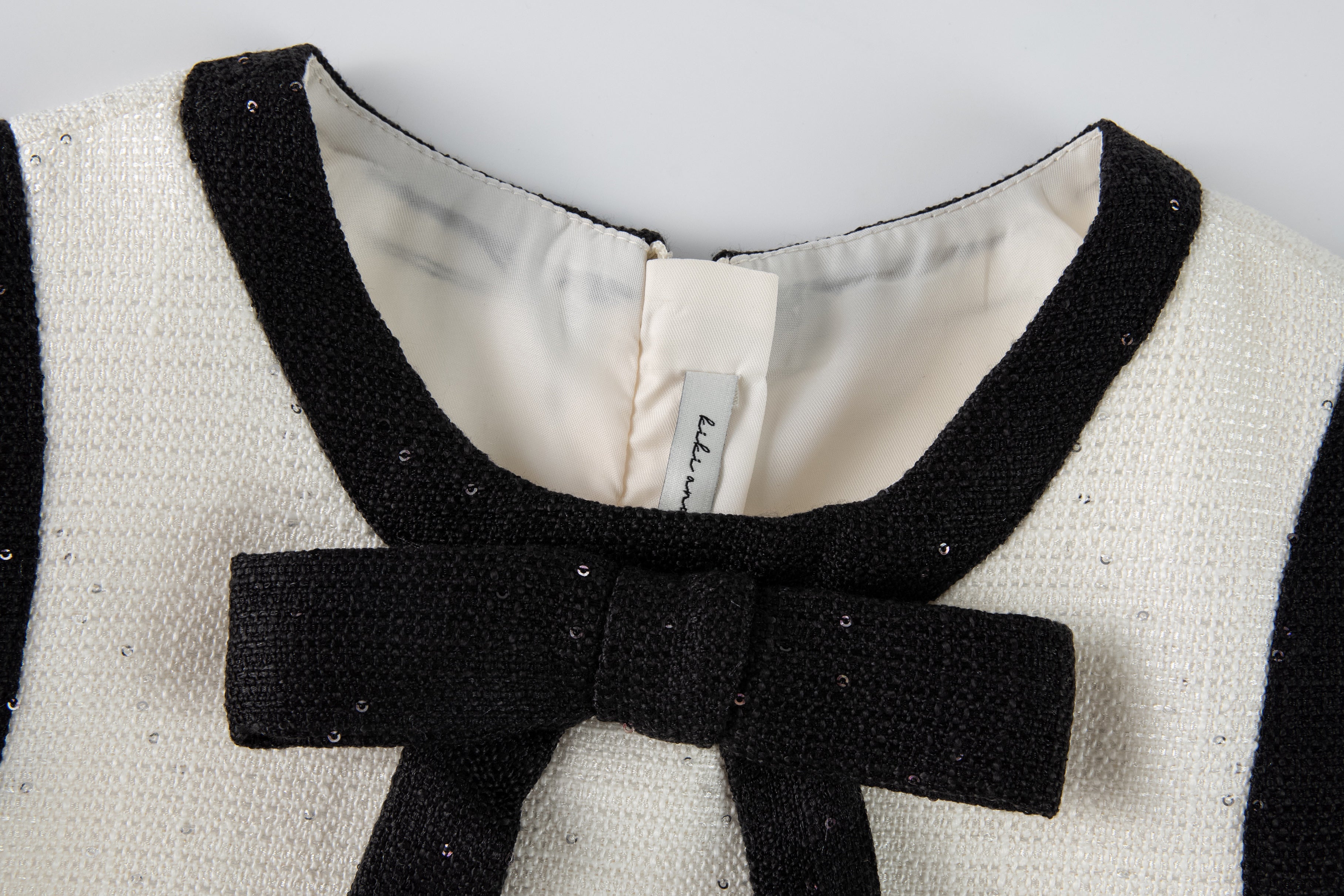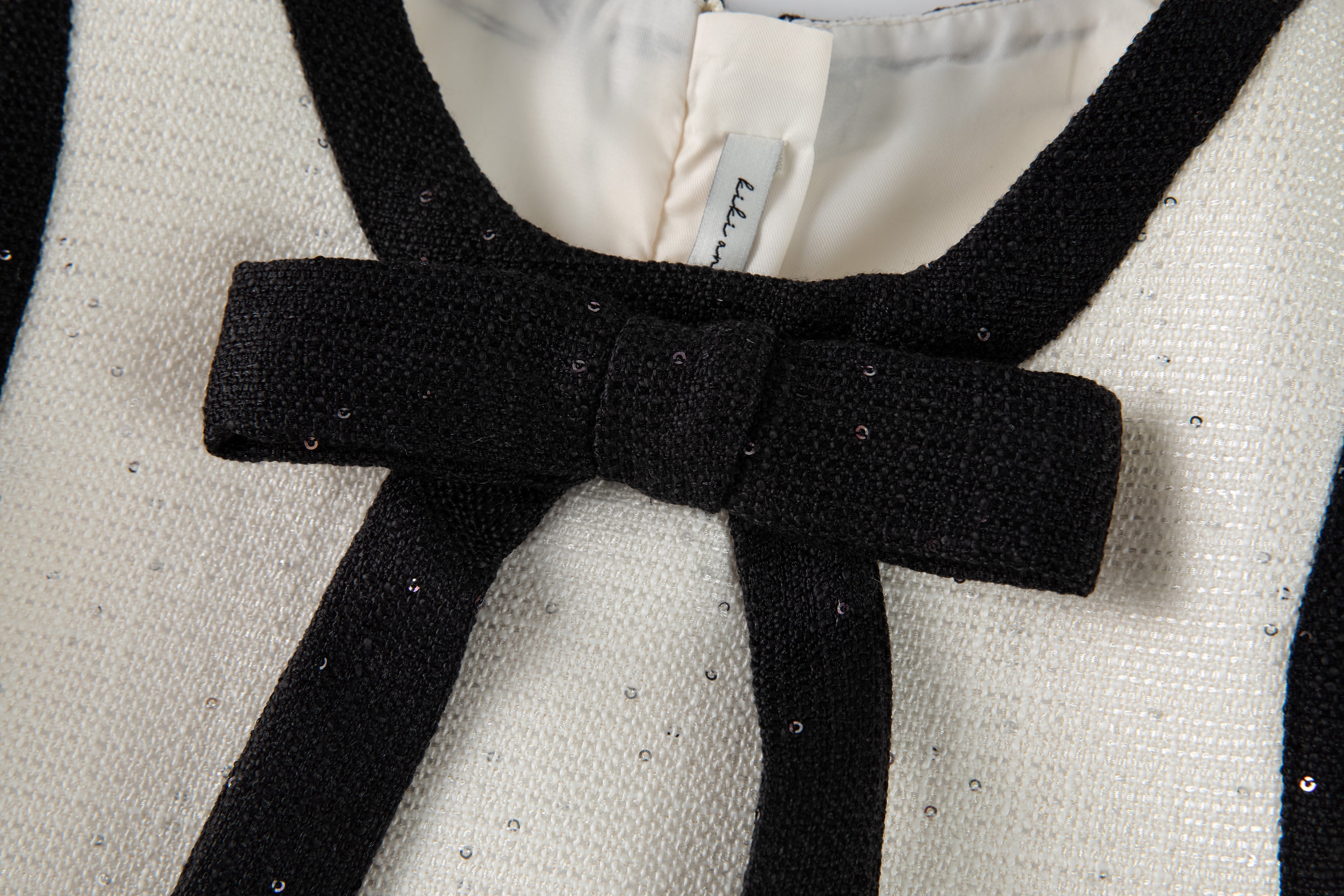 • Signature bow: Fixed black sequin bow at the neckline with long tails