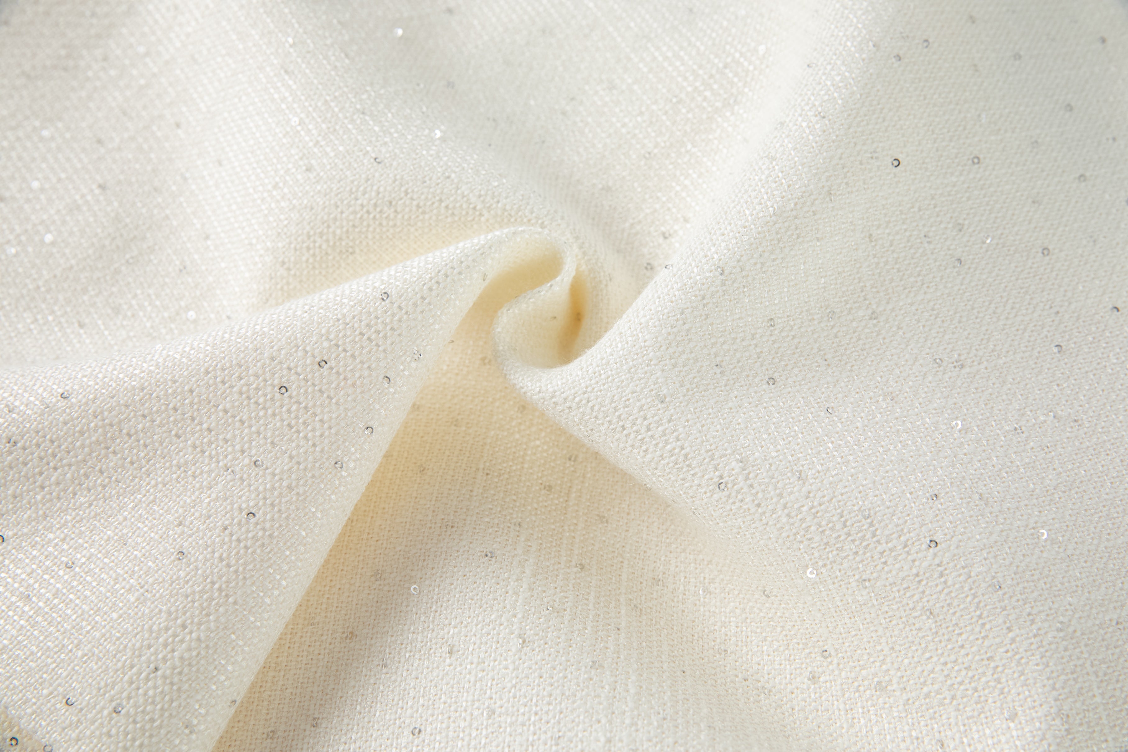 • Refined trim: Black sequin trim at the collarless neckline and pocket edges