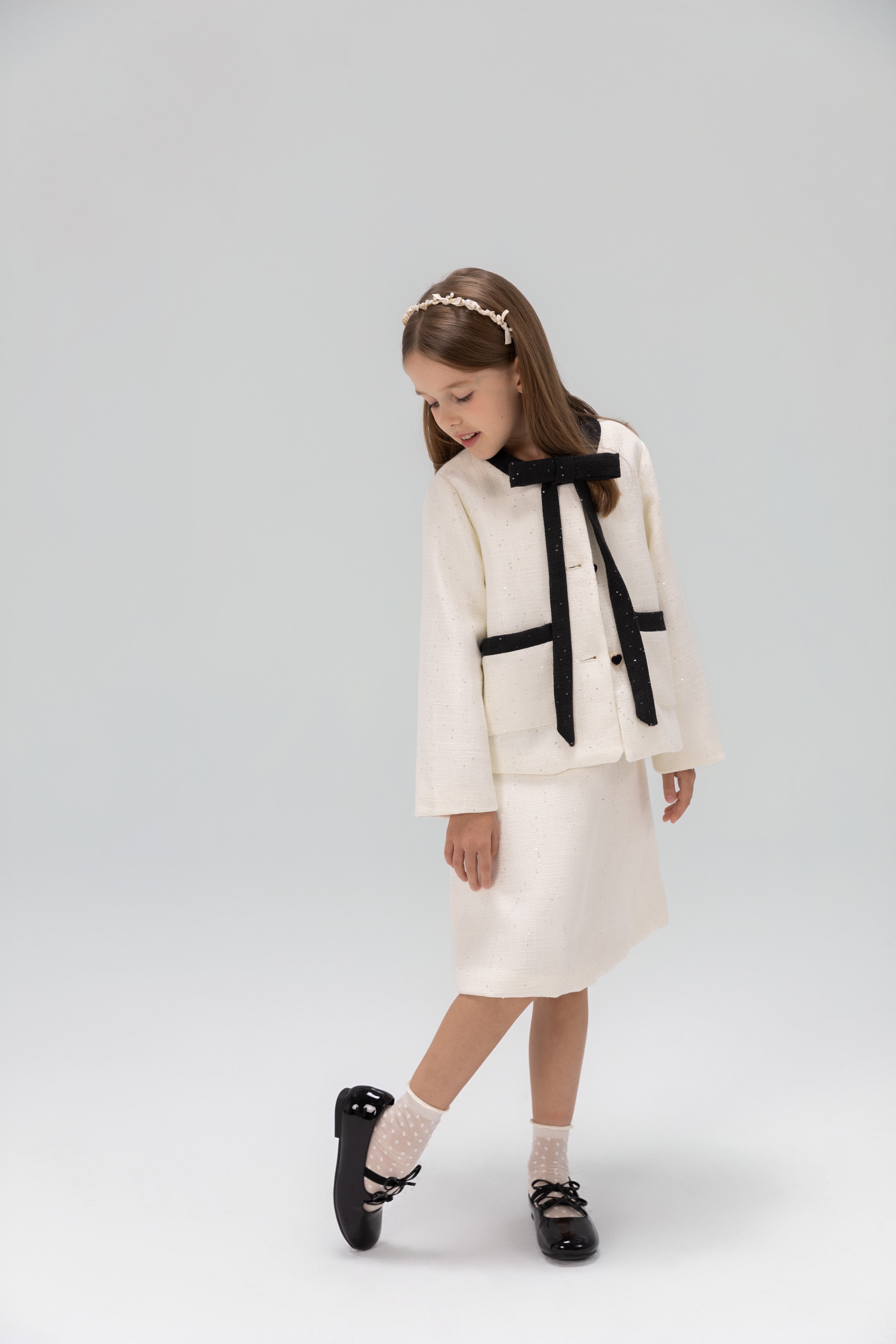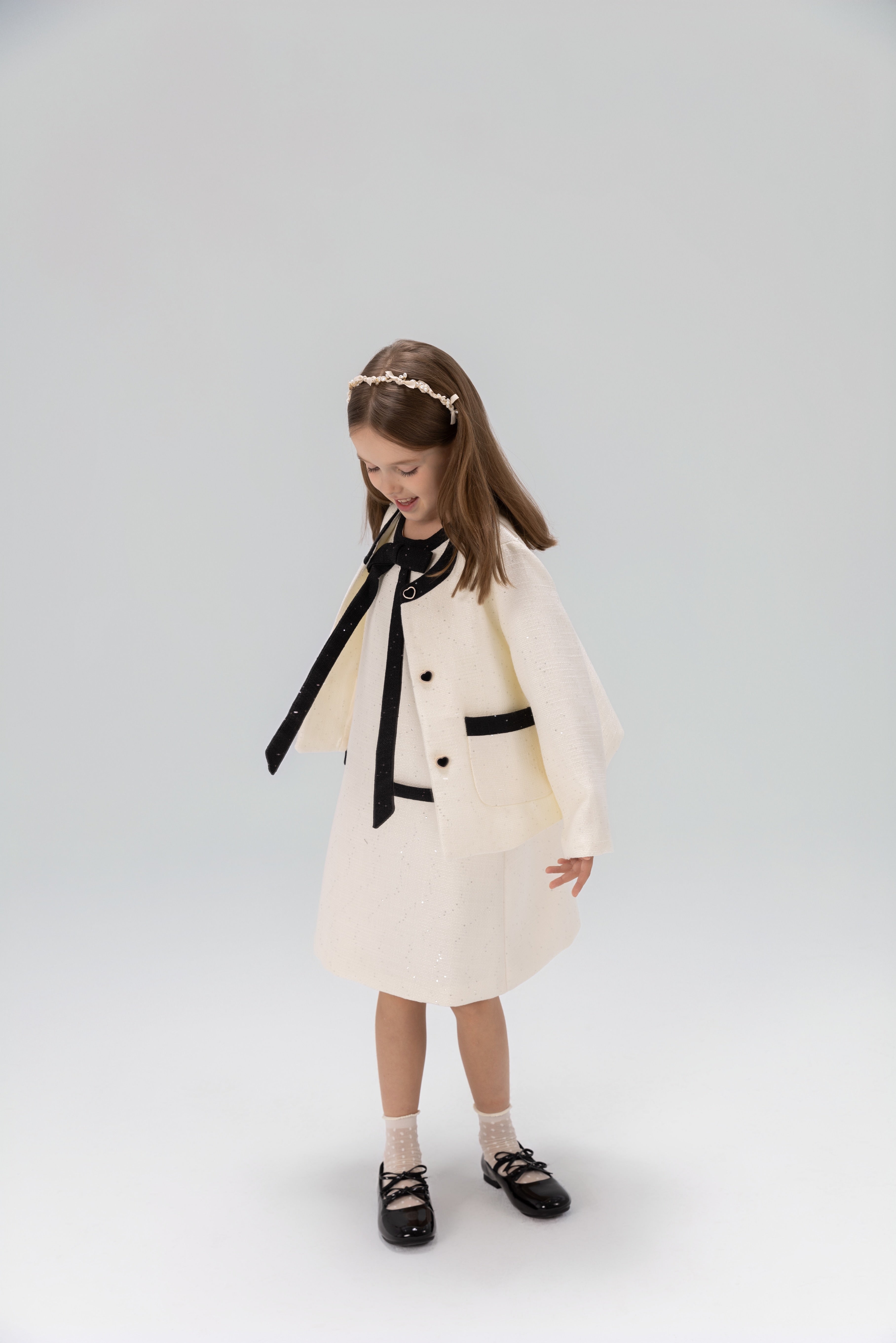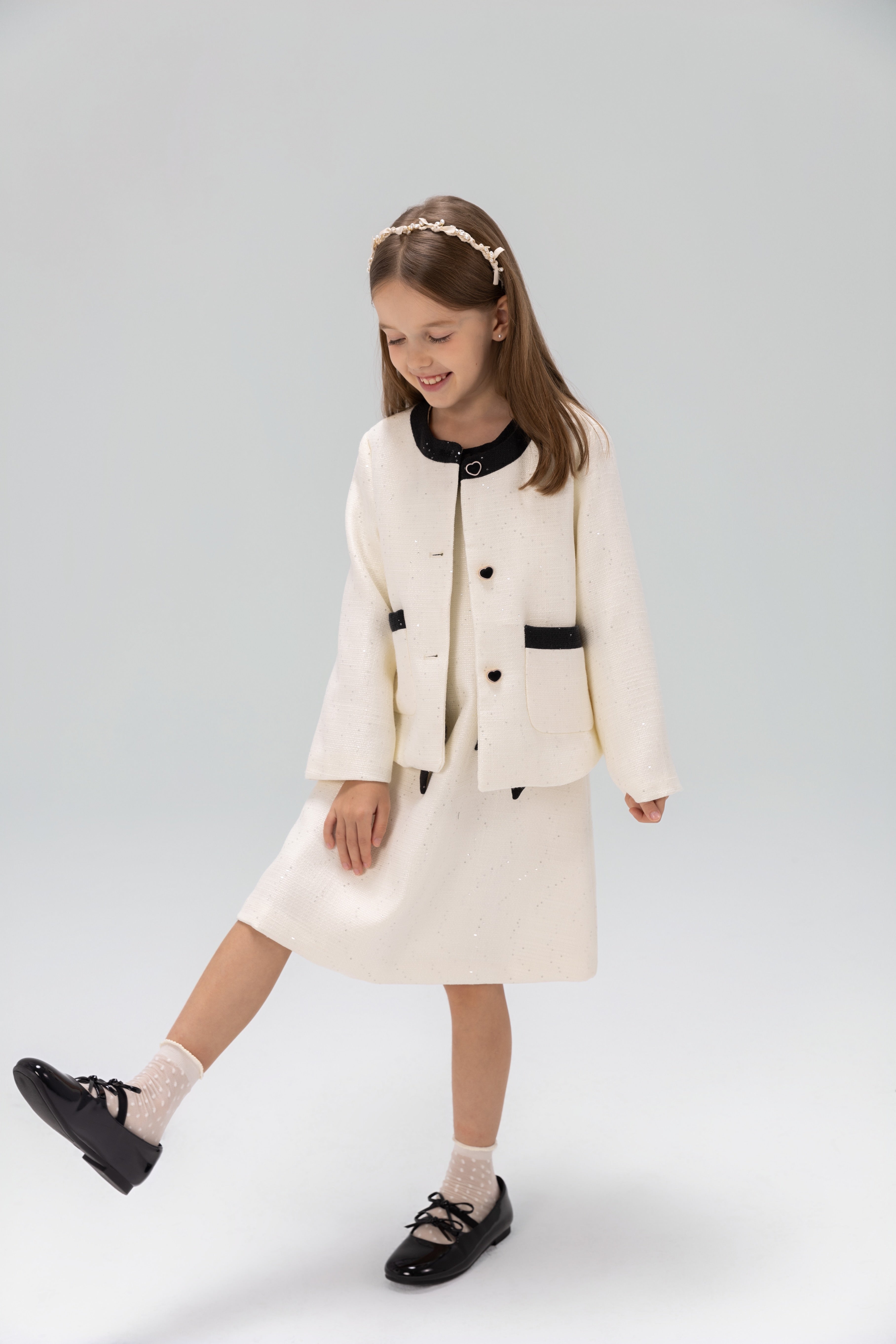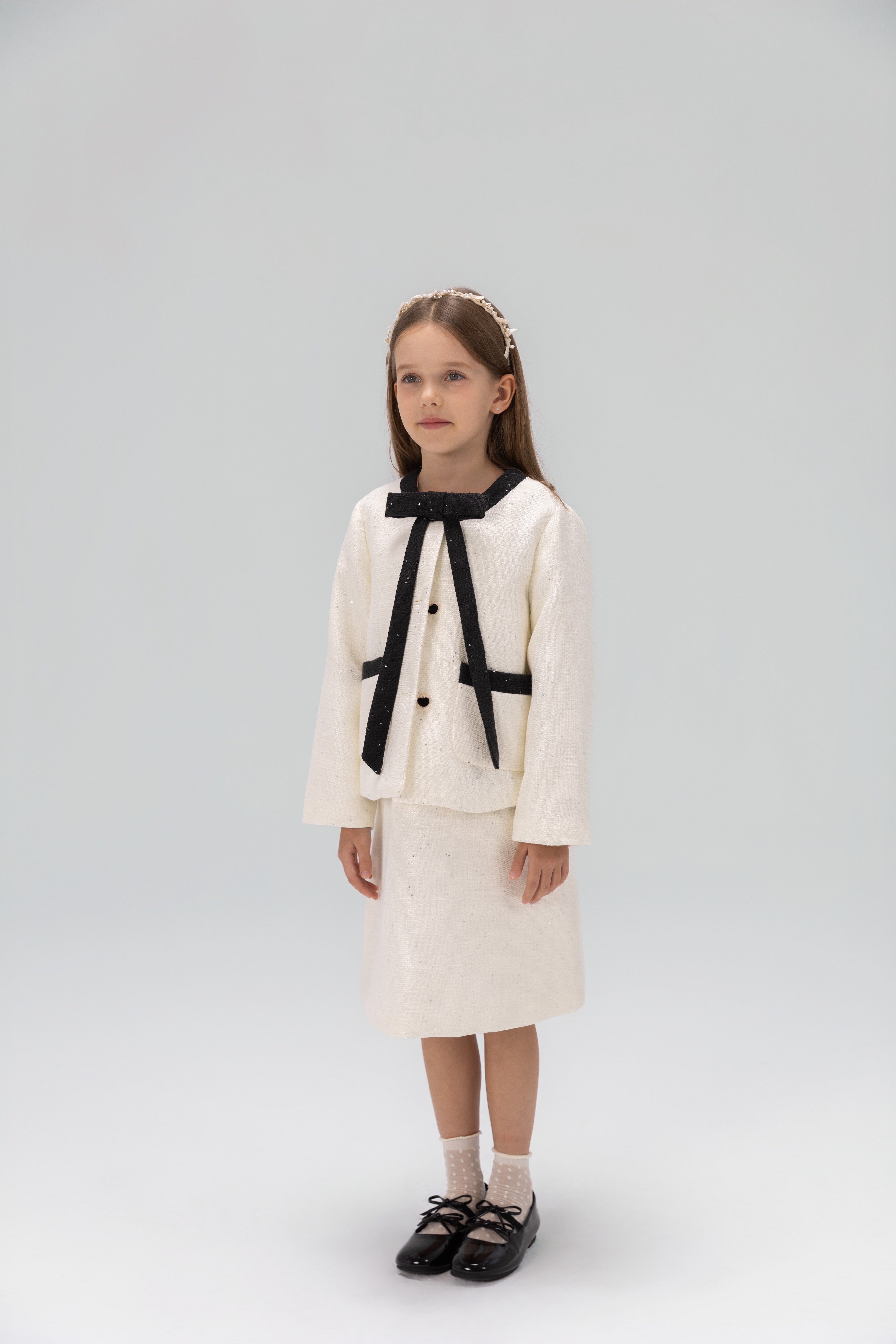 Timeless and picture ready. This girls tweed companion jacket pairs refined ivory with black sequin accents for a chic French-inspired look. Layer over the matching dress or style with her favorite outfits for holidays, portraits, school events, and special celebrations.