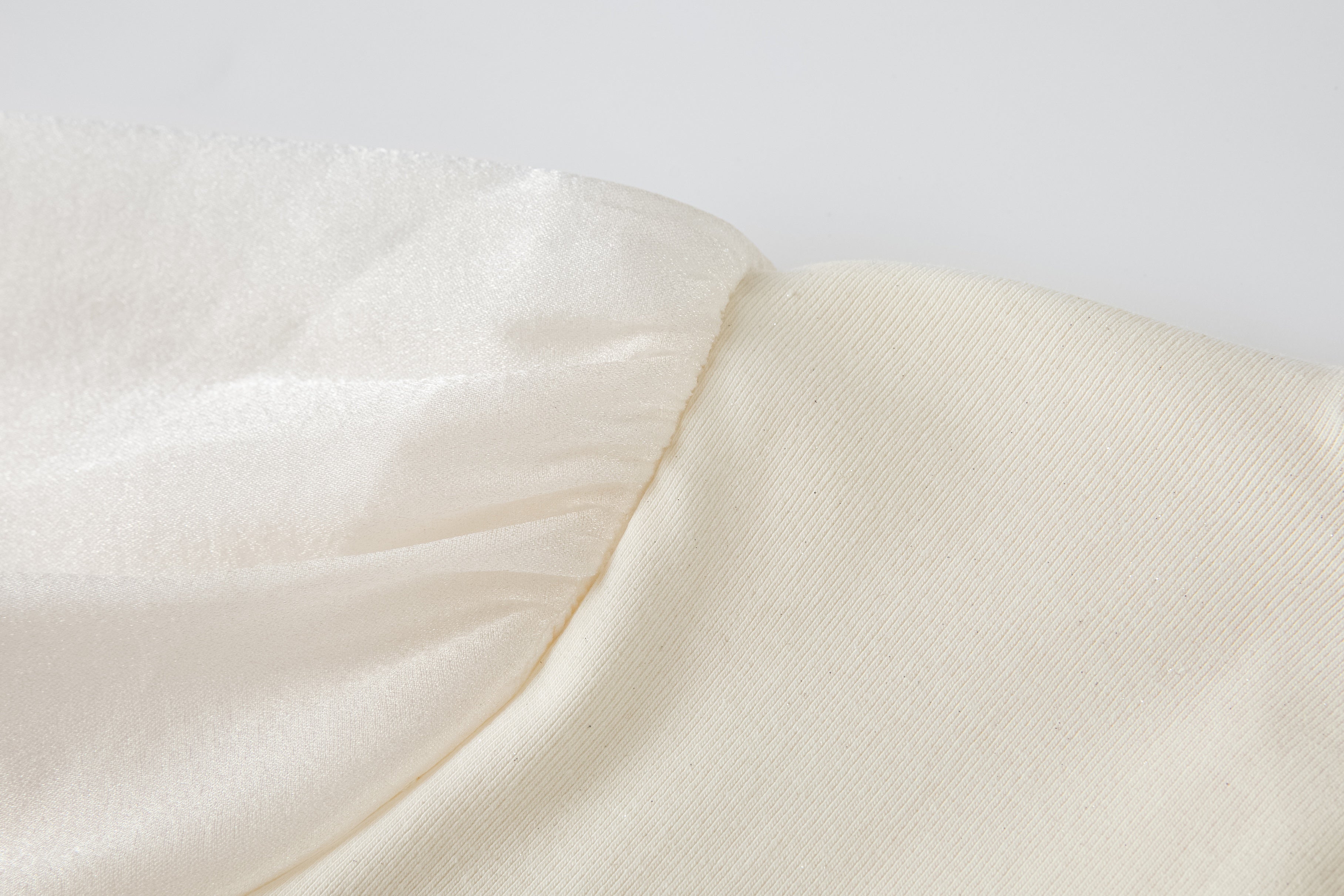 • Sleeves: Gathered sheer puff sleeves with elastic ruffle cuffs
