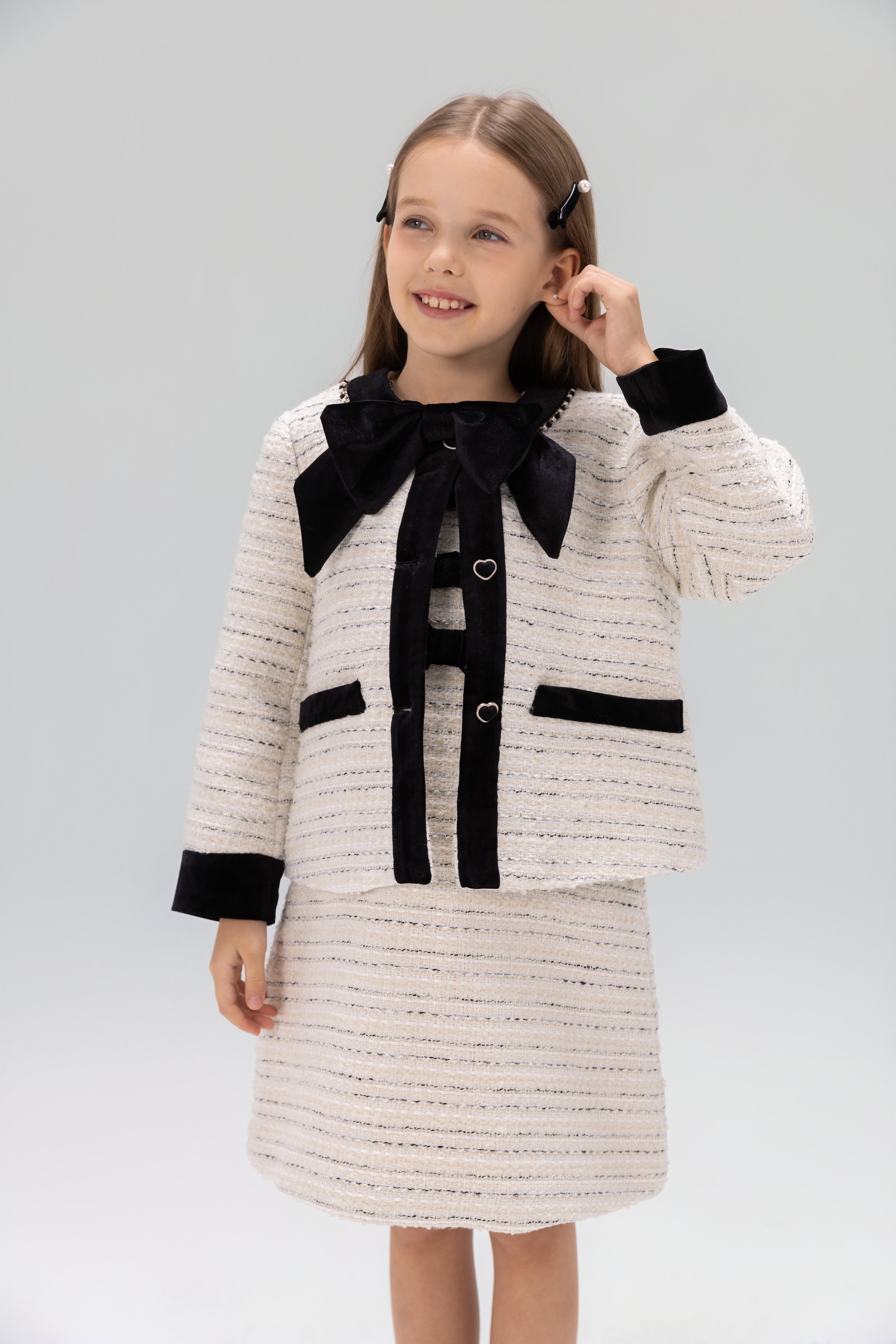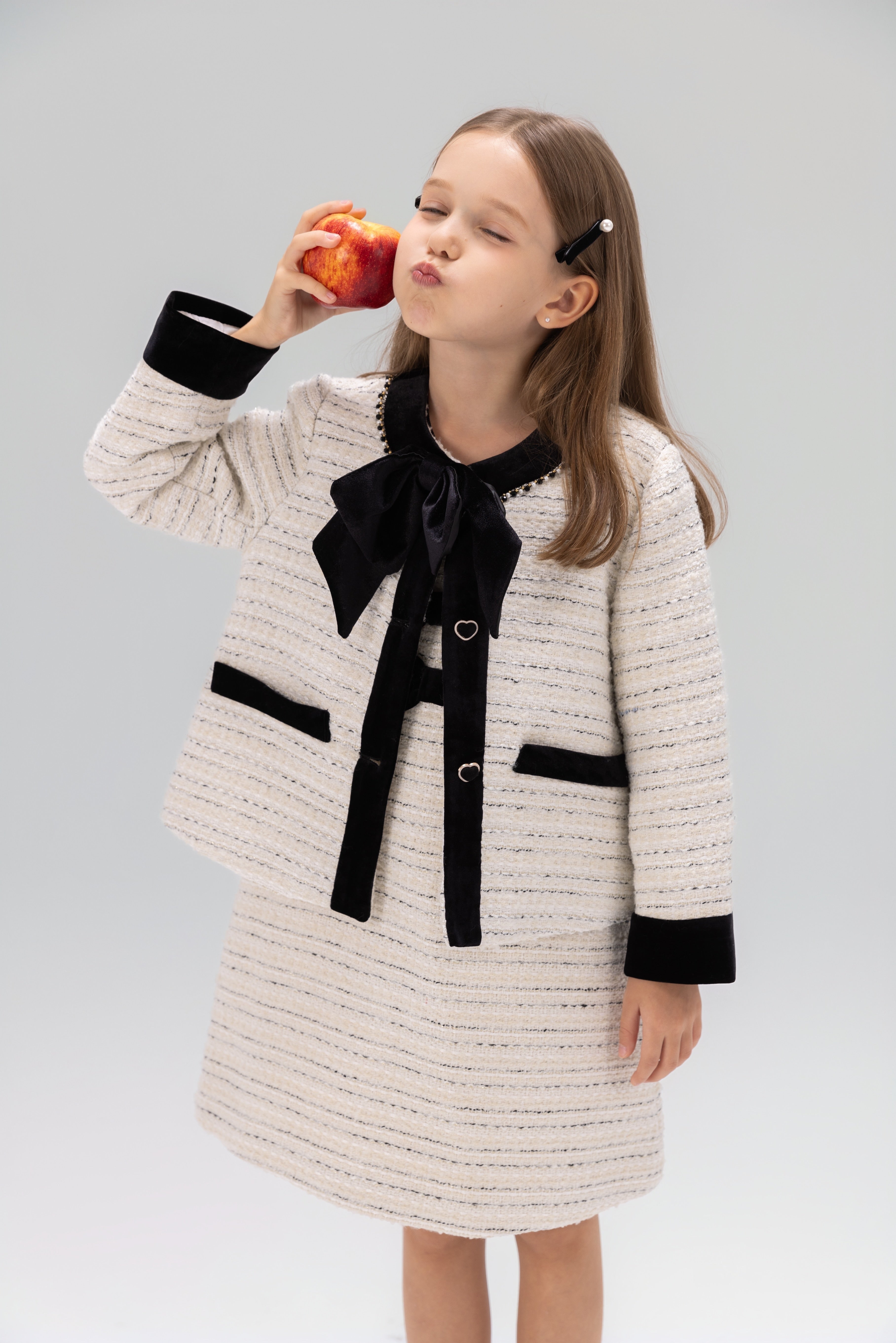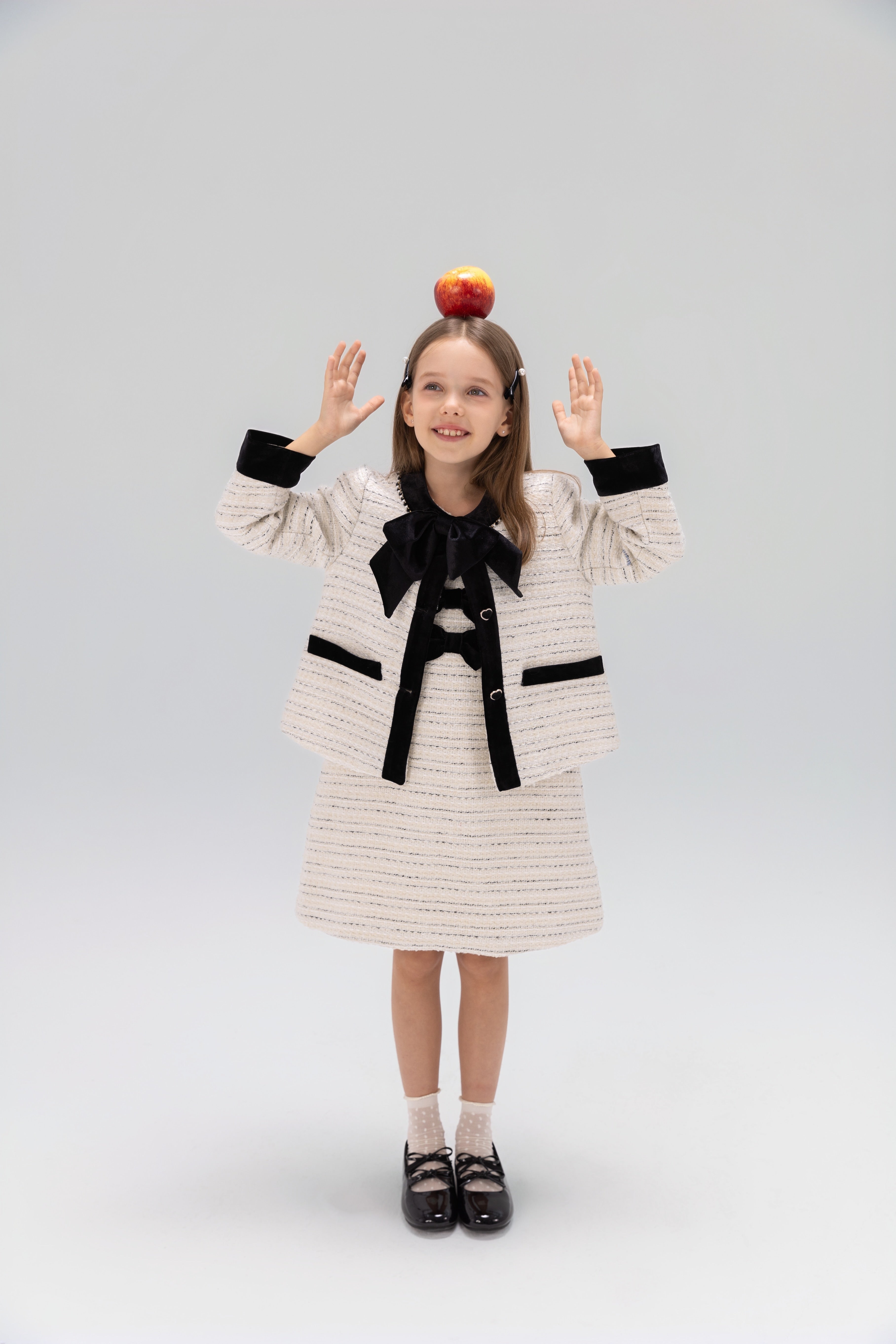 A polished girls tweed jacket with plush velvet accents and a touch of sparkle. The classic black and white weave is elevated with a detachable velvet bow brooch, a beaded-trim neckline with champagne glimmer, and custom velvet heart buttons. Perfect for photos, recitals, parties, and effortless everyday layering.