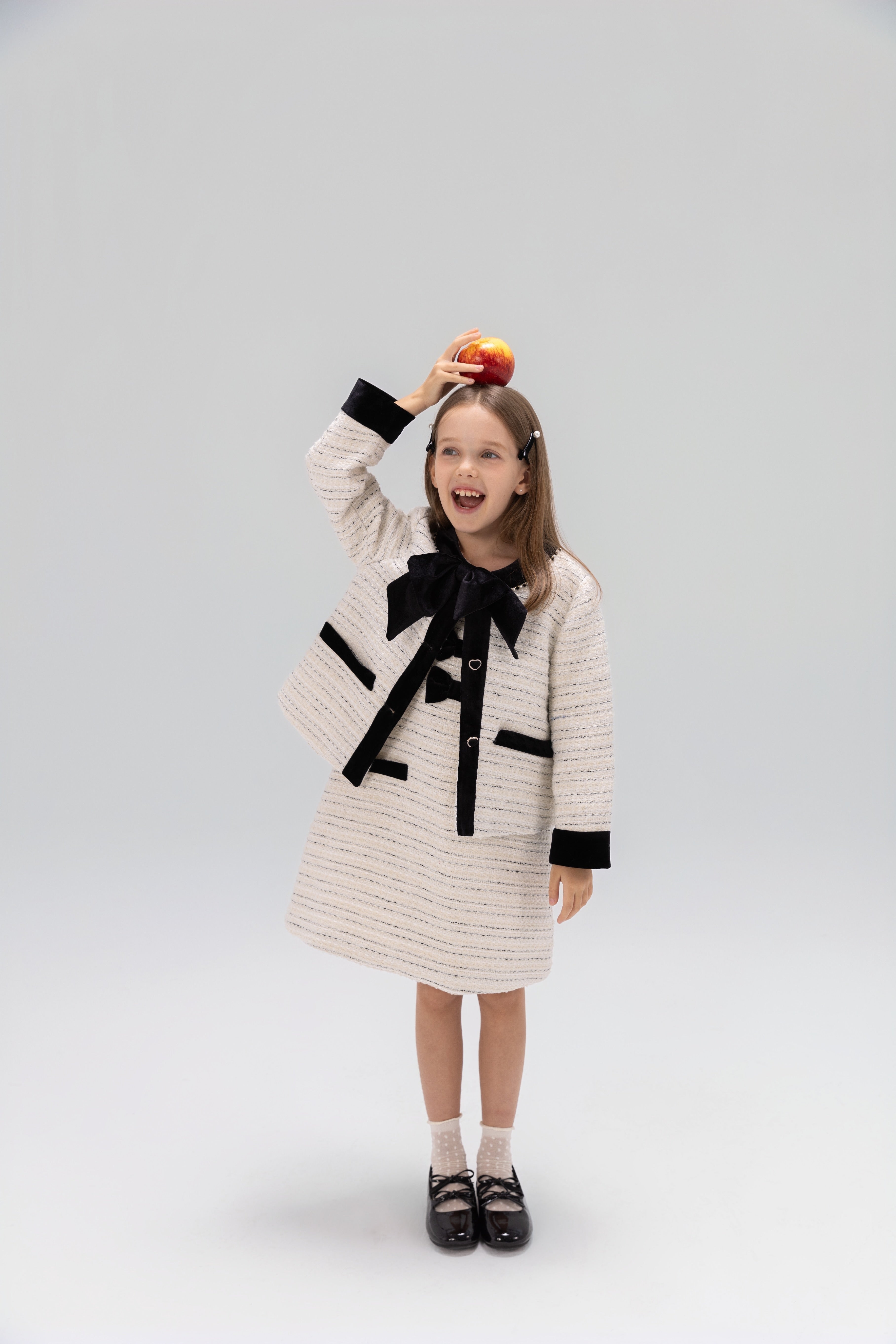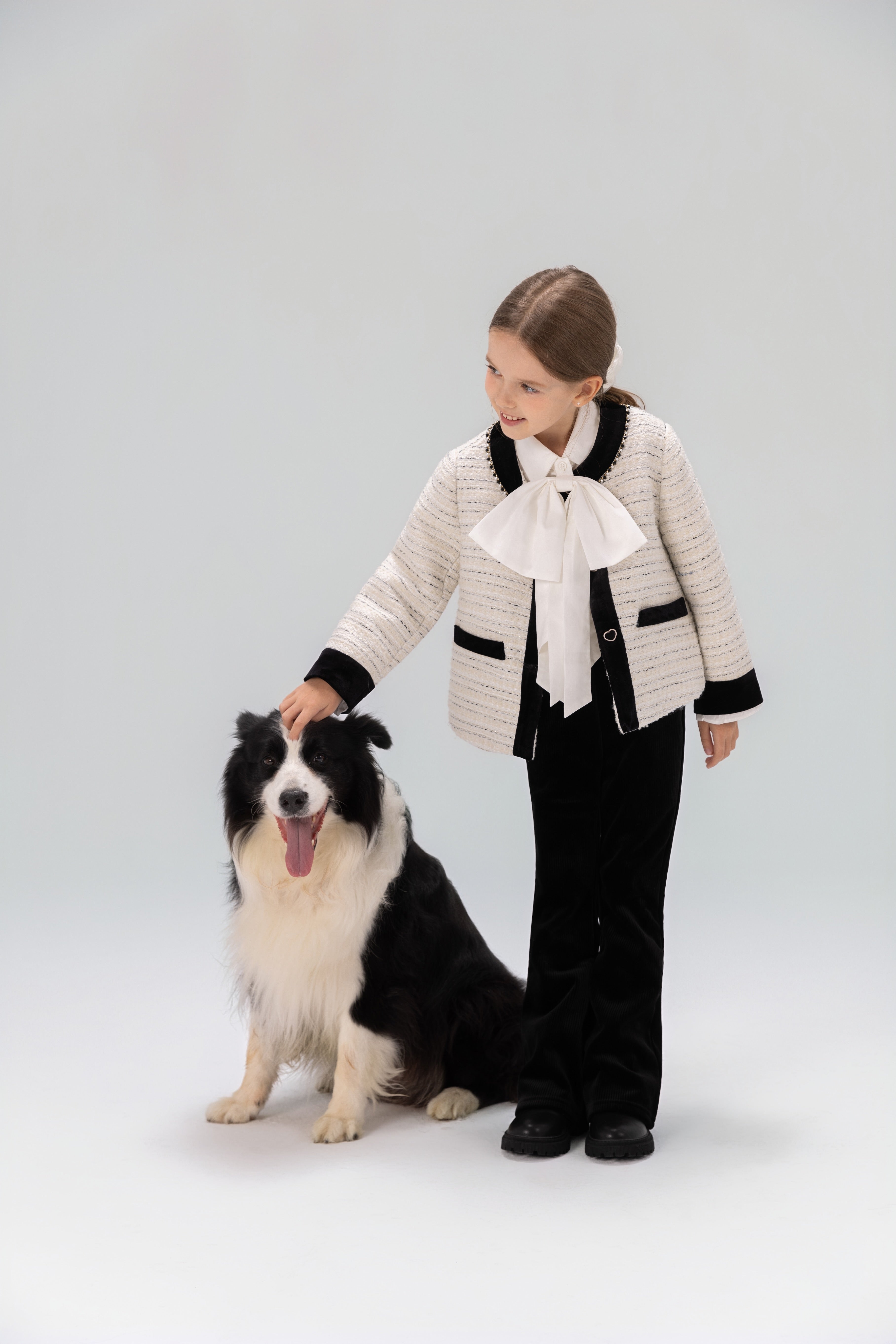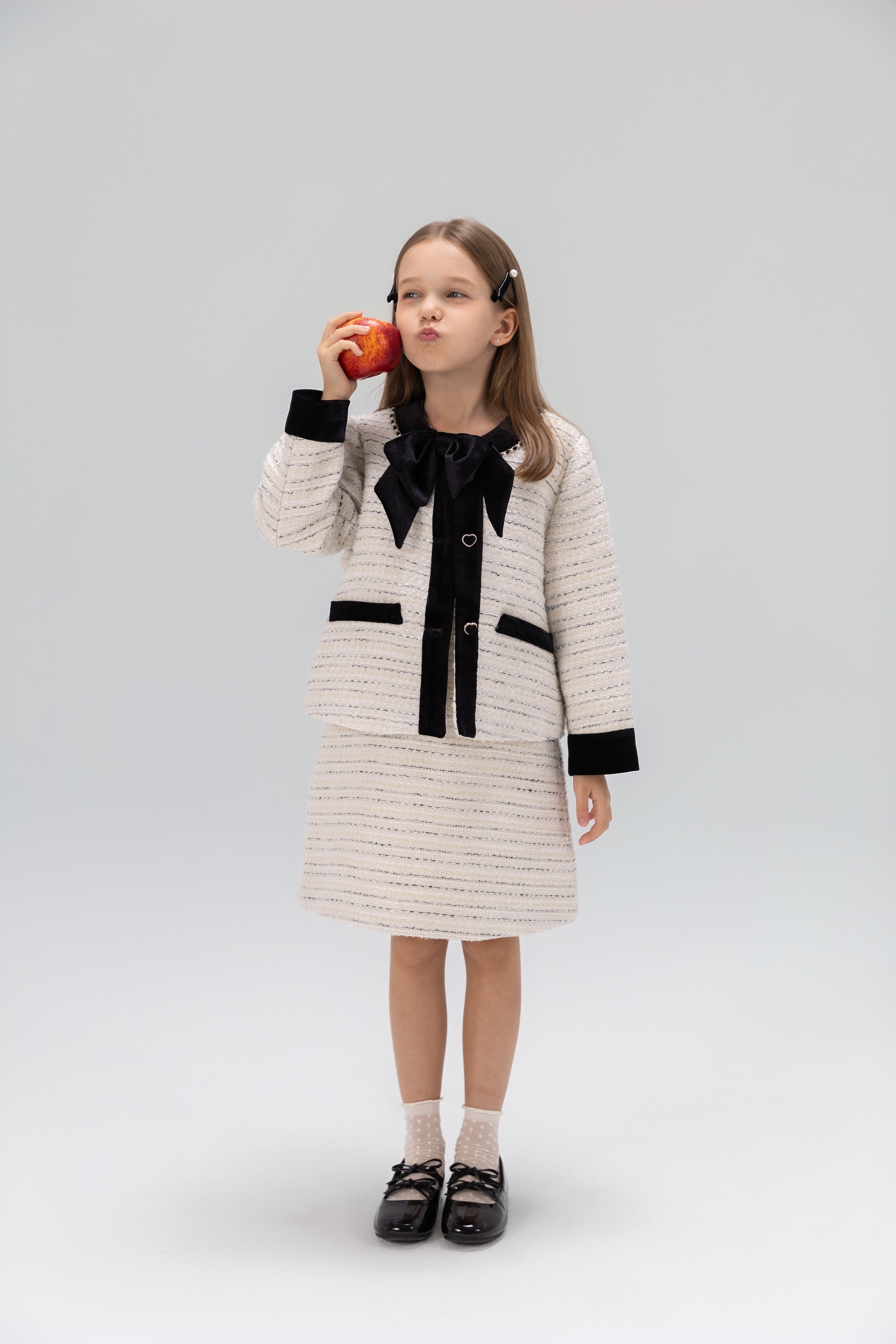 A polished girls tweed jacket with plush velvet accents and a touch of sparkle. The classic black and white weave is elevated with a detachable velvet bow brooch, a beaded-trim neckline with champagne glimmer, and custom velvet heart buttons. Perfect for photos, recitals, parties, and effortless everyday layering.
